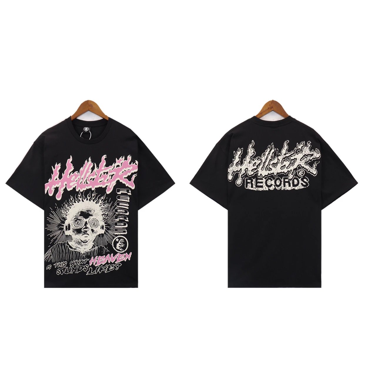 Black Hellstar T-shirt featuring vibrant pink and blue flame graphics on front and '1996 Online' pixel-art design on back. Combines retro gaming aesthetics with edgy streetwear style.