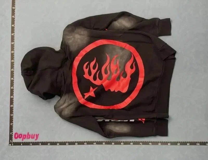 Bold black long-sleeve shirt from Hellstar featuring striking white star graphics on sleeves and chest logo. Perfect for streetwear lovers seeking standout style.