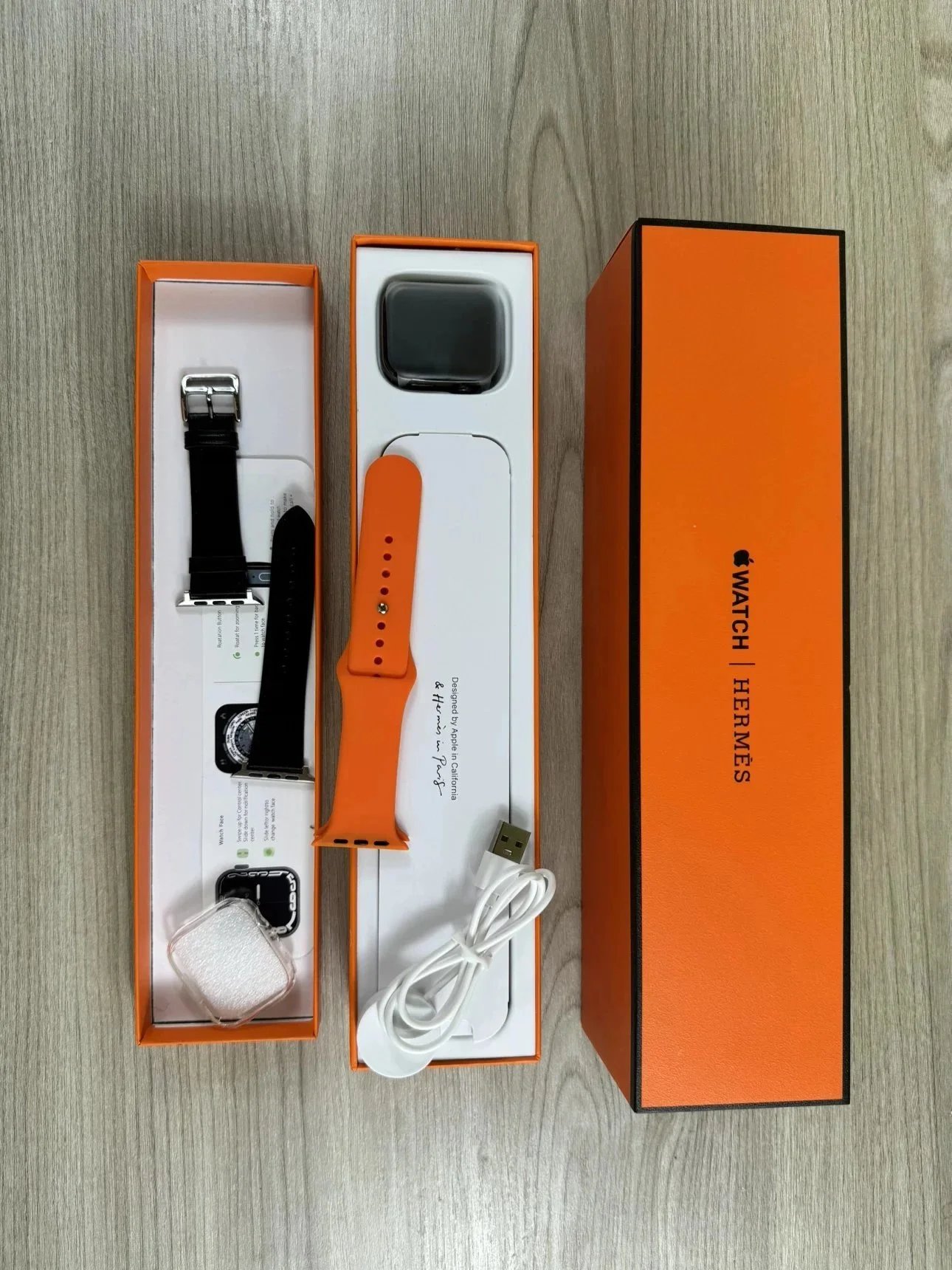 Elevate your style with this exclusive Hermès Apple Watch featuring a vibrant horse-themed dial, orange leather strap, and elegant design. A perfect blend of technology and haute couture.