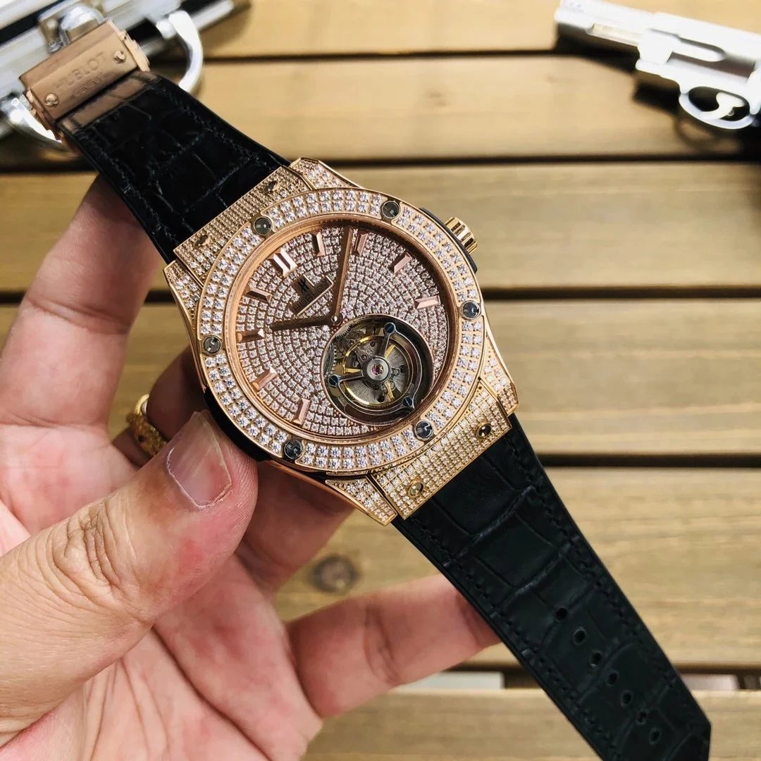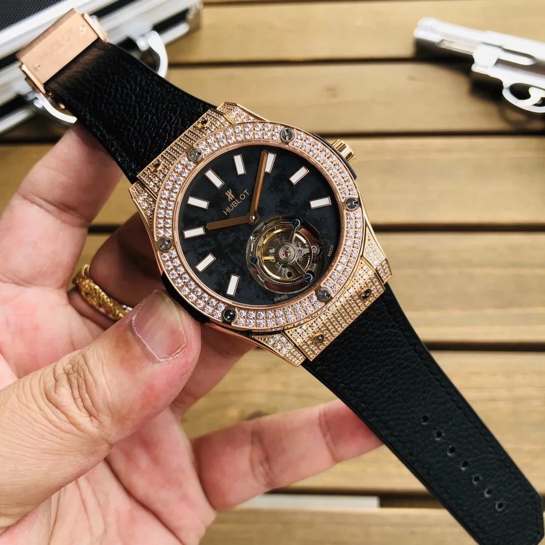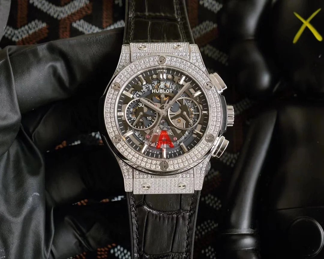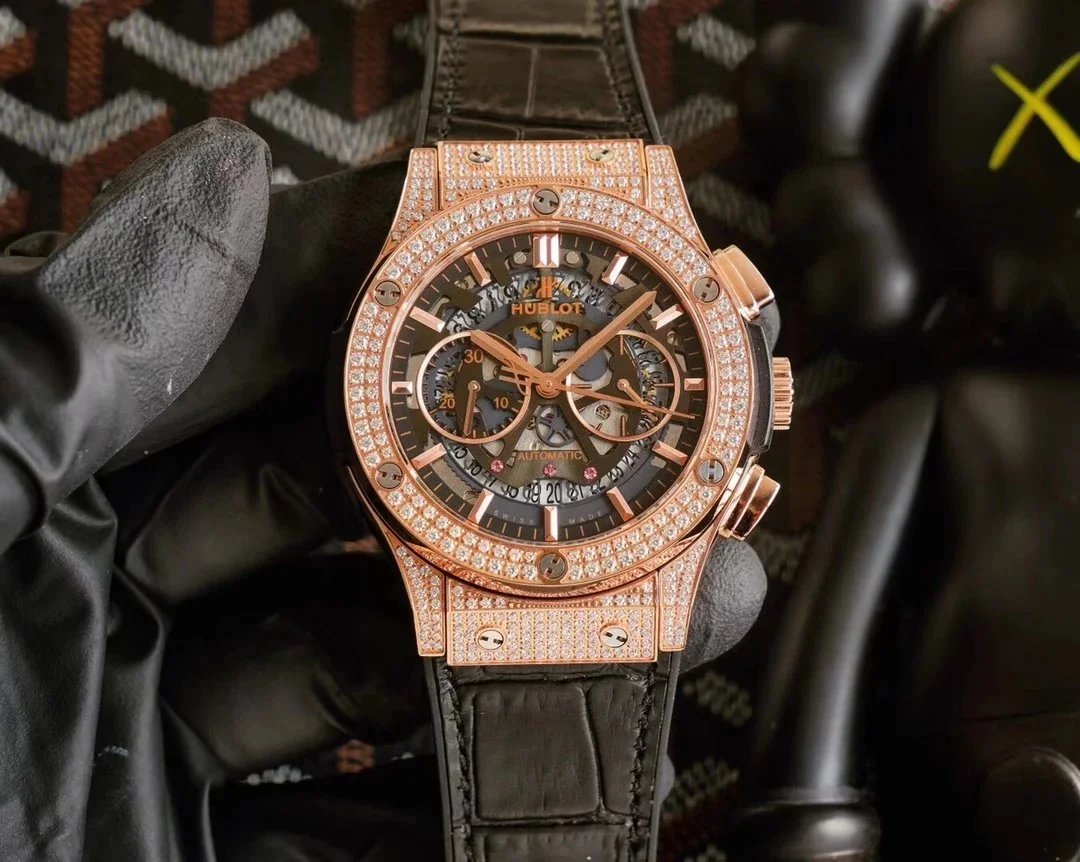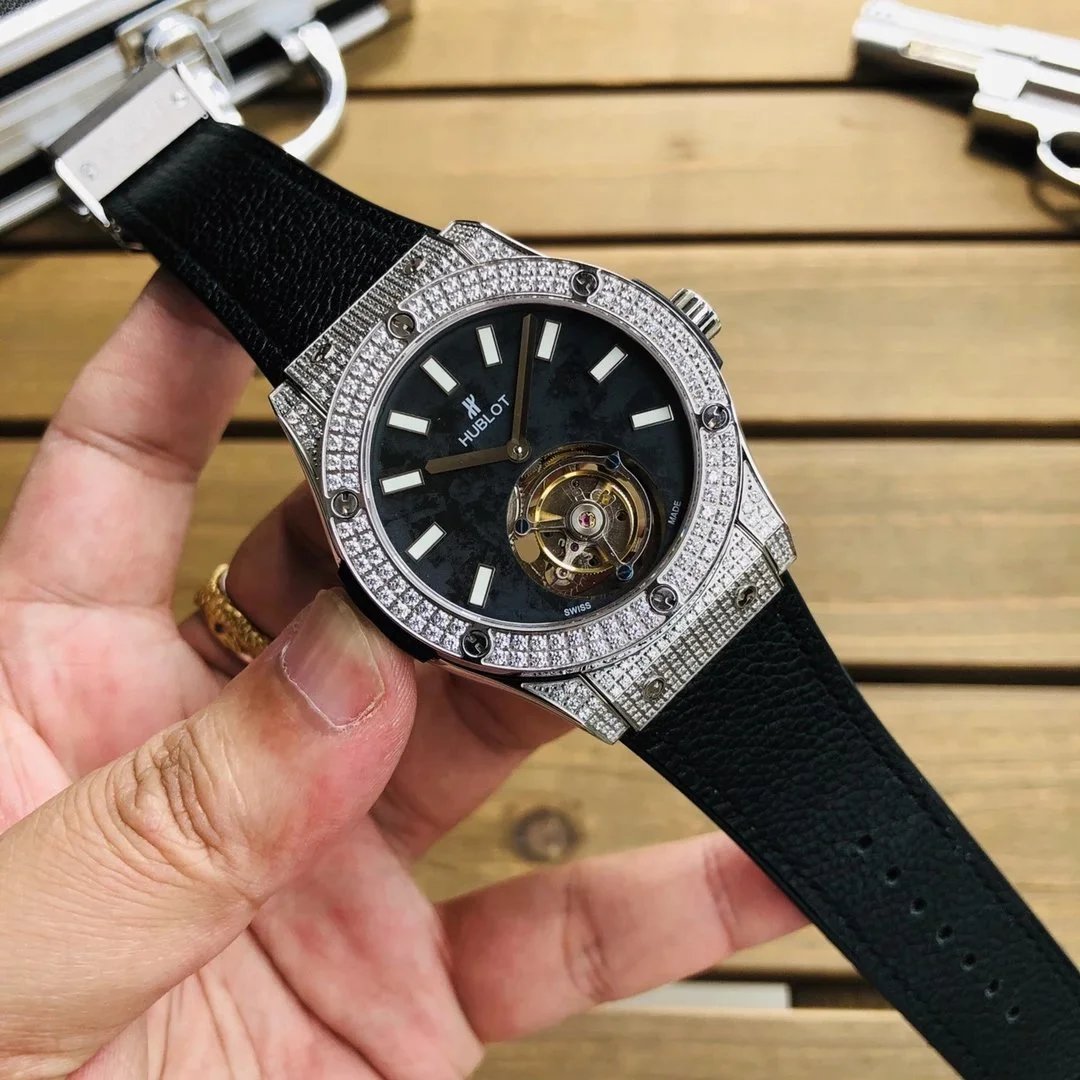 Luxury Hublot watch featuring a black diamond-encrusted case, skeletonized dial, and automatic movement. A bold statement piece for discerning collectors.