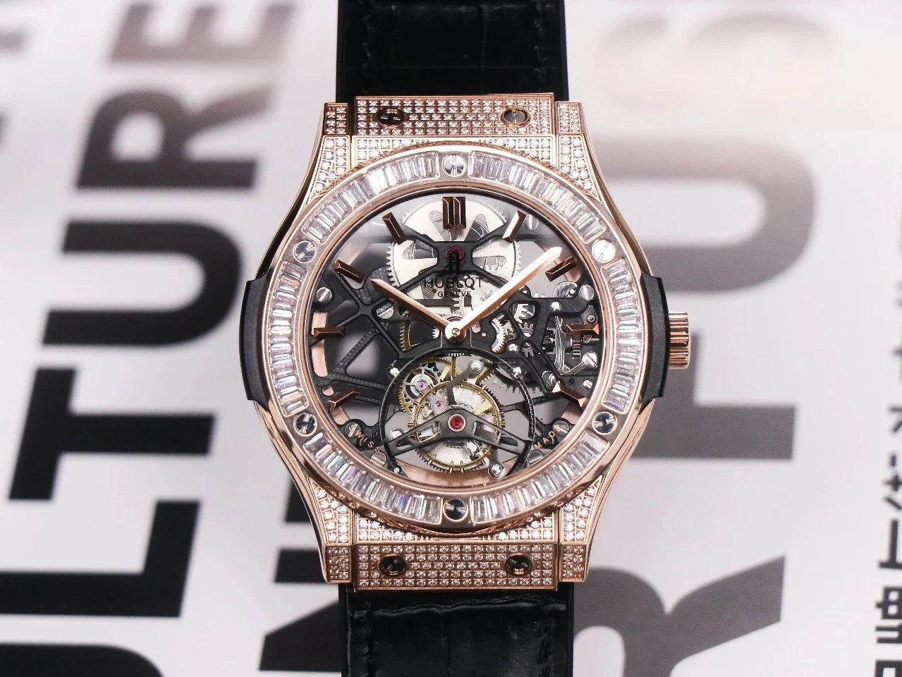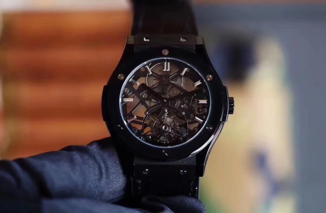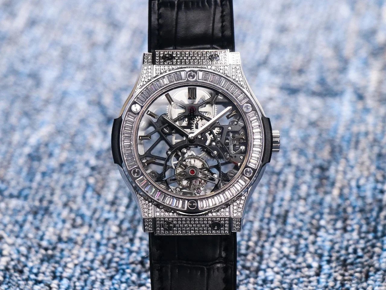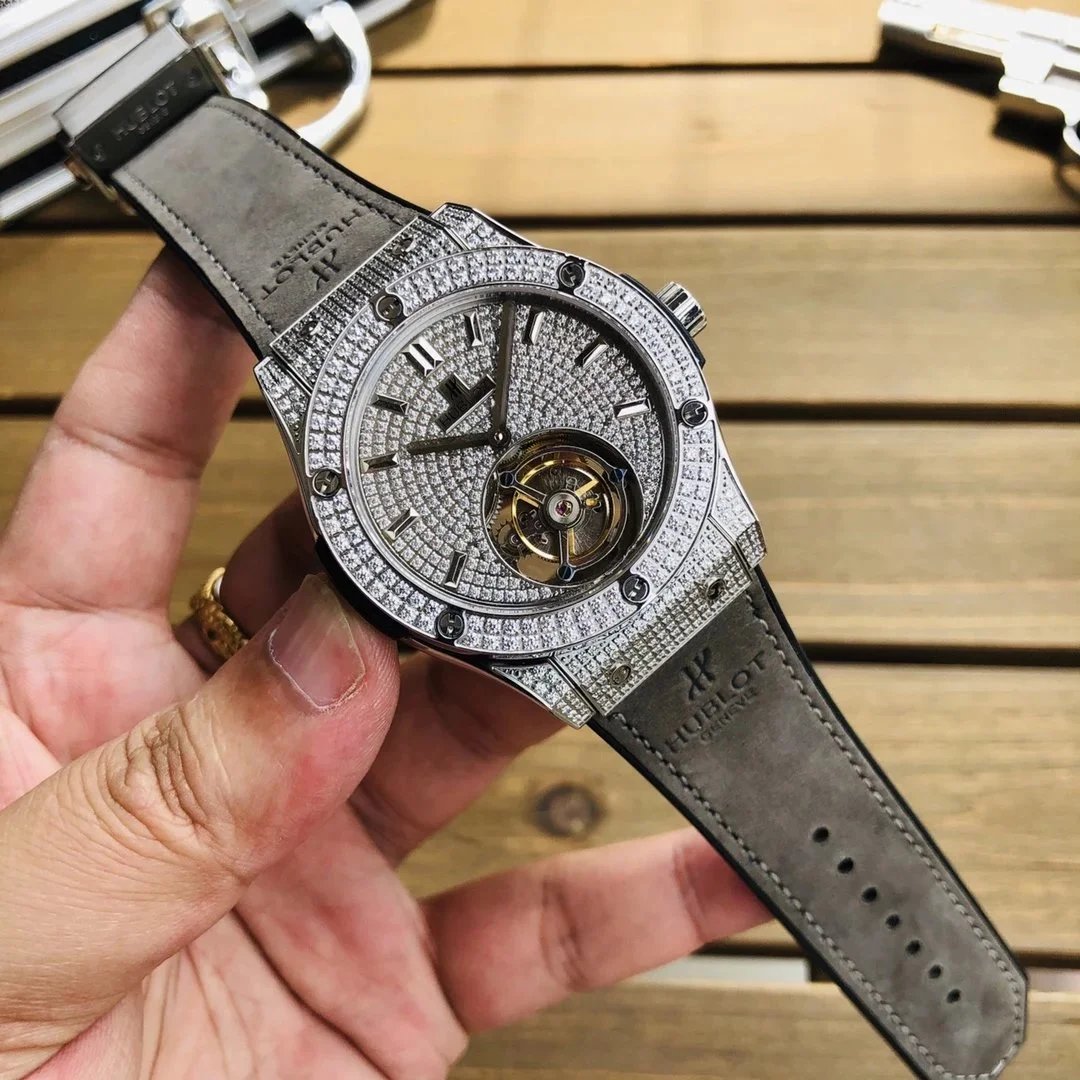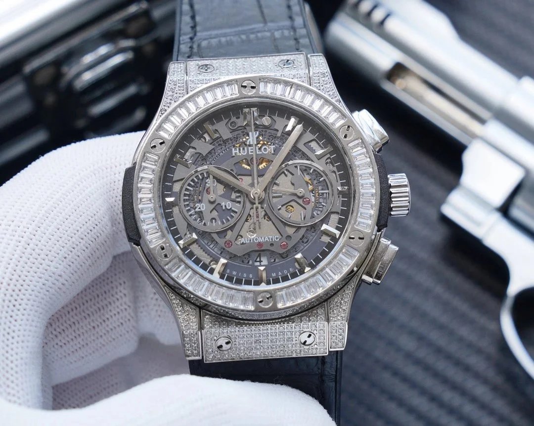 Luxury Hublot watch featuring a black diamond-encrusted case, skeletonized dial, and automatic movement. A bold statement piece for discerning collectors.