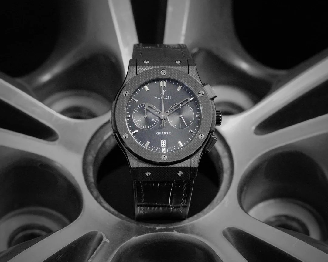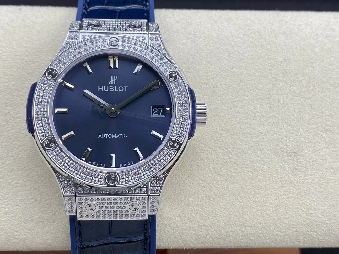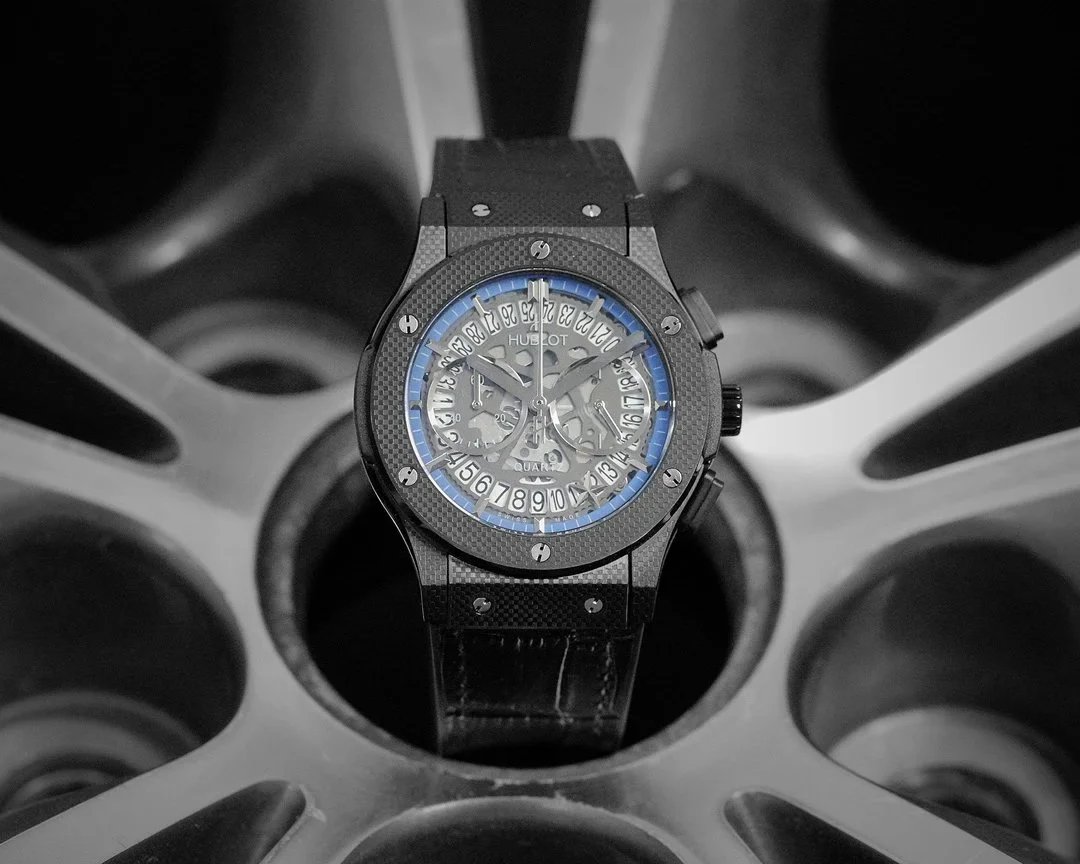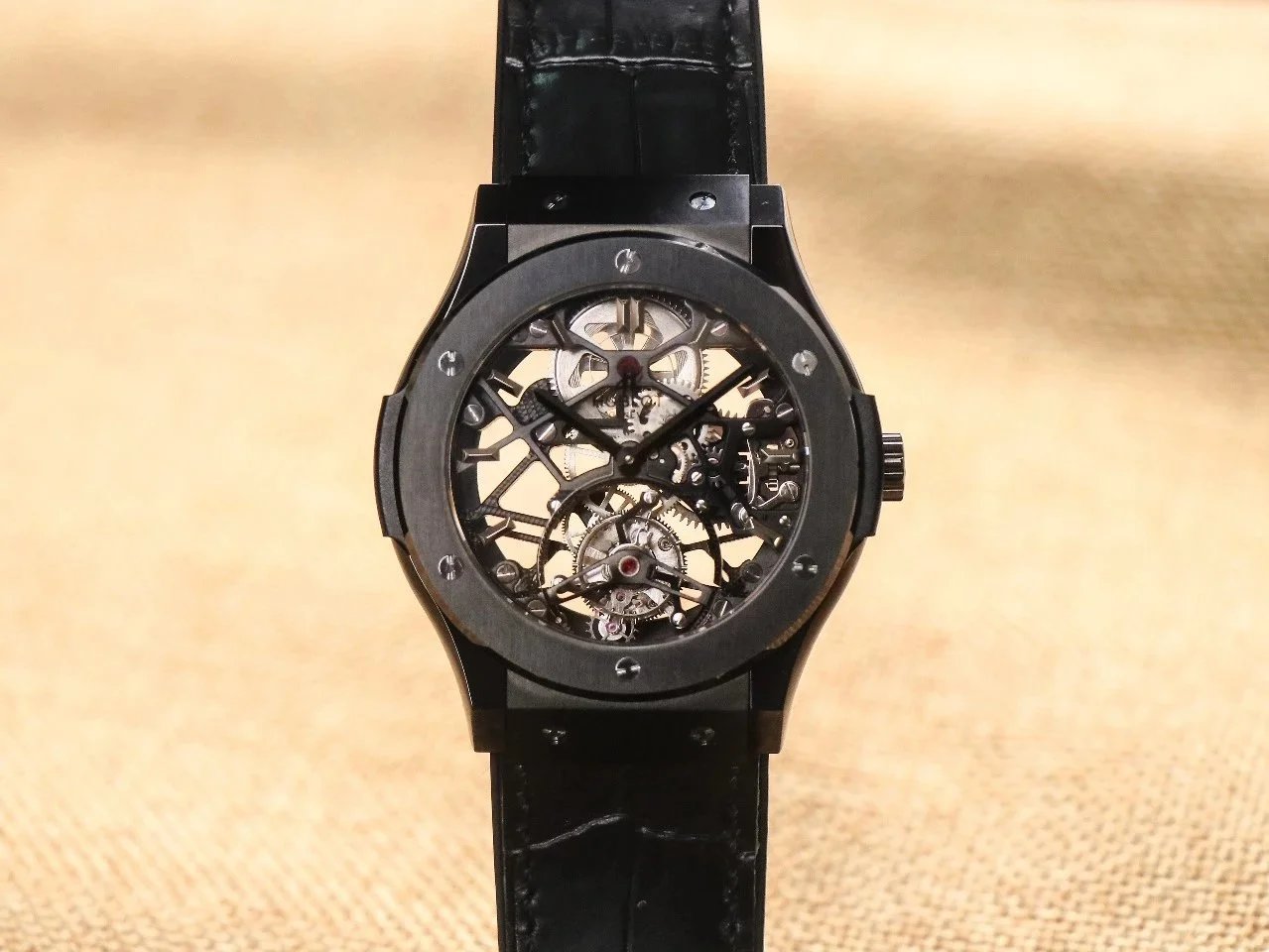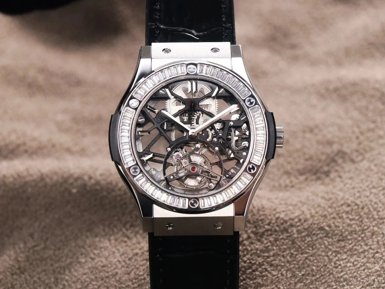 Luxury Hublot watch featuring a black diamond-encrusted case, skeletonized dial, and automatic movement. A bold statement piece for discerning collectors.