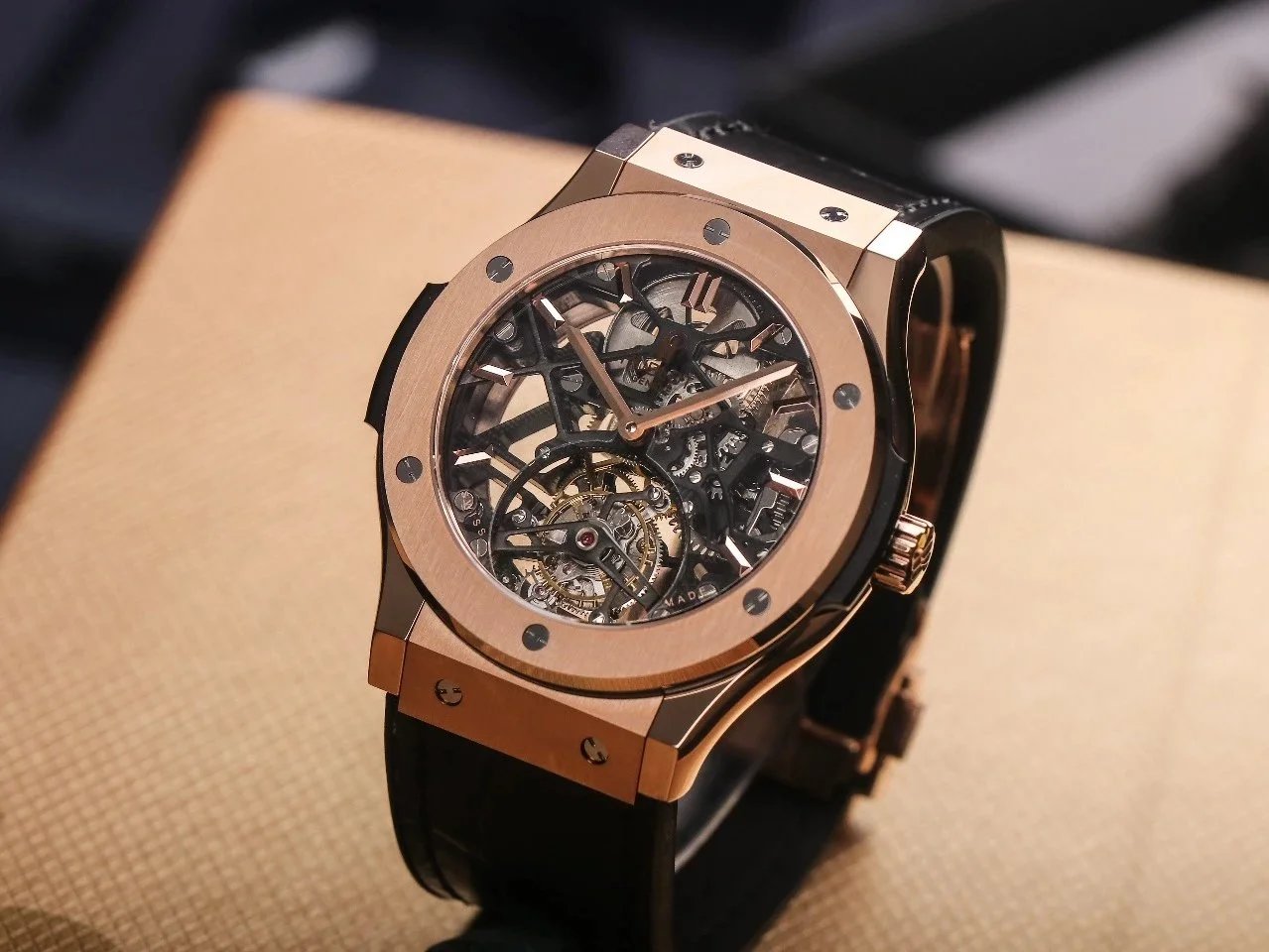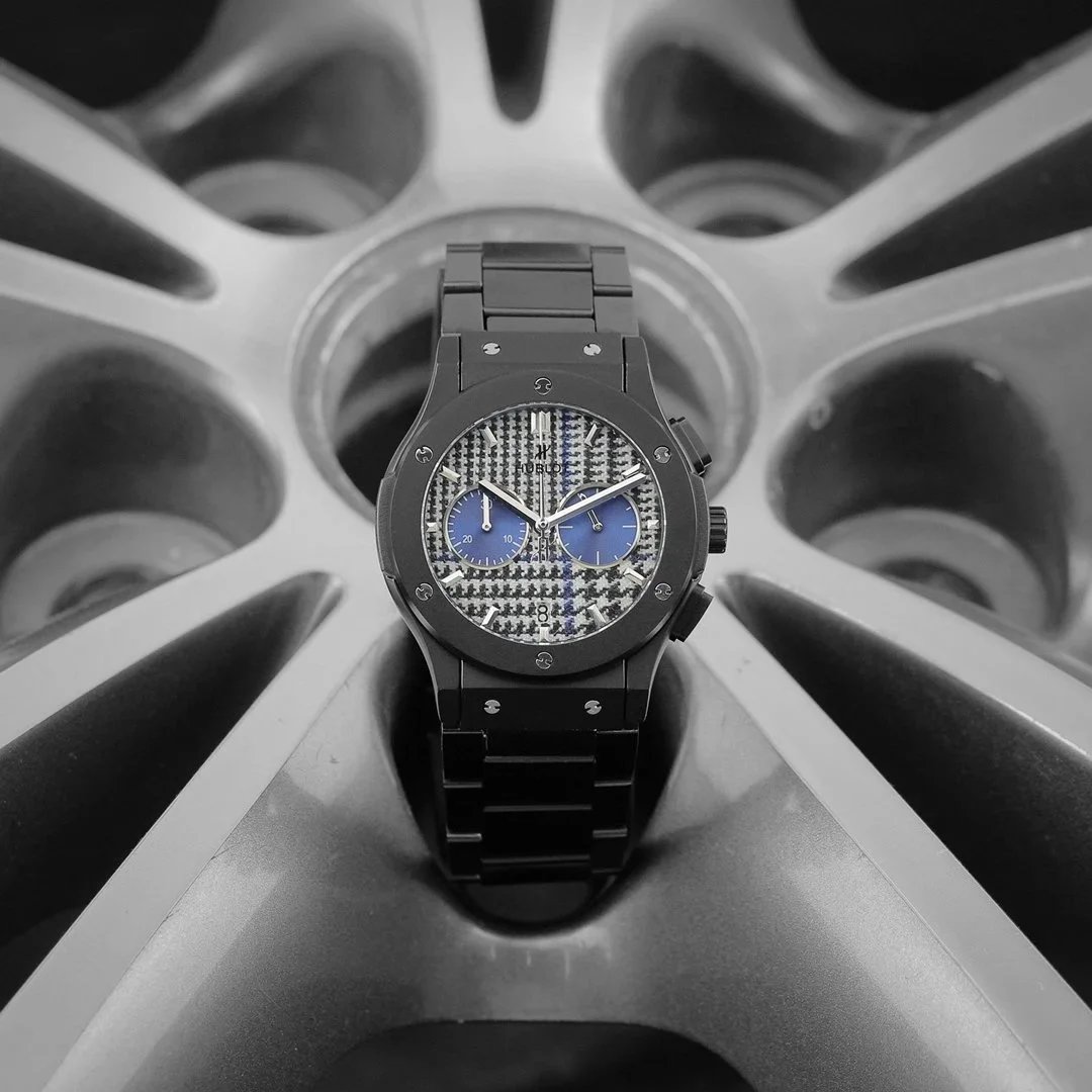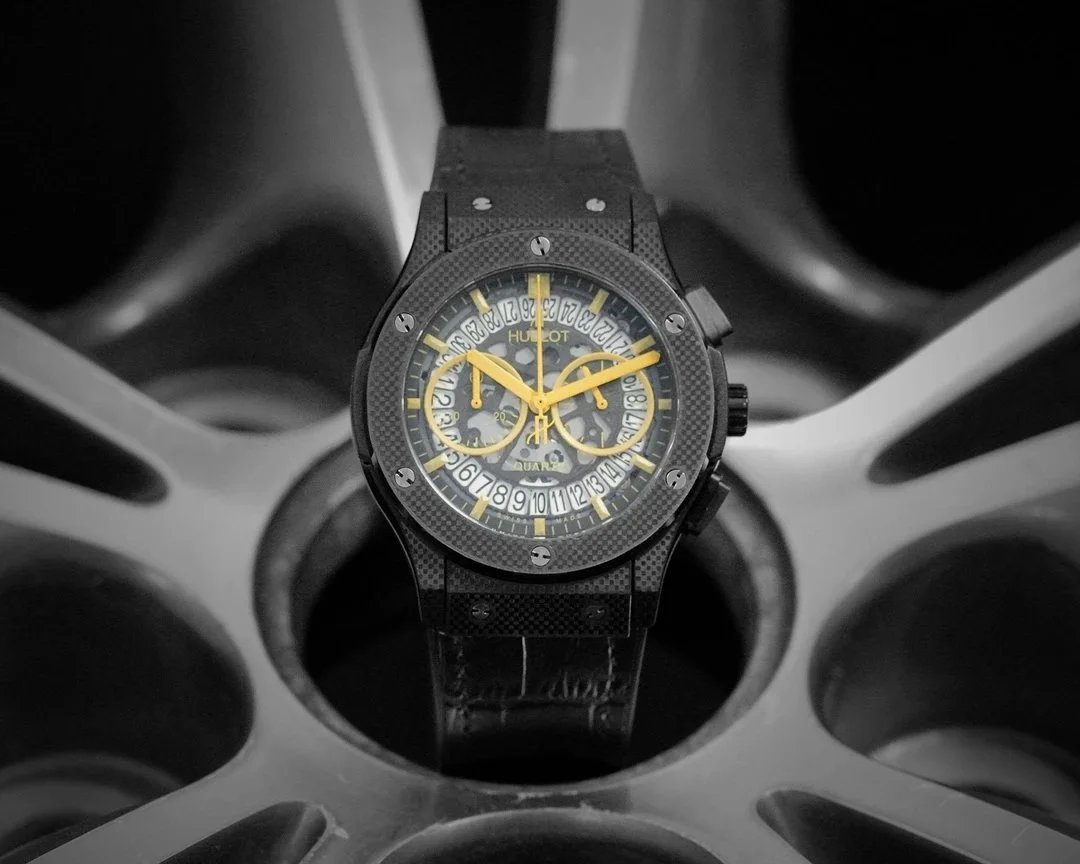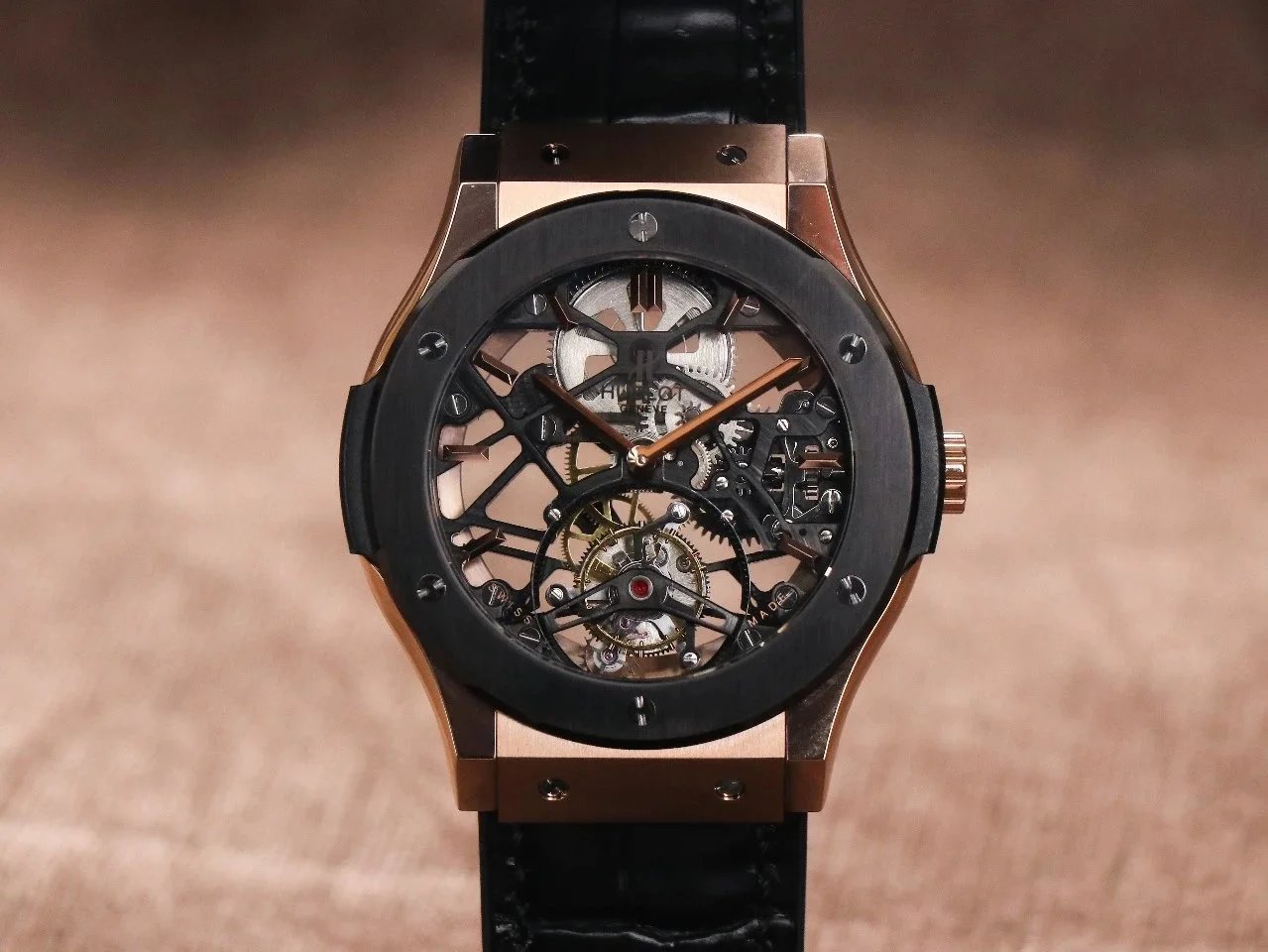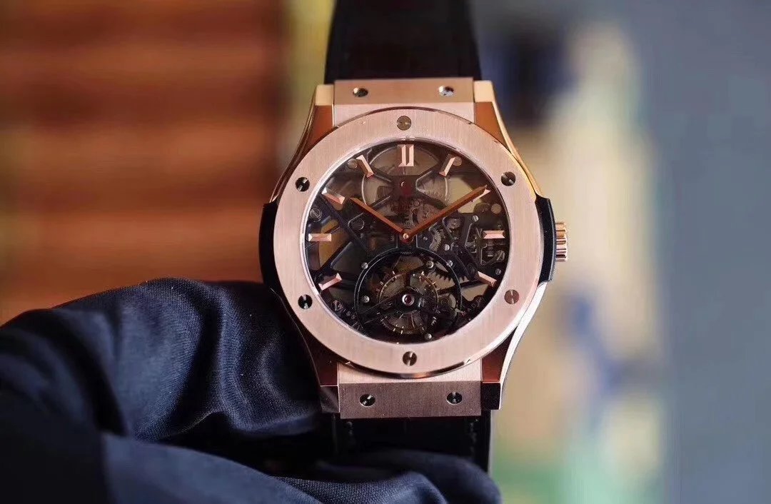 Luxury Hublot watch featuring a black diamond-encrusted case, skeletonized dial, and automatic movement. A bold statement piece for discerning collectors.