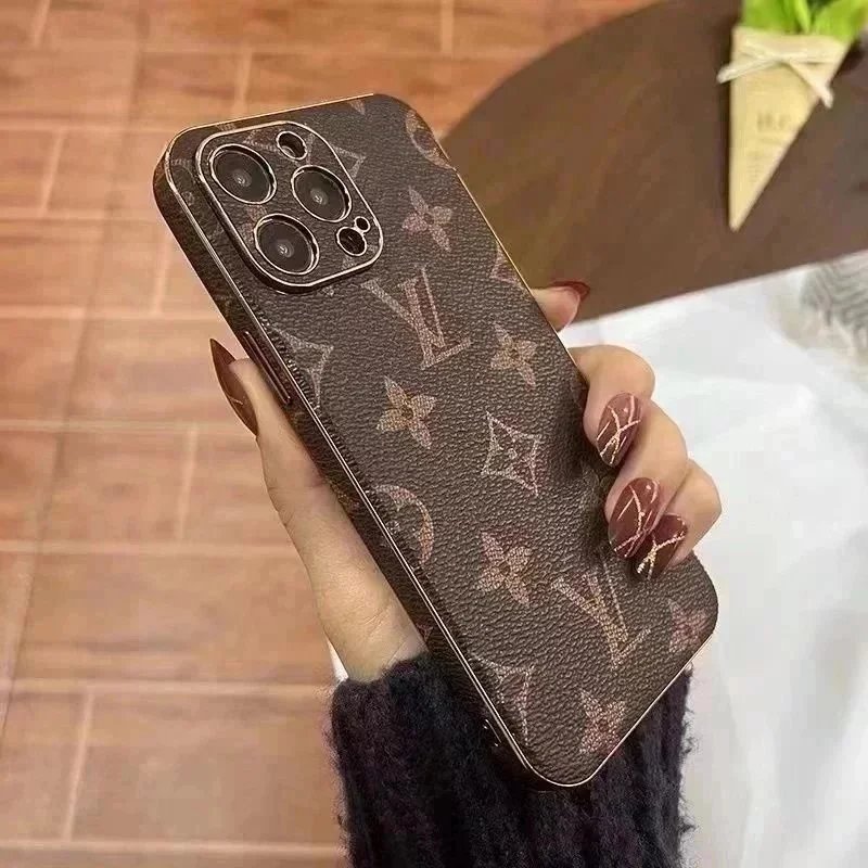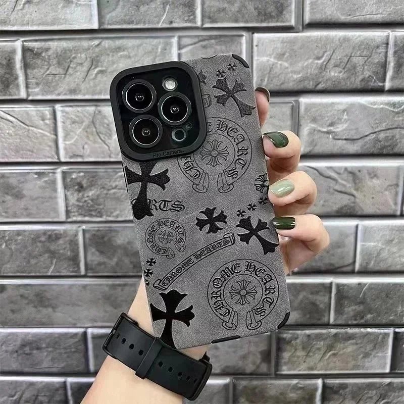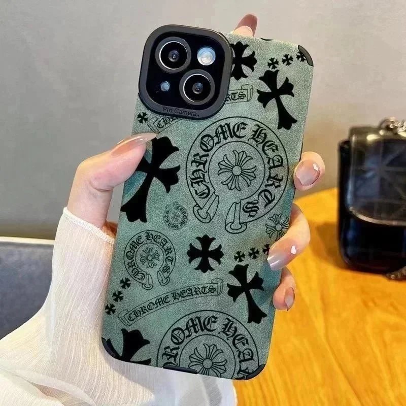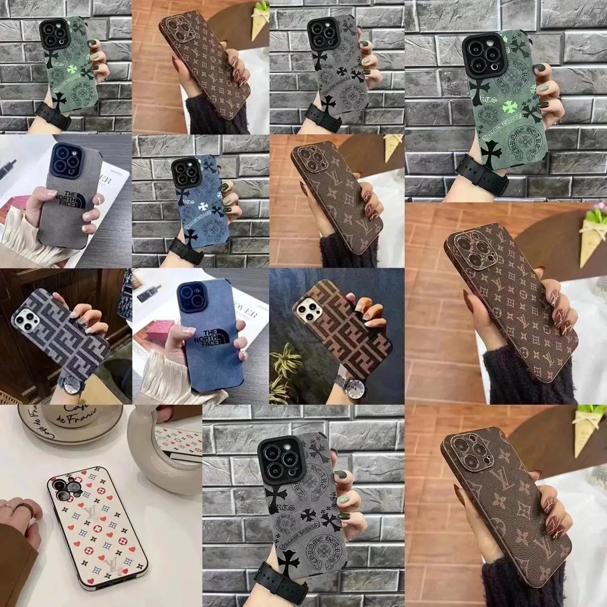 Durable iPhone cases featuring iconic patterns from Louis Vuitton, Fendi, and The North Face. Includes textured designs, cross motifs, and brand logos for a premium look.