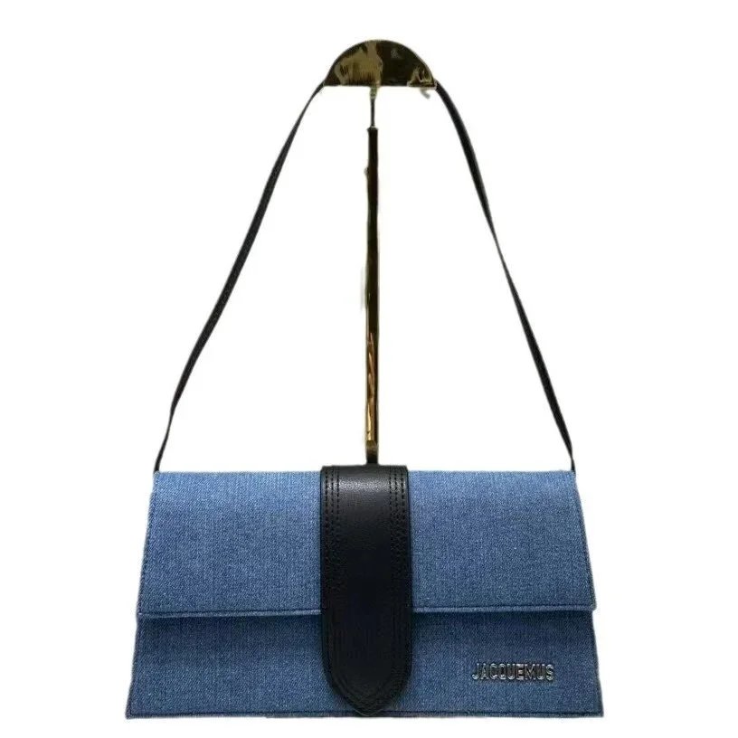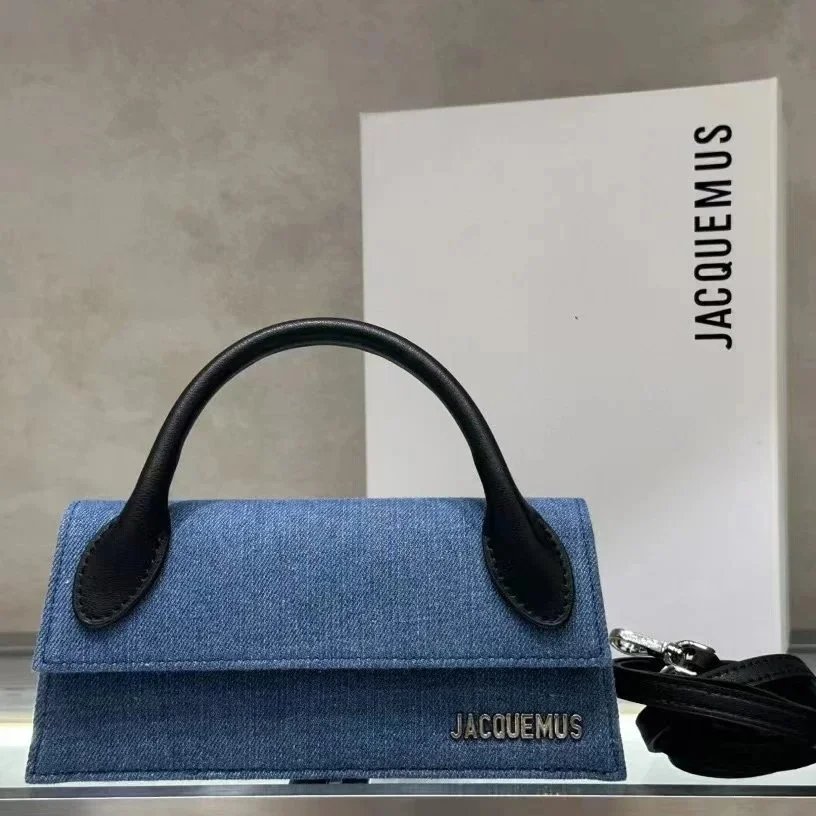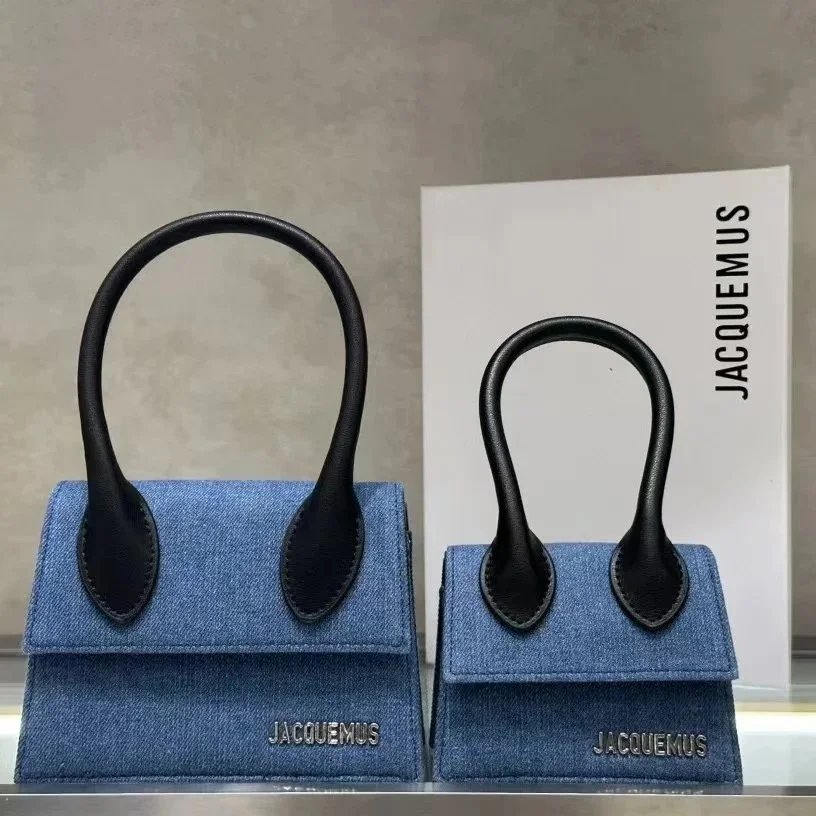 The Jacquemus Le Chiquito denim bag in blue features a distinctive black leather handle and minimalist design, perfect for modern fashion enthusiasts.