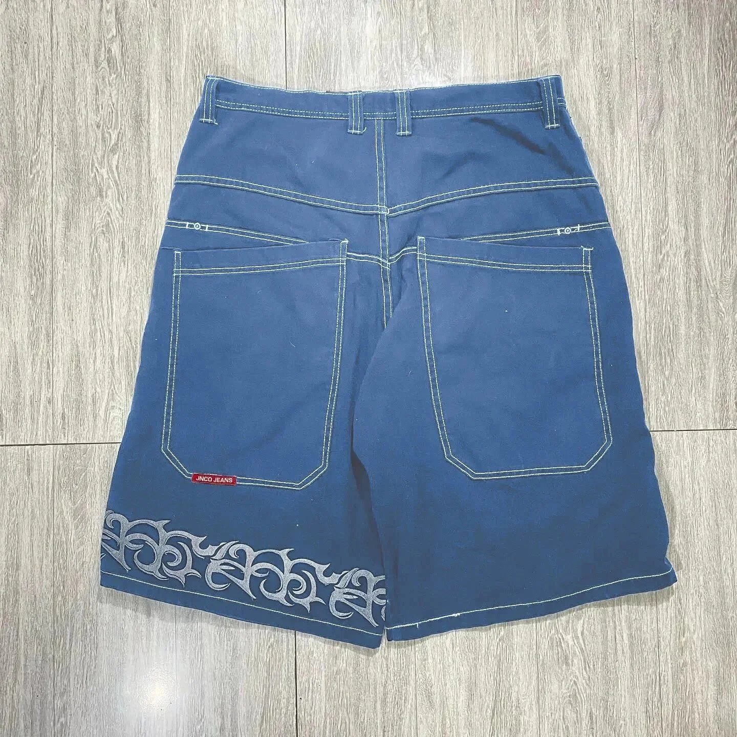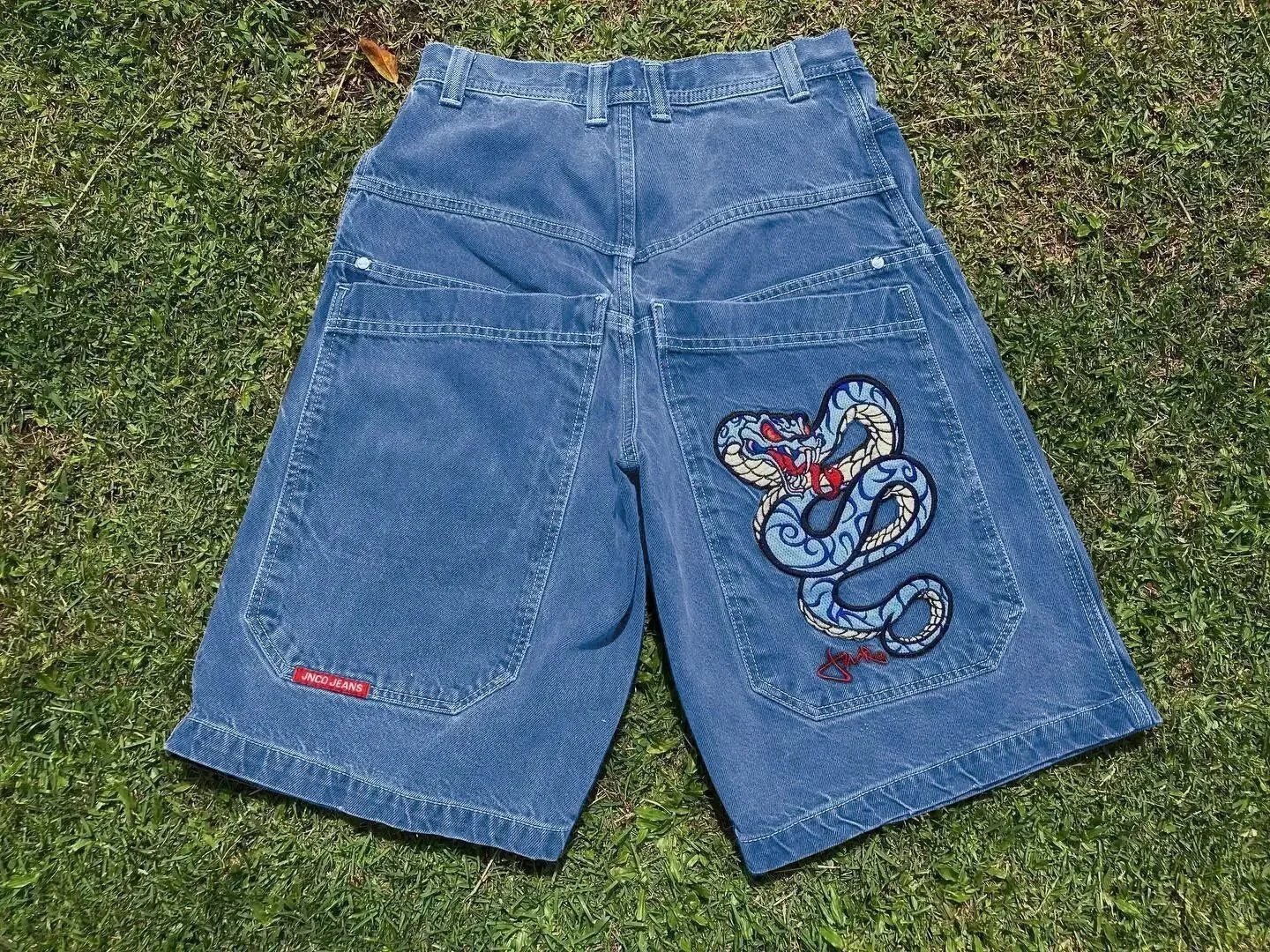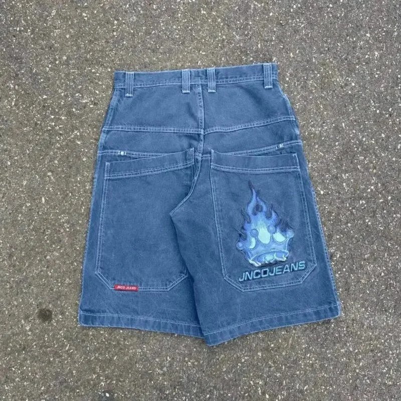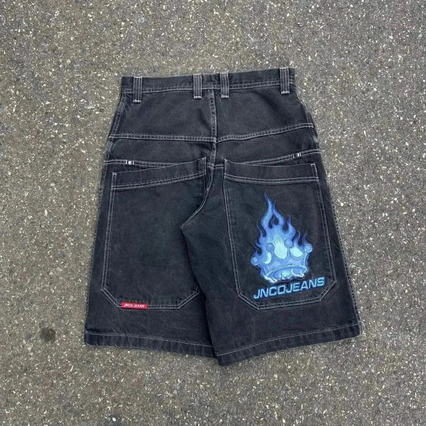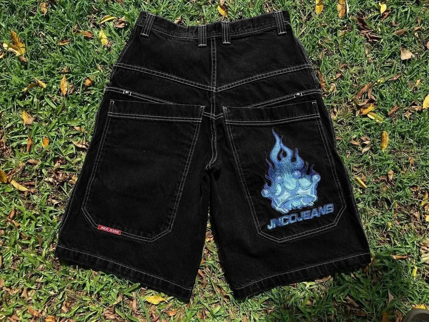 Authentic JNCO denim shorts featuring bold embroidered designs including flames, dice, and animal motifs. Perfect for streetwear enthusiasts seeking distinctive style.