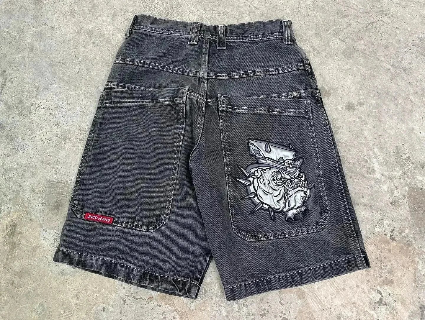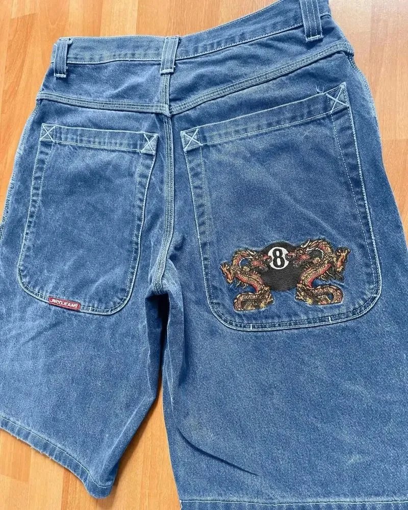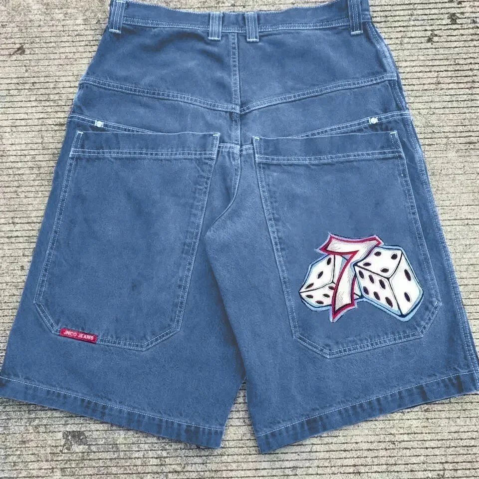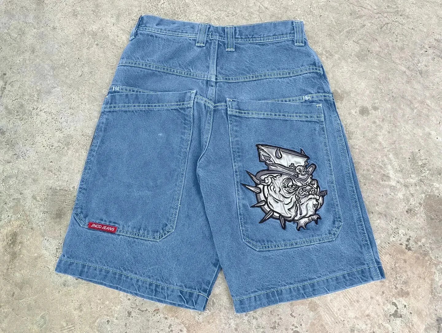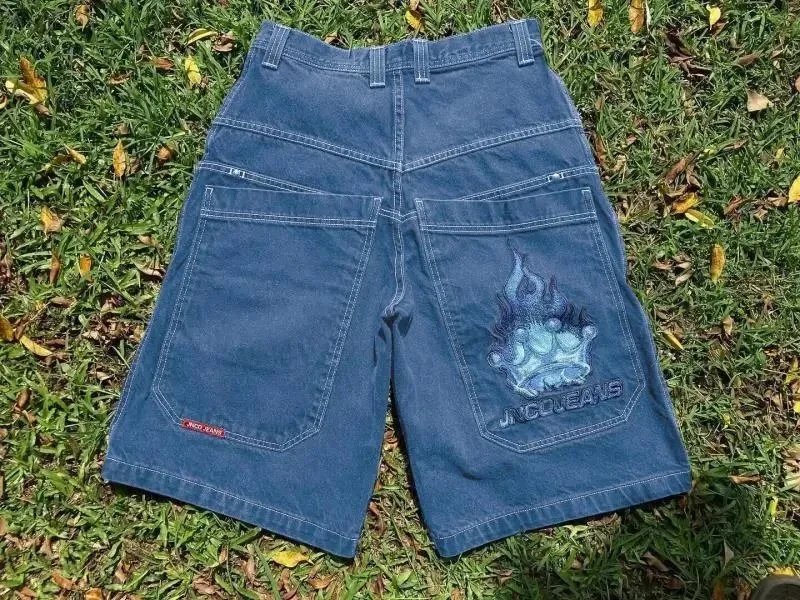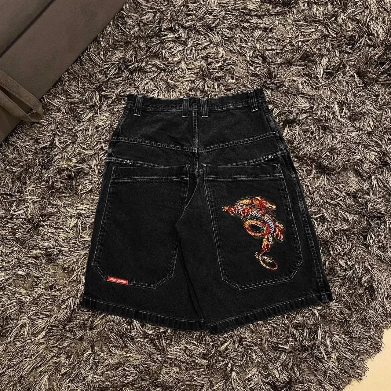 Authentic JNCO denim shorts featuring bold embroidered designs including flames, dice, and animal motifs. Perfect for streetwear enthusiasts seeking distinctive style.