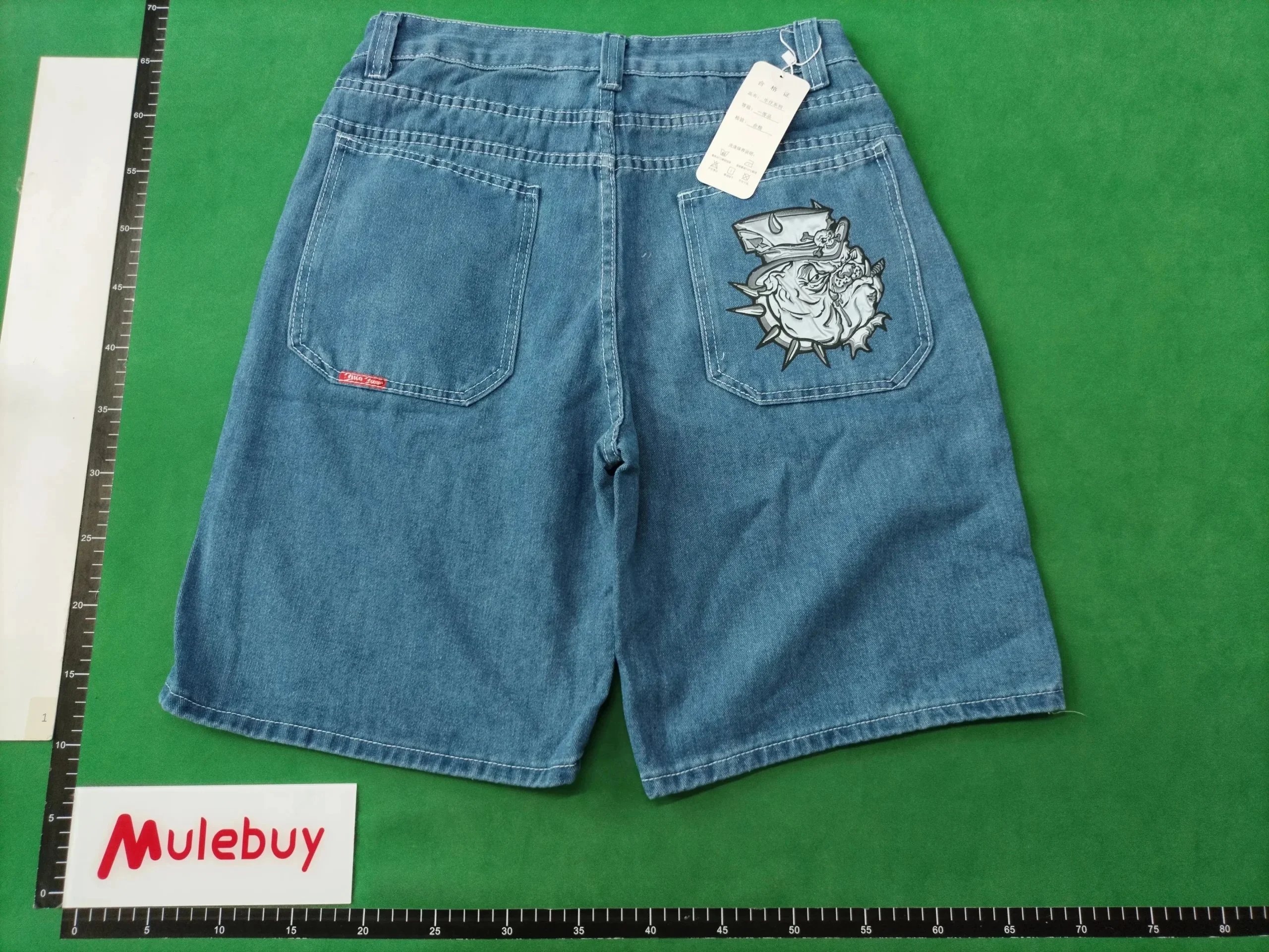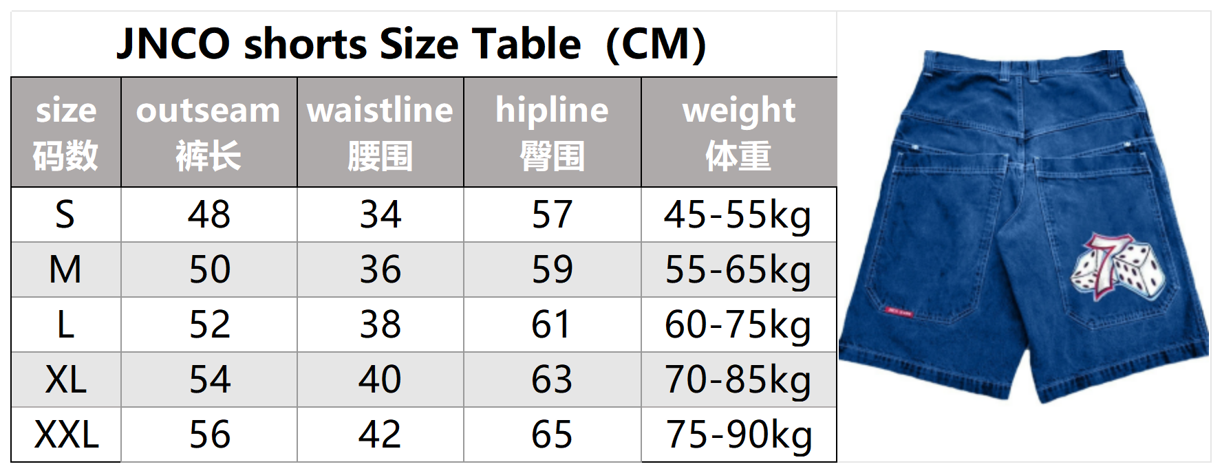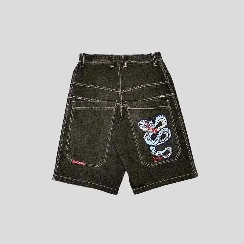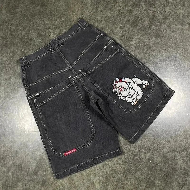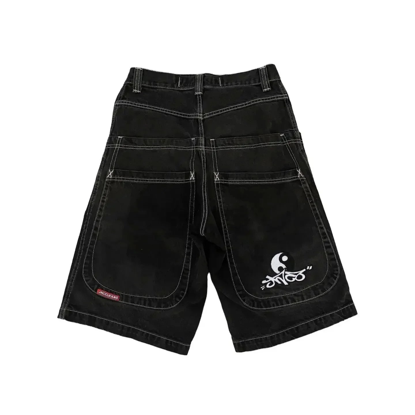 Authentic JNCO denim shorts featuring bold embroidered designs including flames, dice, and animal motifs. Perfect for streetwear enthusiasts seeking distinctive style.