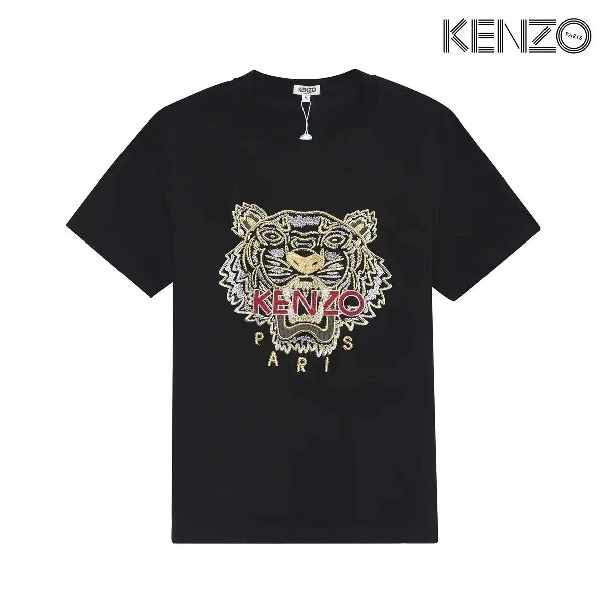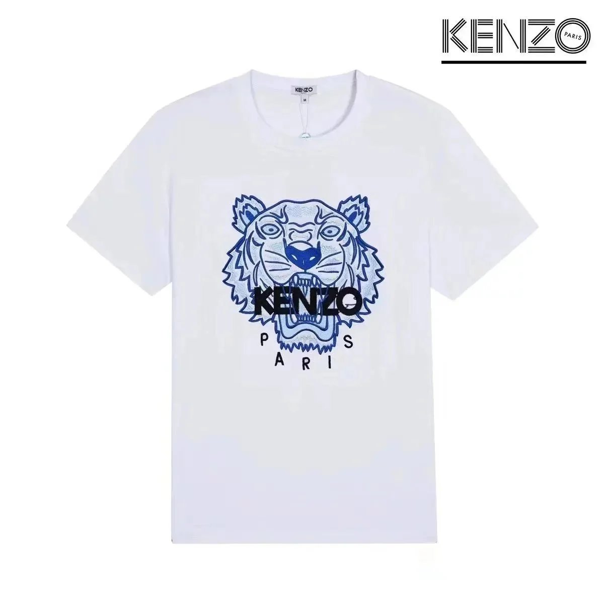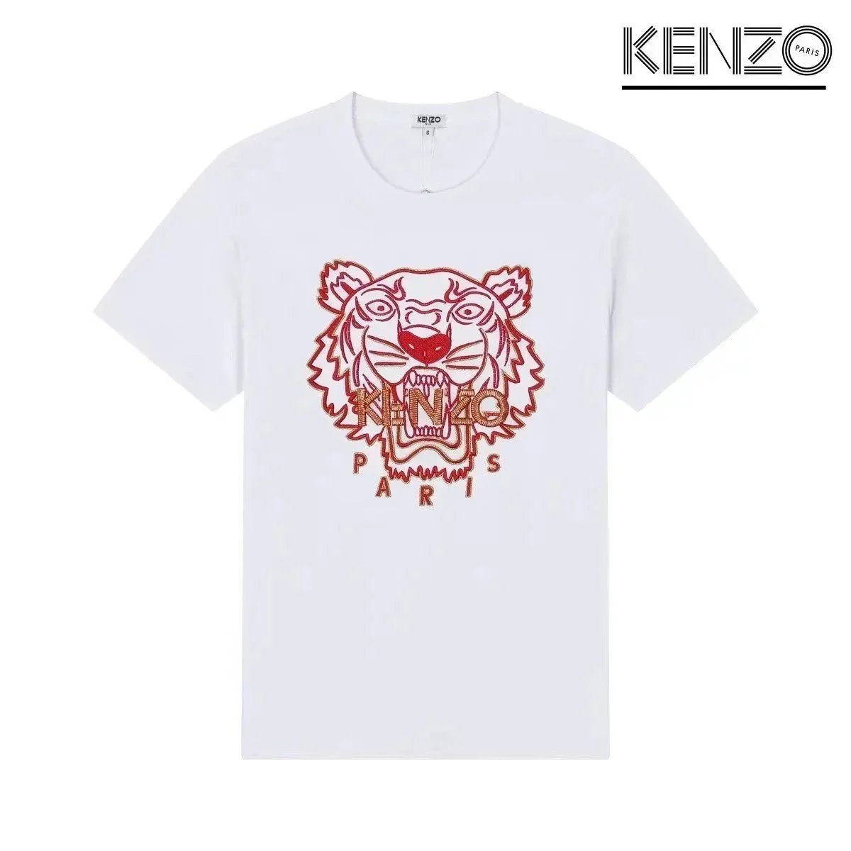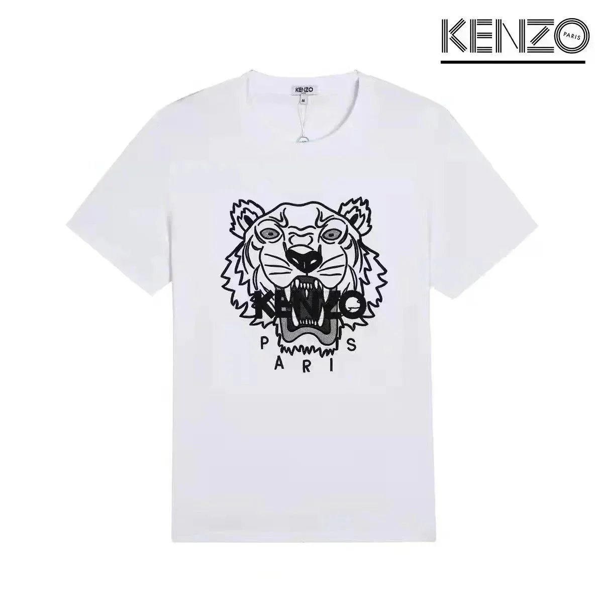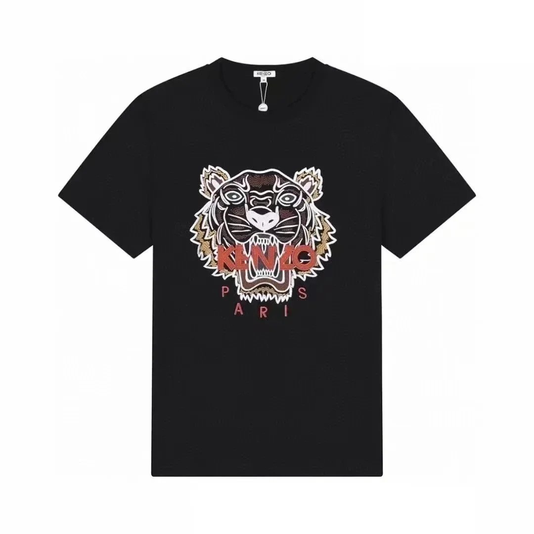 Discover KENZO's iconic t-shirts featuring embroidered tiger and flower motifs, available in white, black, and gray. Each piece showcases the brand's signature Paris branding and bold graphic designs.