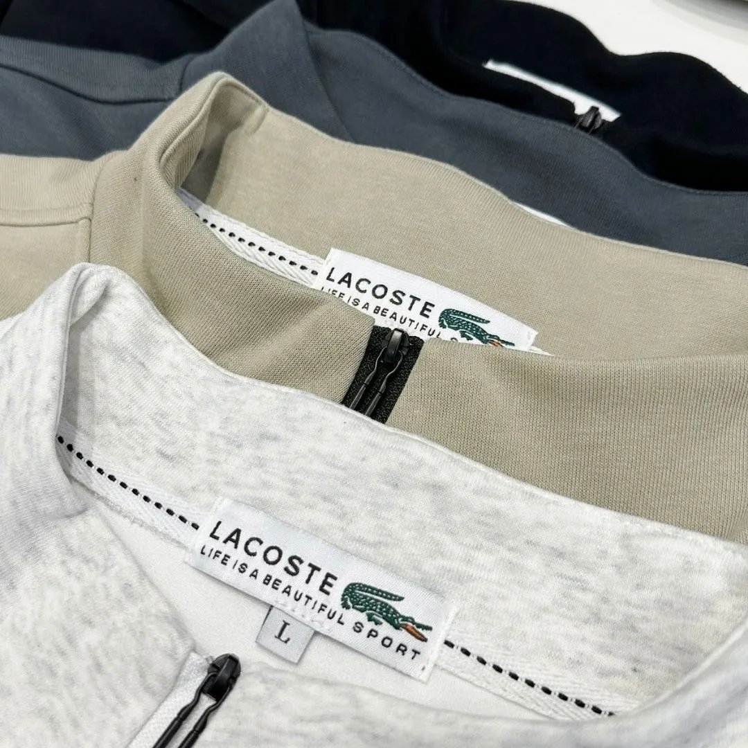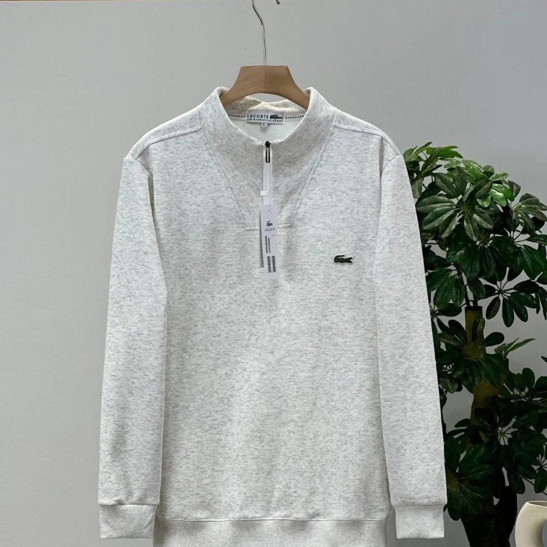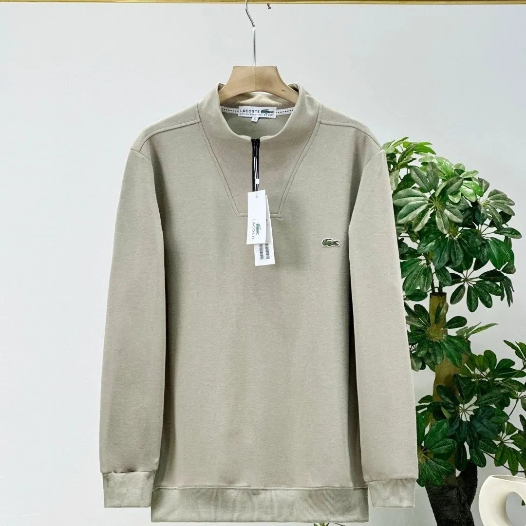 Elevate your casual wardrobe with this premium Lacoste half-zip sweatshirt in soft beige, featuring the iconic crocodile logo and ribbed cuffs for timeless comfort and style.
