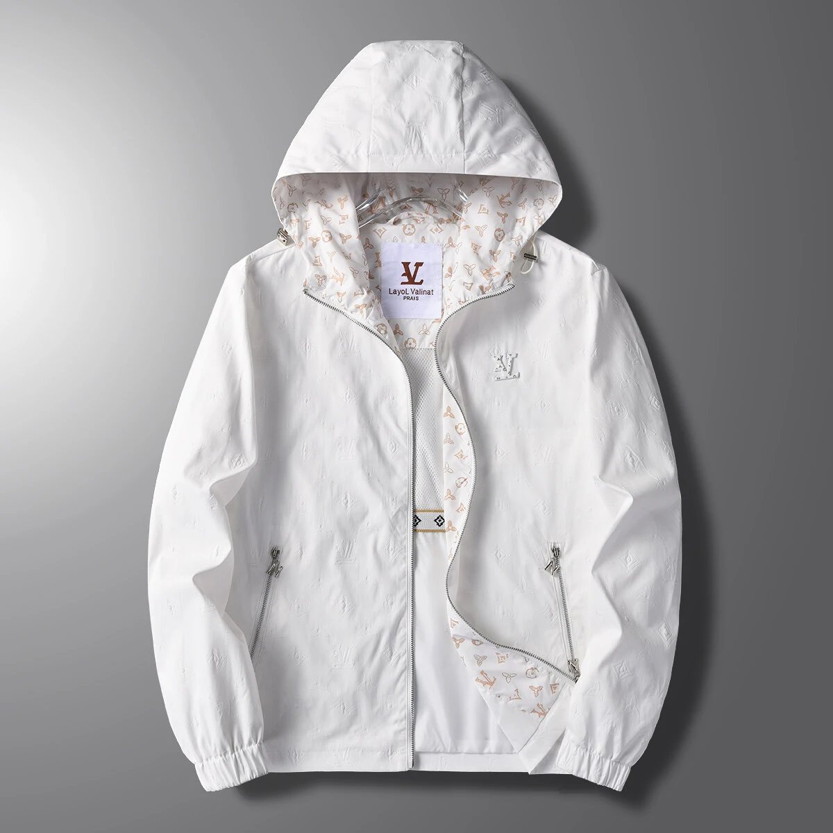 Stylish white hooded jacket featuring a subtle monogram pattern and premium detailing. Perfect for modern fashion enthusiasts seeking comfort and elegance.