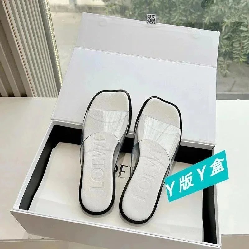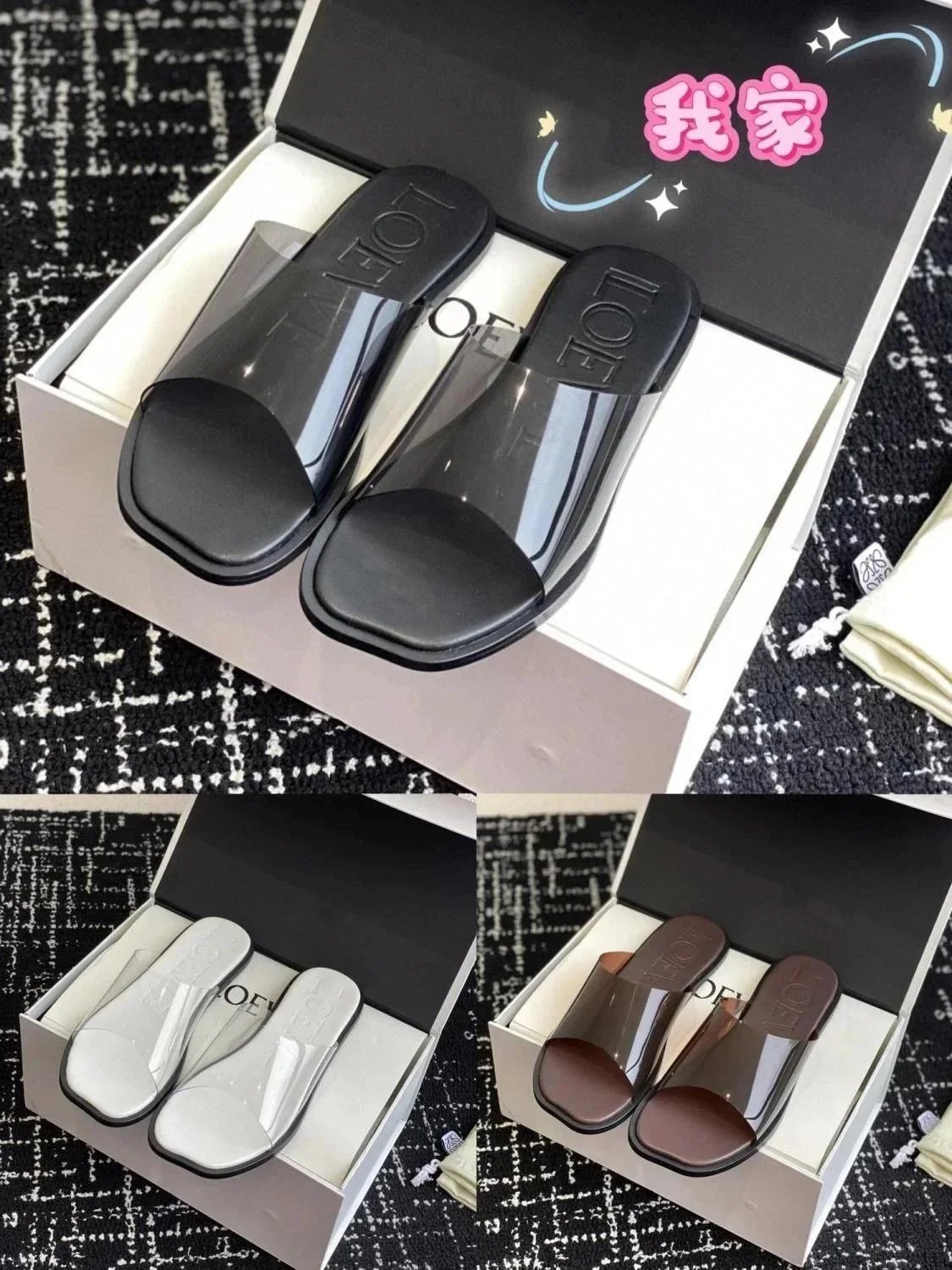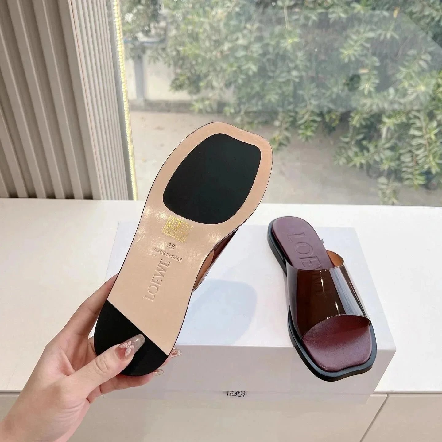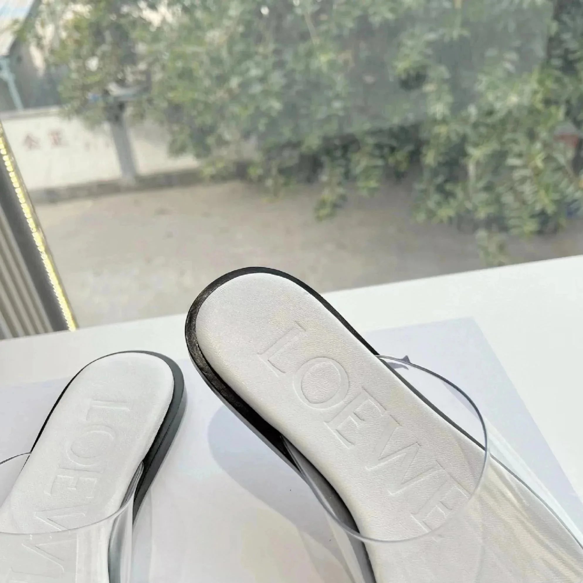 Elevate your summer style with LOEWE's sleek clear strap slide sandals, available in black, white, and burgundy. Perfect for effortless chic.