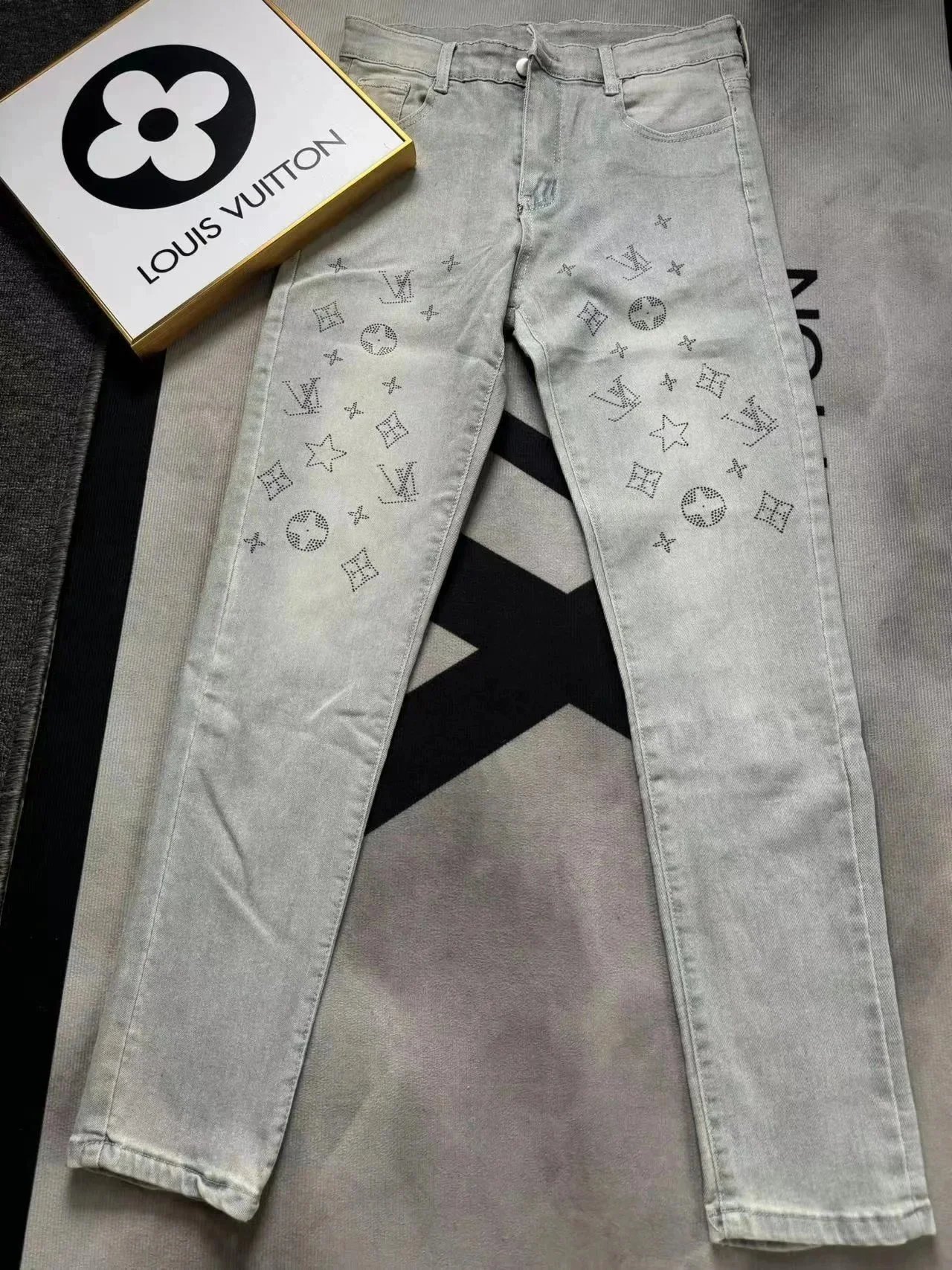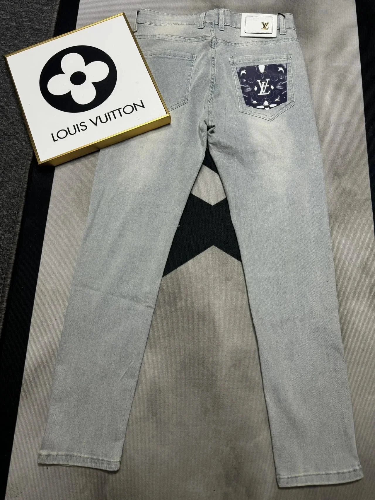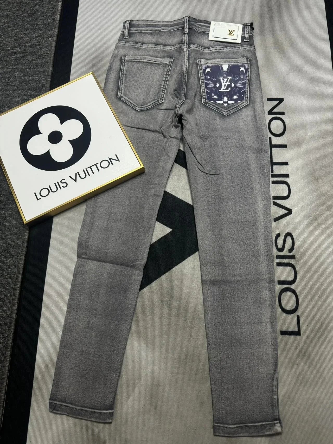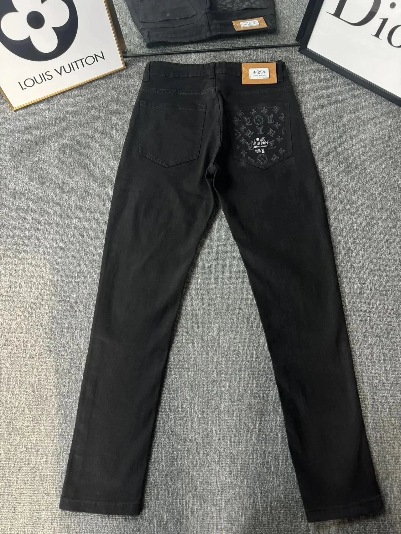Stylish Louis Vuitton black jeans featuring a distinctive LV monogram patch on the back pocket. Premium denim with iconic branding for a bold fashion statement.