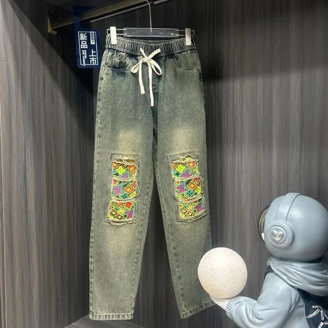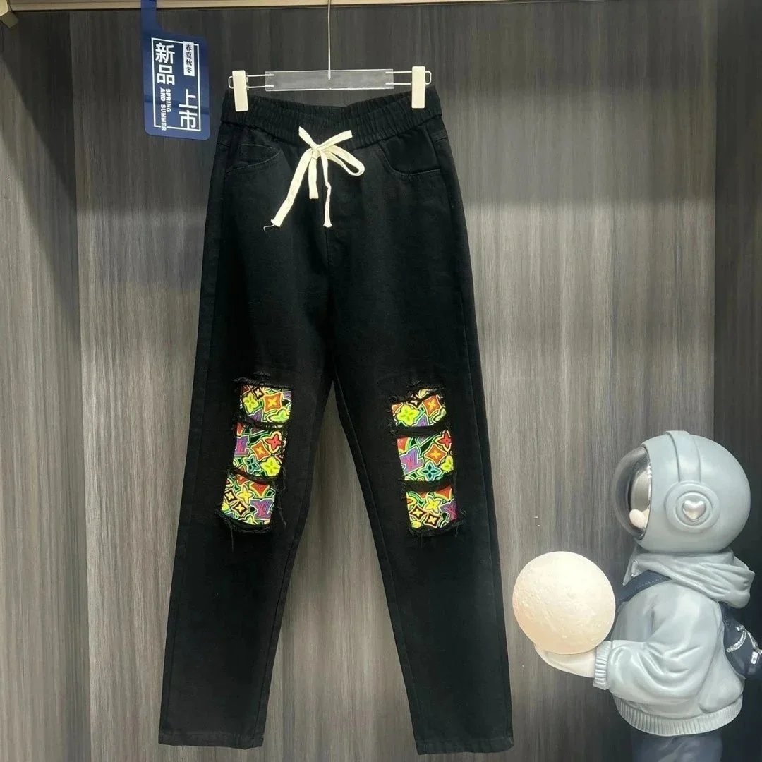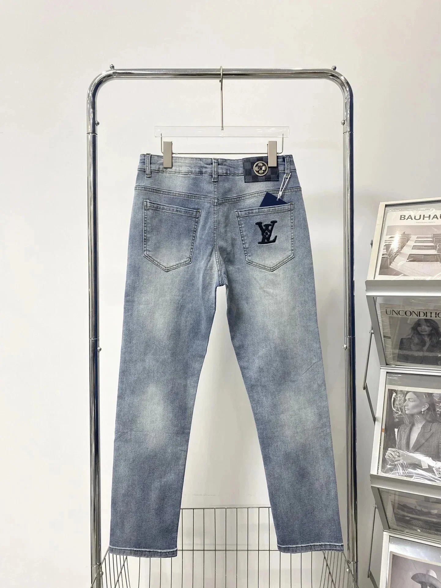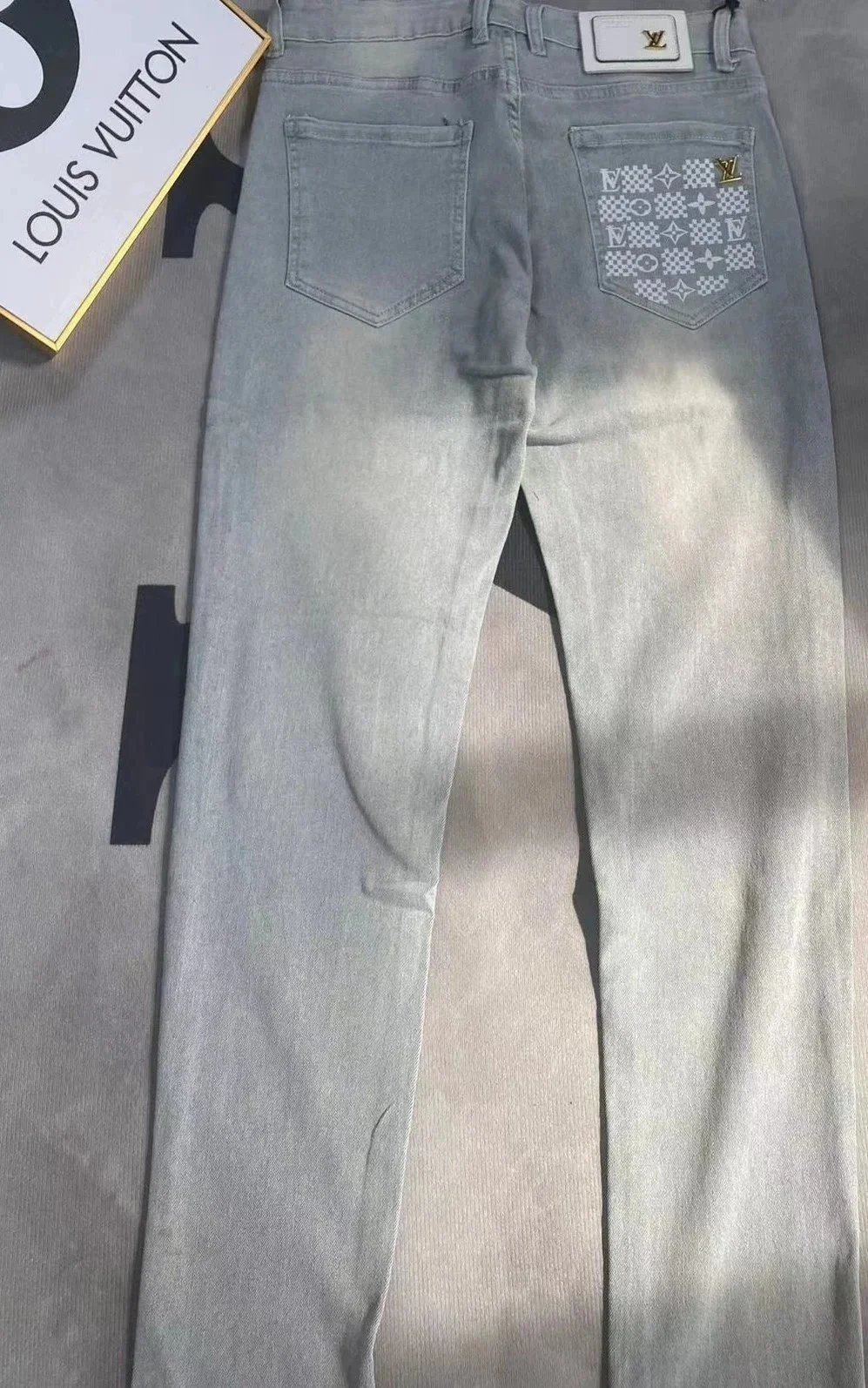 Stylish Louis Vuitton black jeans featuring a distinctive LV monogram patch on the back pocket. Premium denim with iconic branding for a bold fashion statement.