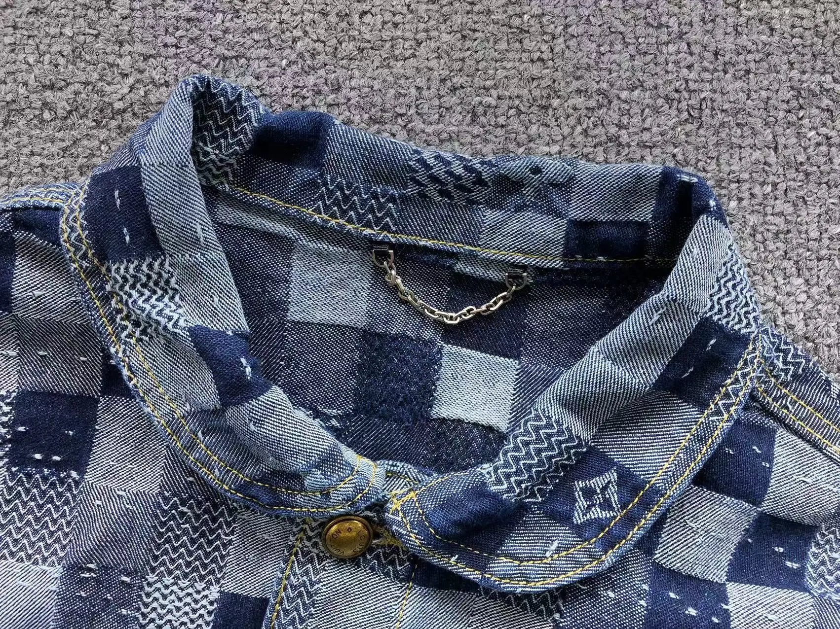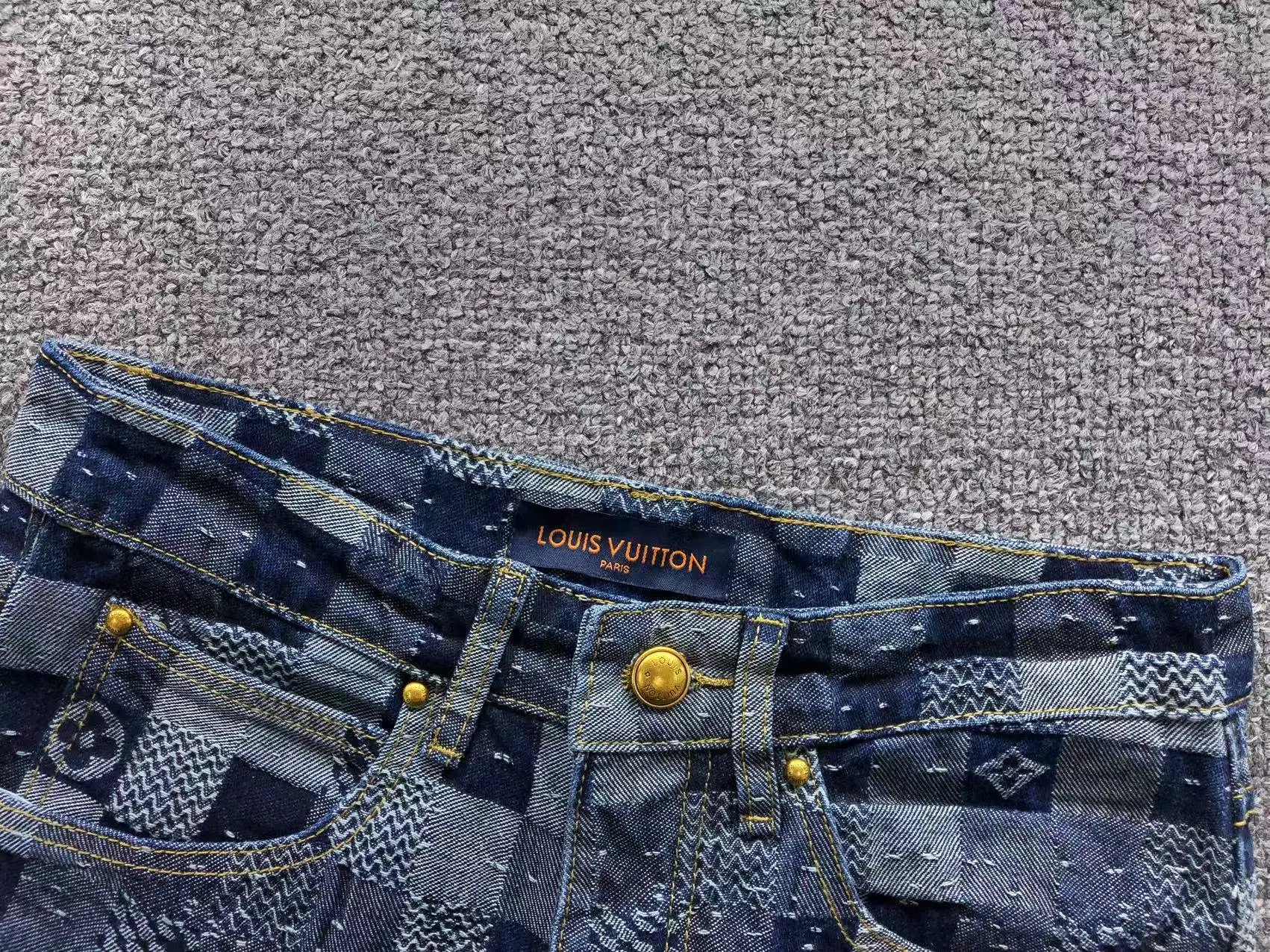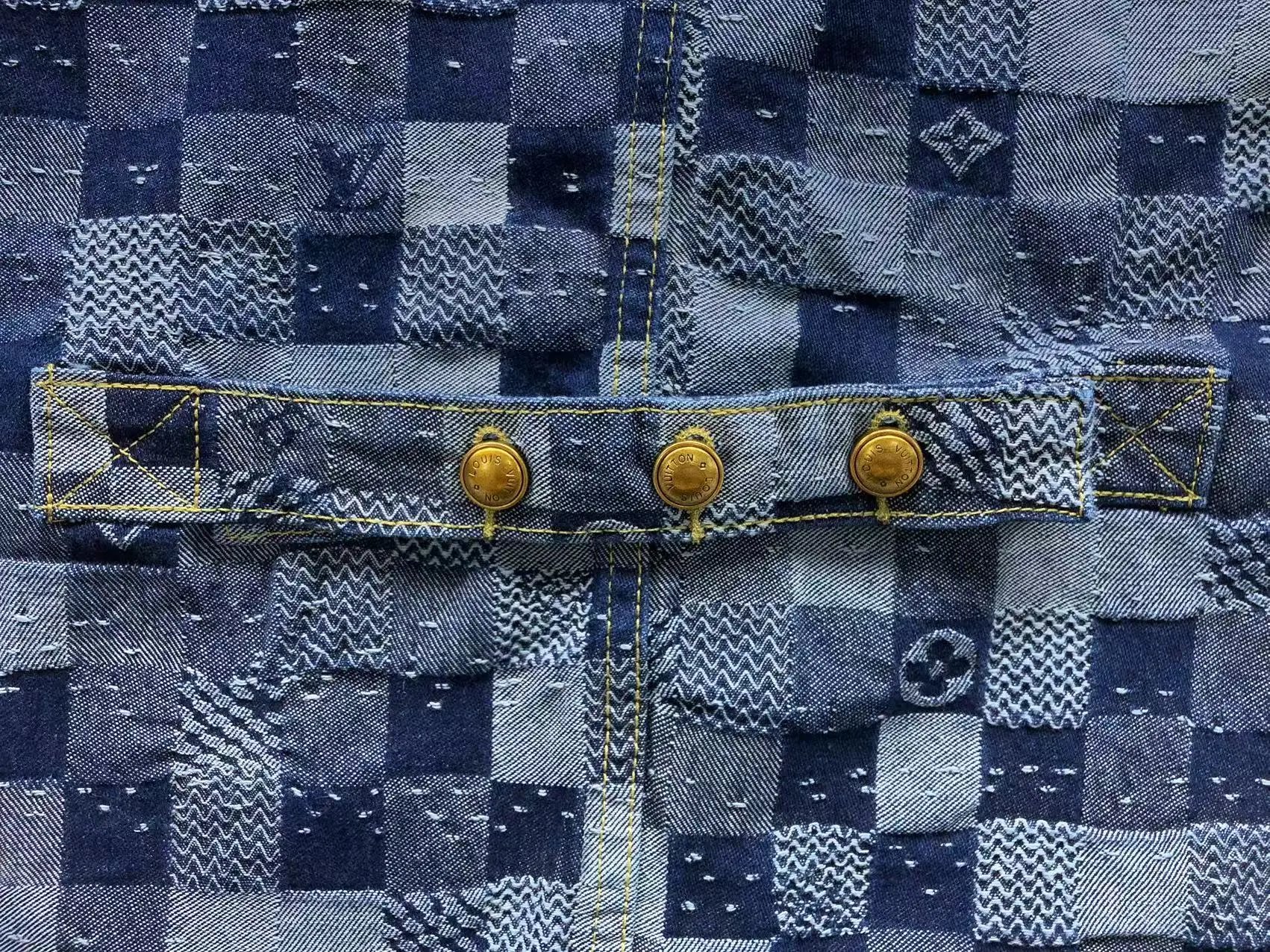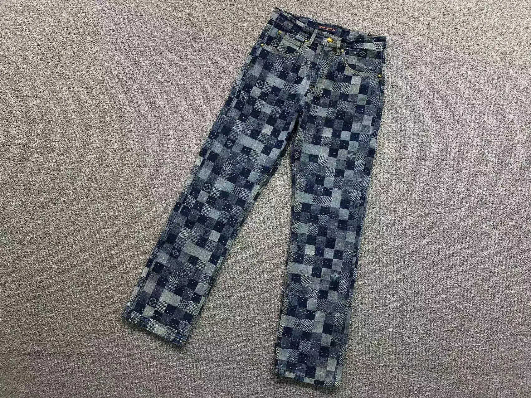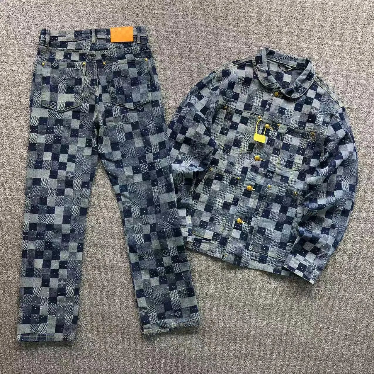 Luxury Louis Vuitton checkerboard denim set featuring a matching jacket and pants with iconic monogram details and gold-tone hardware.