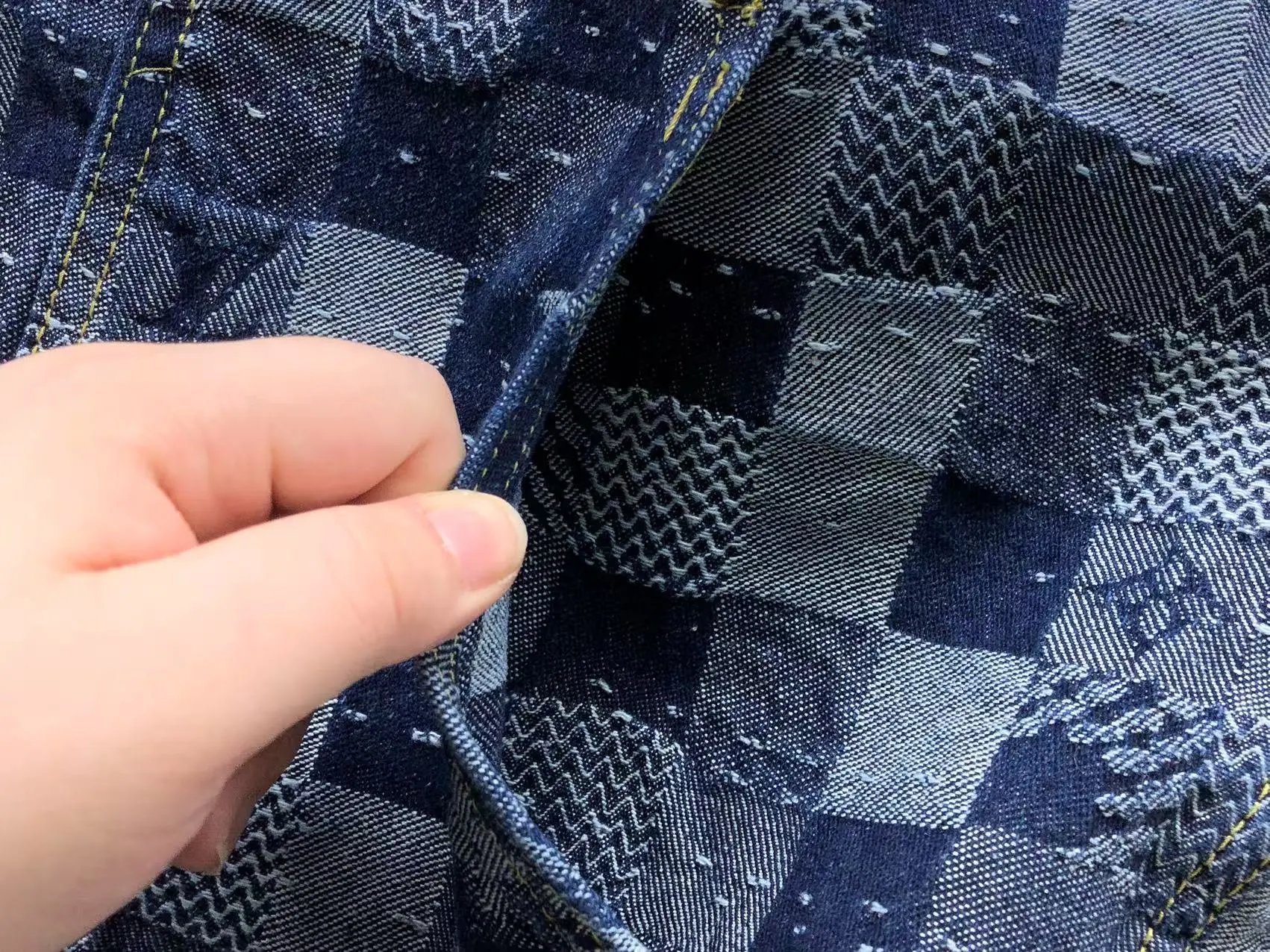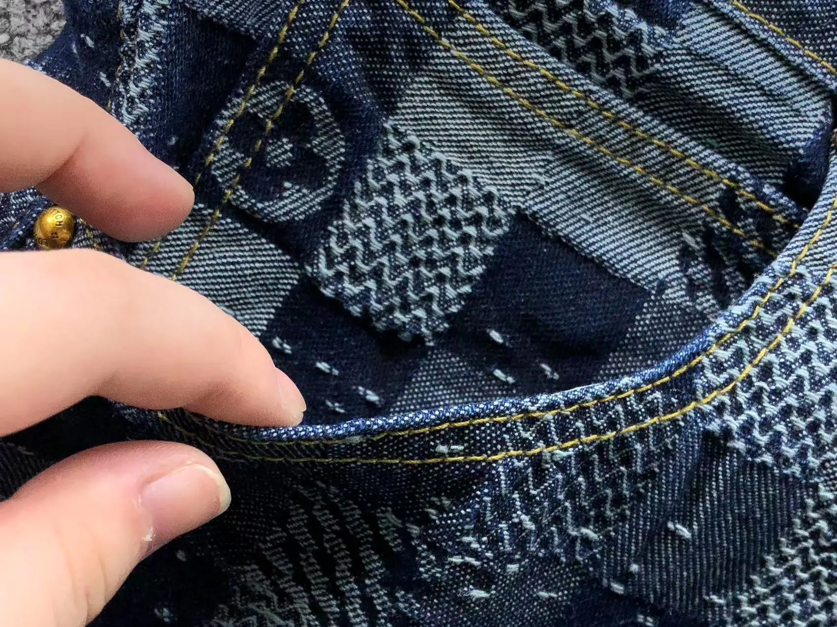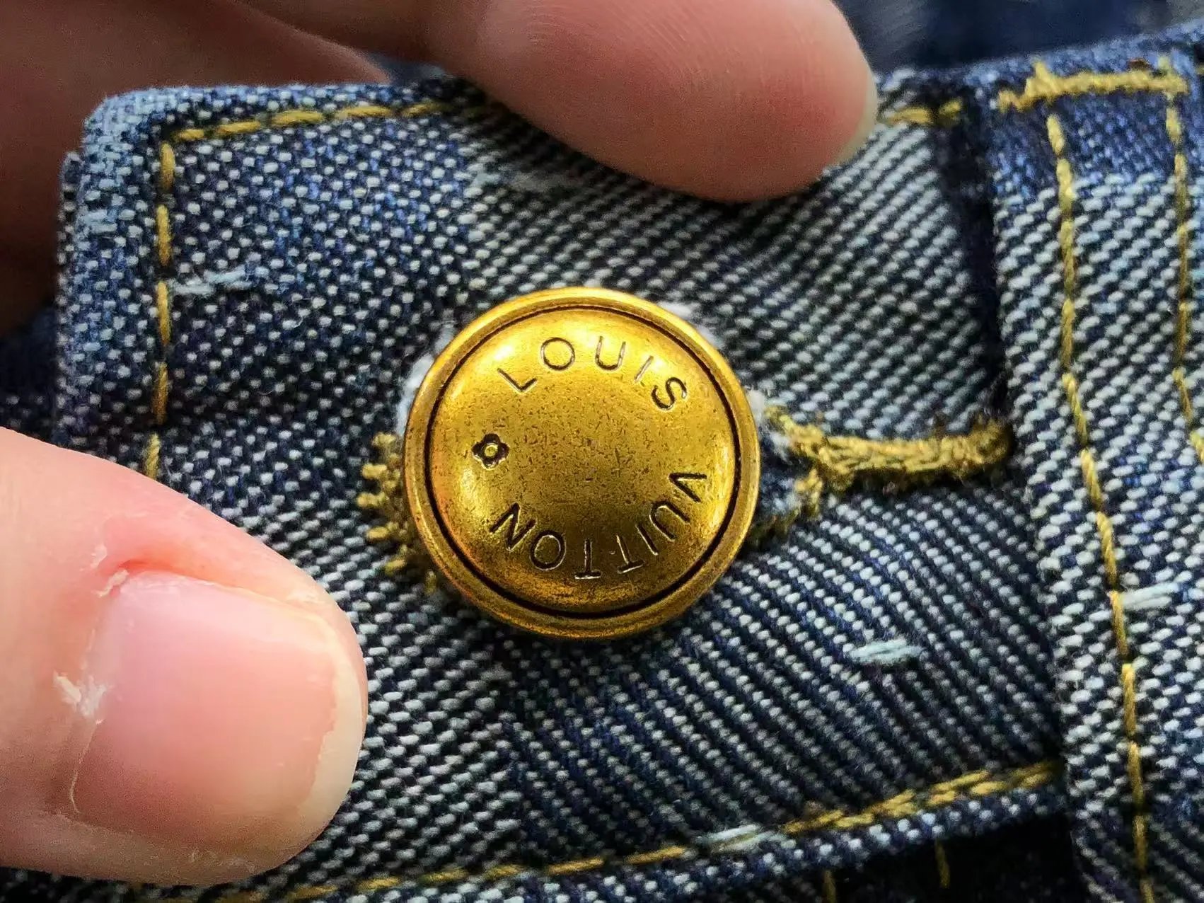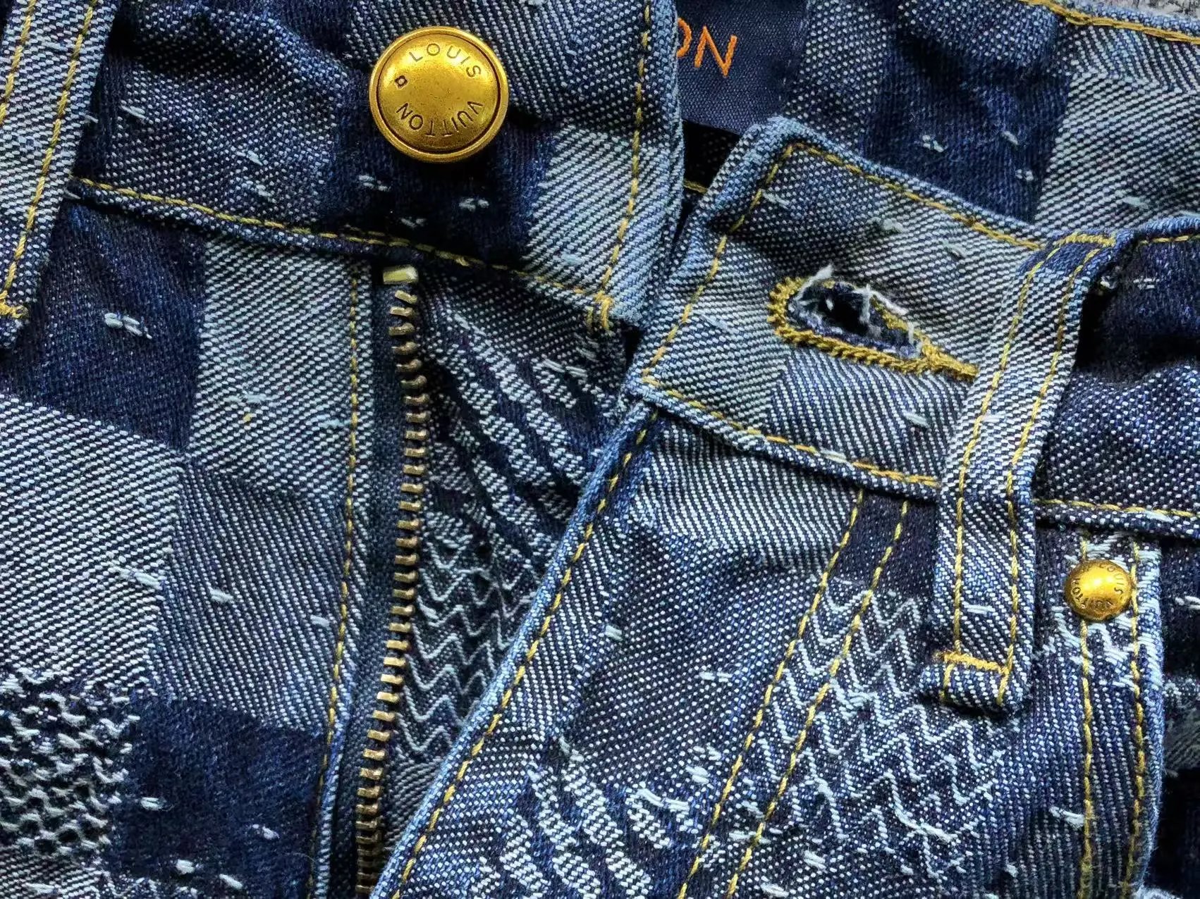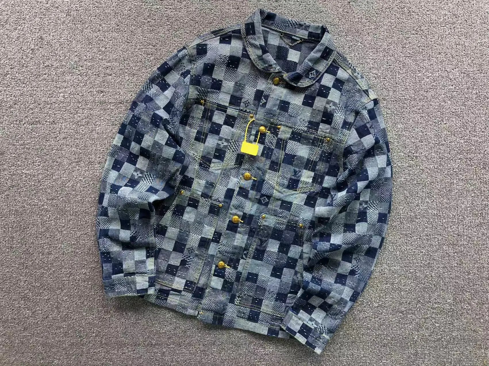 Luxury Louis Vuitton checkerboard denim set featuring a matching jacket and pants with iconic monogram details and gold-tone hardware.