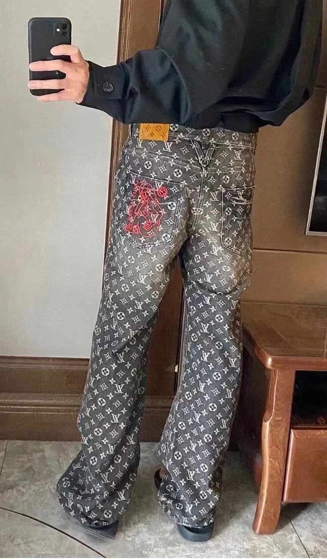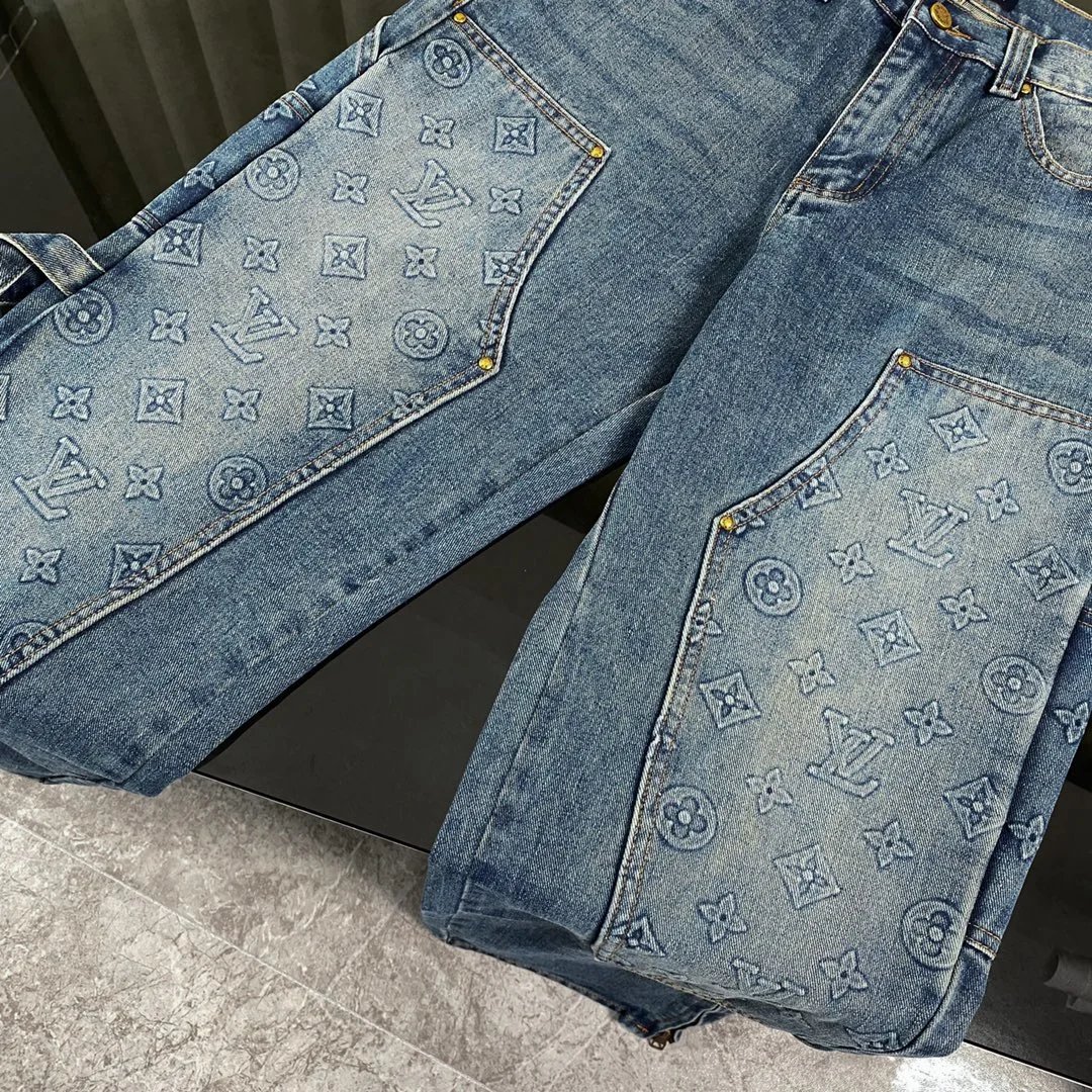 Premium Louis Vuitton denim jacket and jeans set featuring iconic monogram pattern. Crafted with high-quality denim for a stylish, luxurious look.