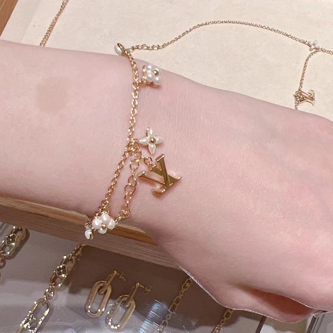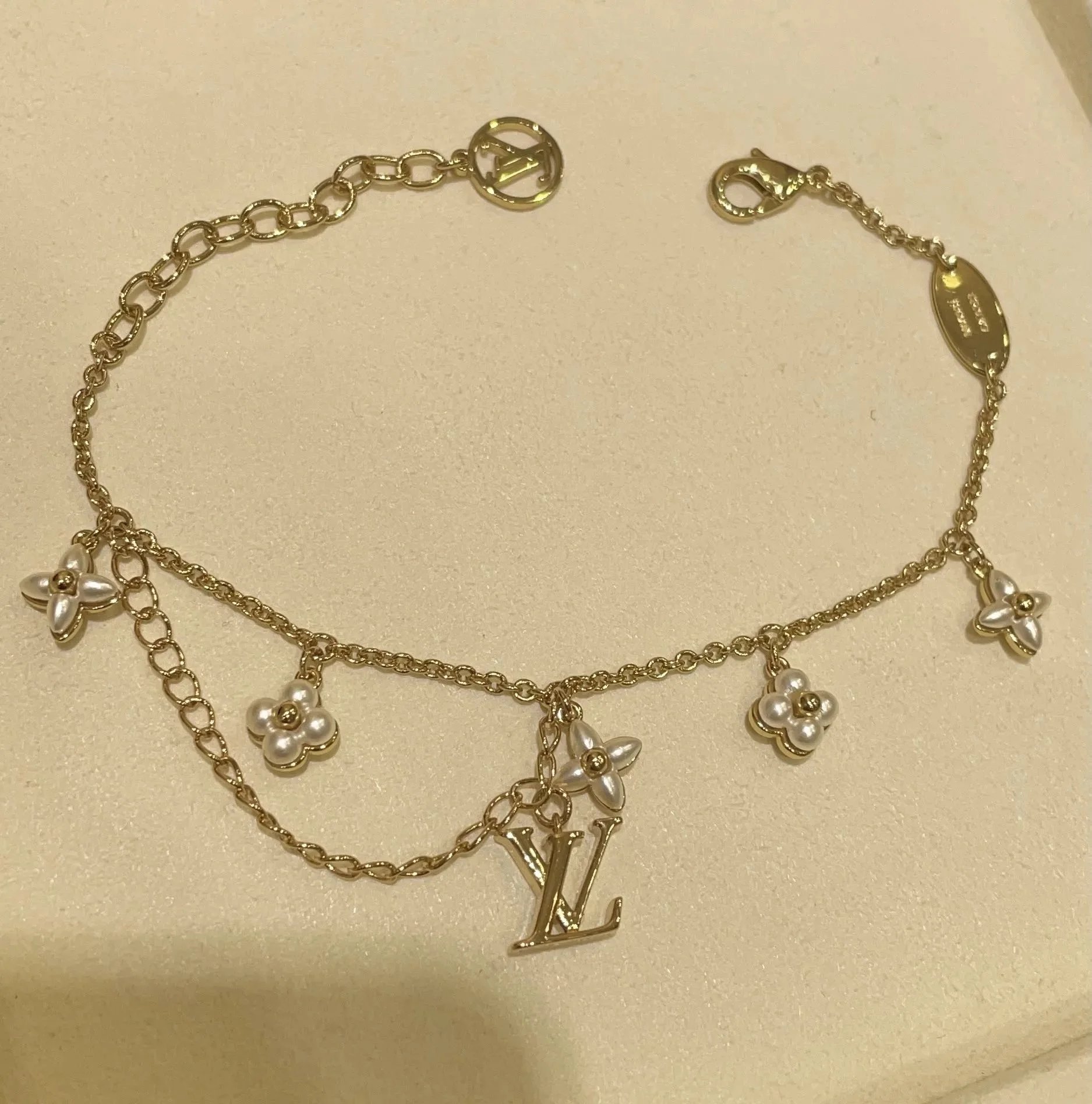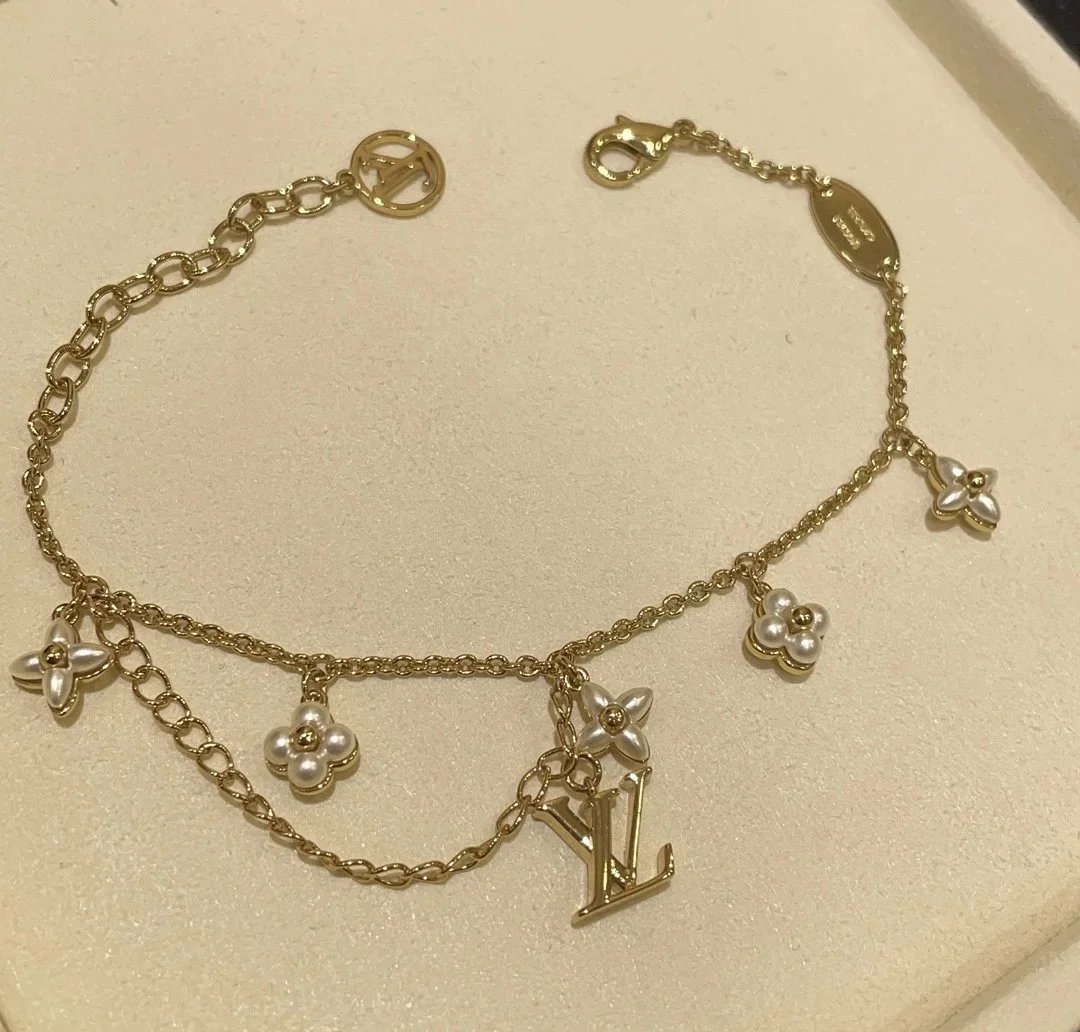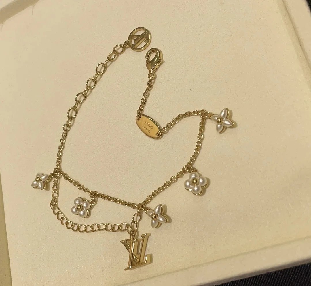 Elegant Louis Vuitton gold chain bracelet featuring pearl-embellished flower charms and a signature LV logo pendant. A luxurious accessory for timeless style.