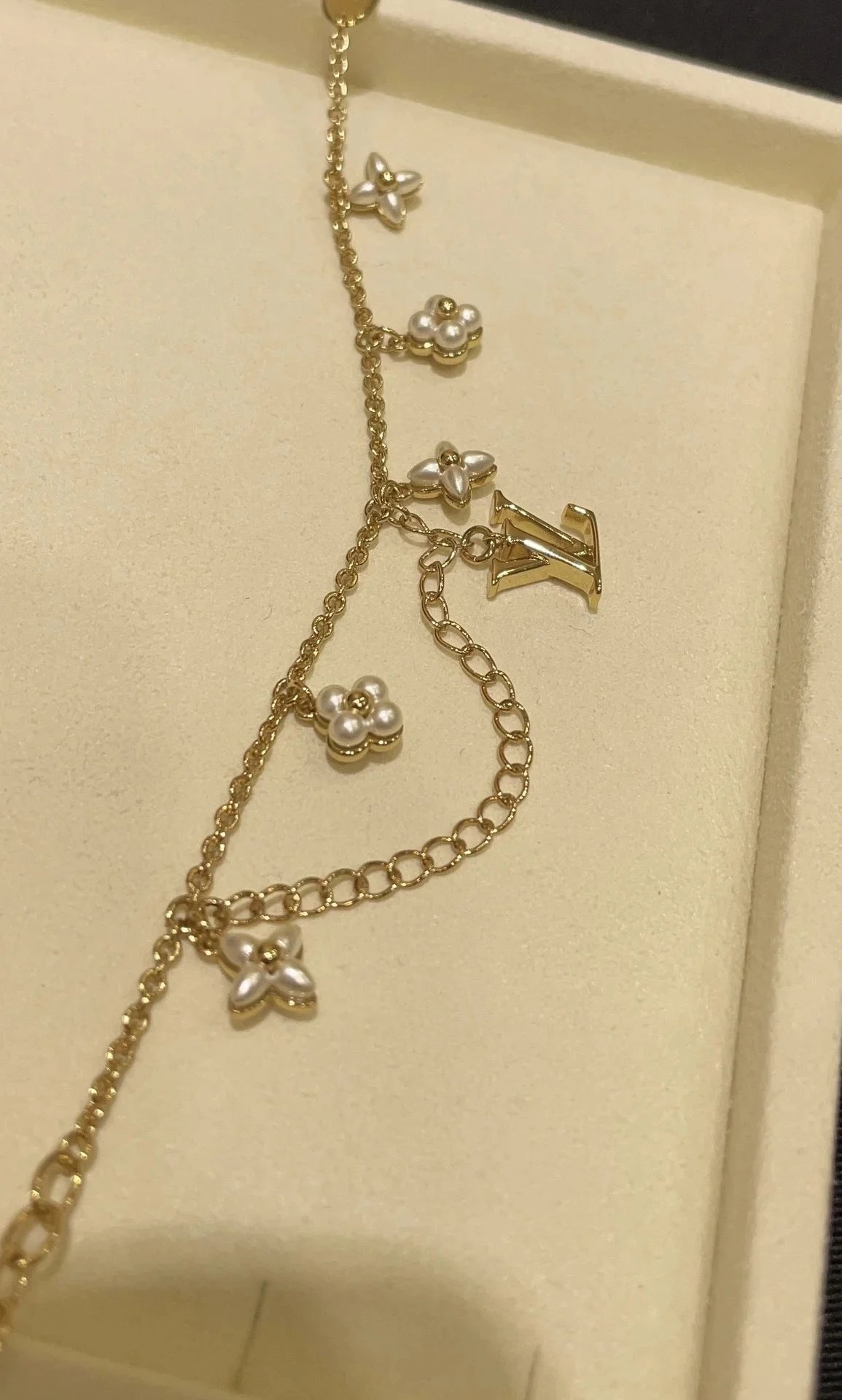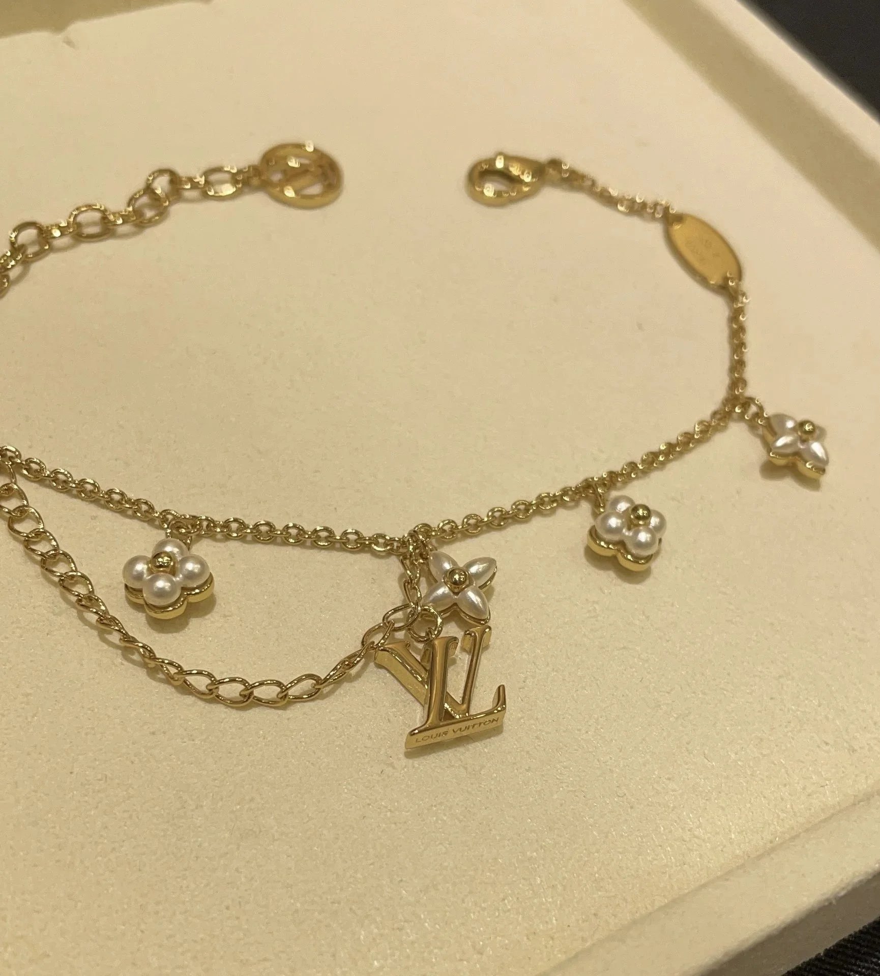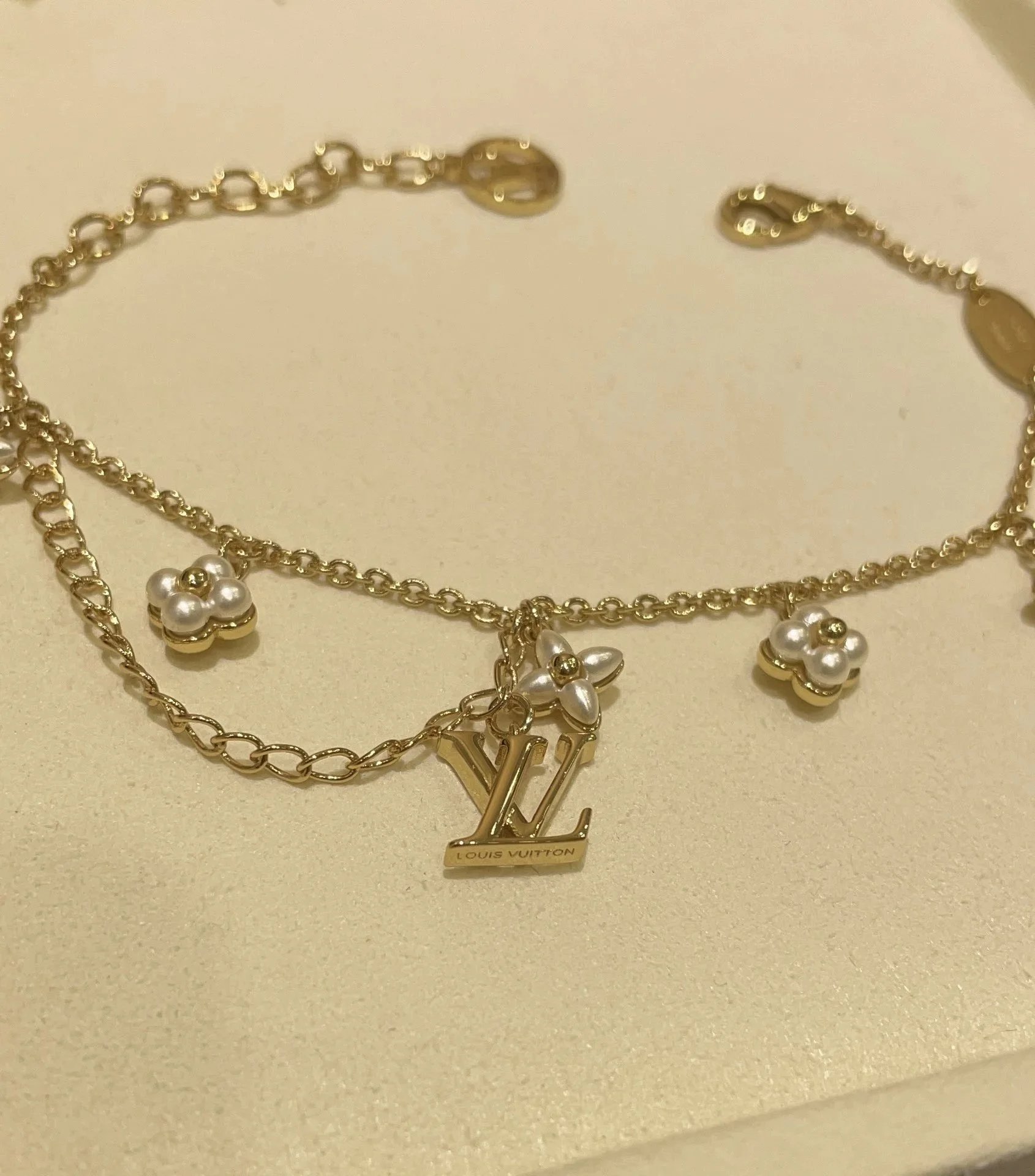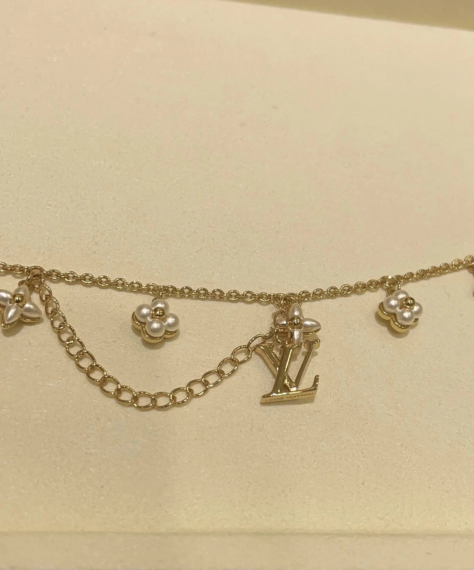 Elegant Louis Vuitton gold chain bracelet featuring pearl-embellished flower charms and a signature LV logo pendant. A luxurious accessory for timeless style.