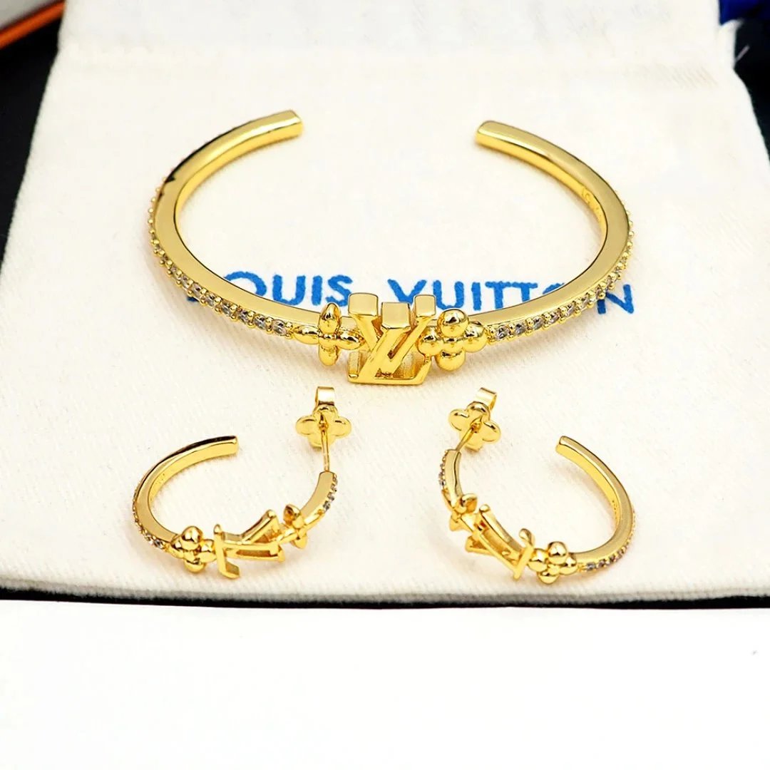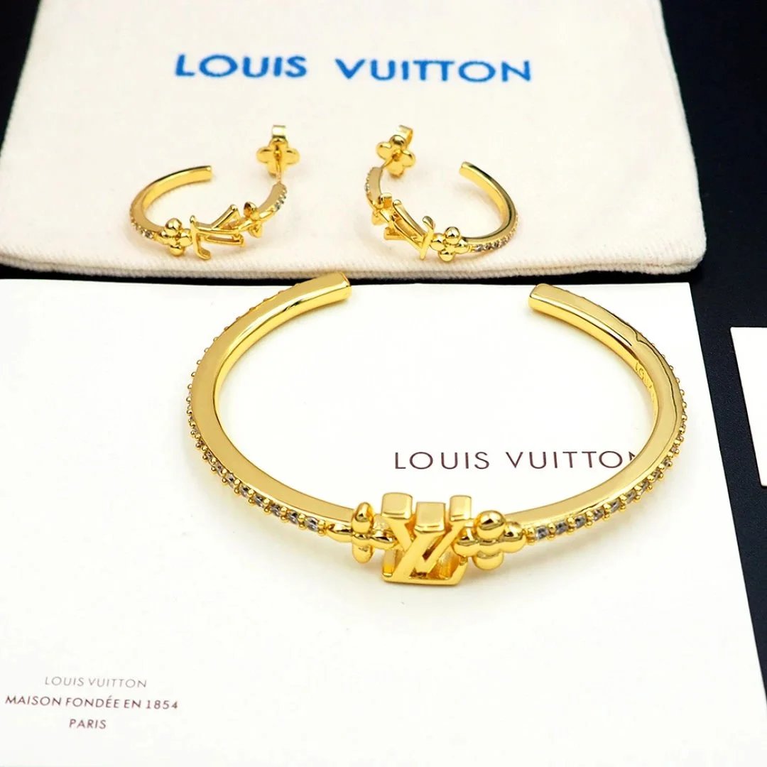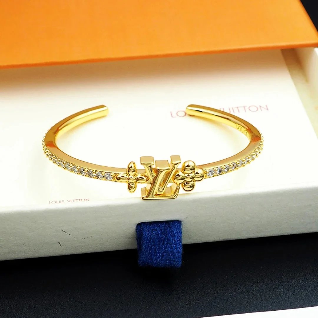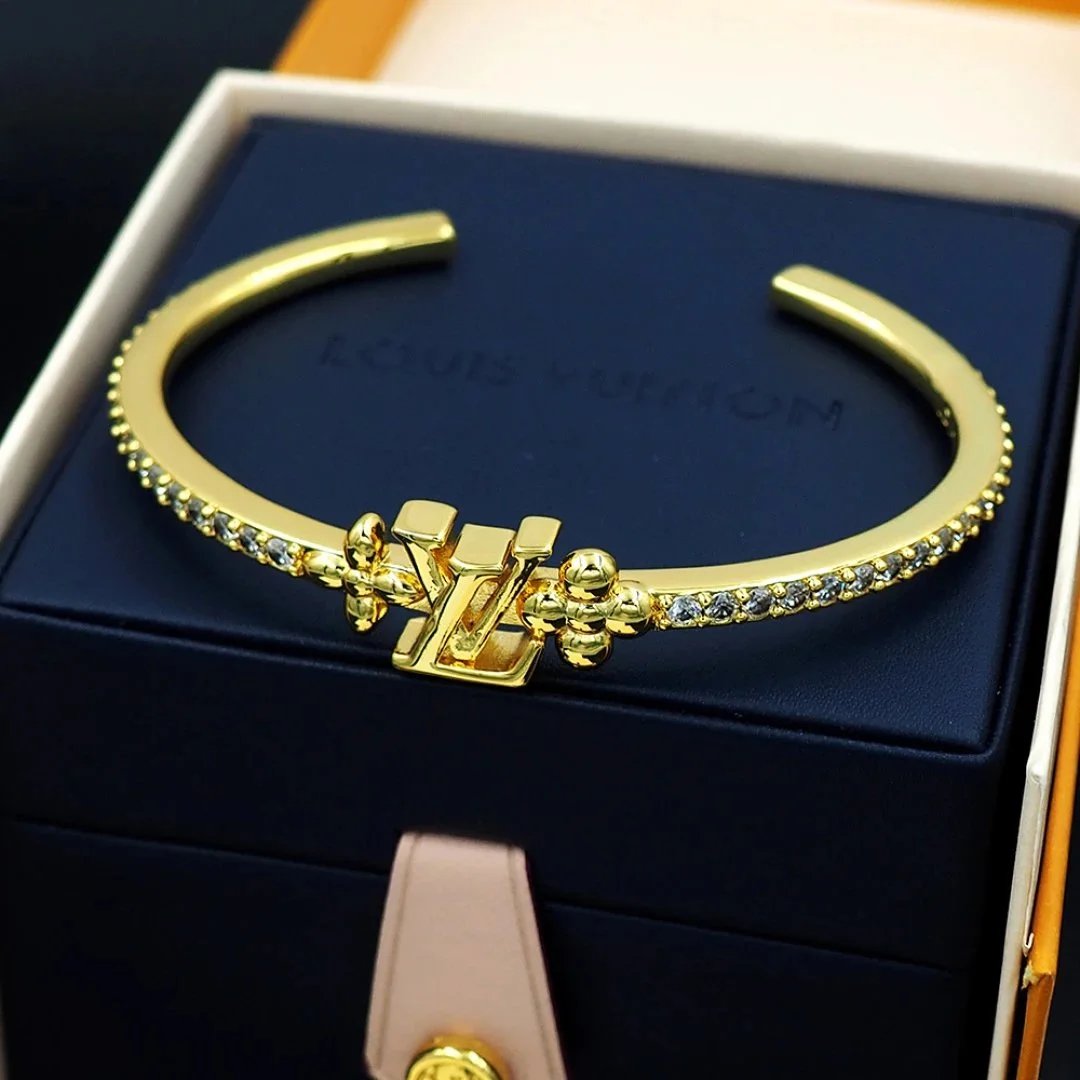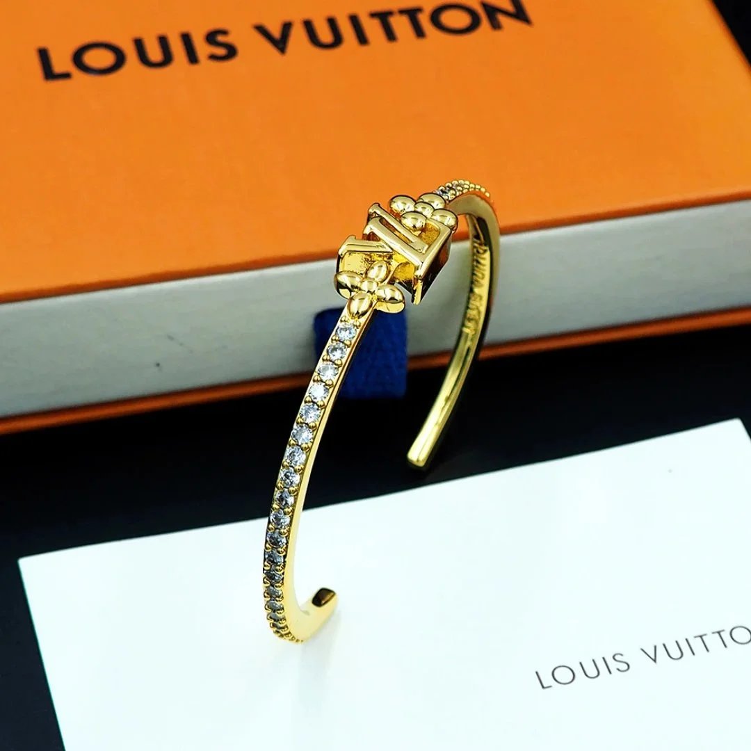 Elegant Louis Vuitton gold-tone bracelet featuring the iconic LV logo and sparkling crystal accents. A luxurious statement piece for any fashion-forward individual.