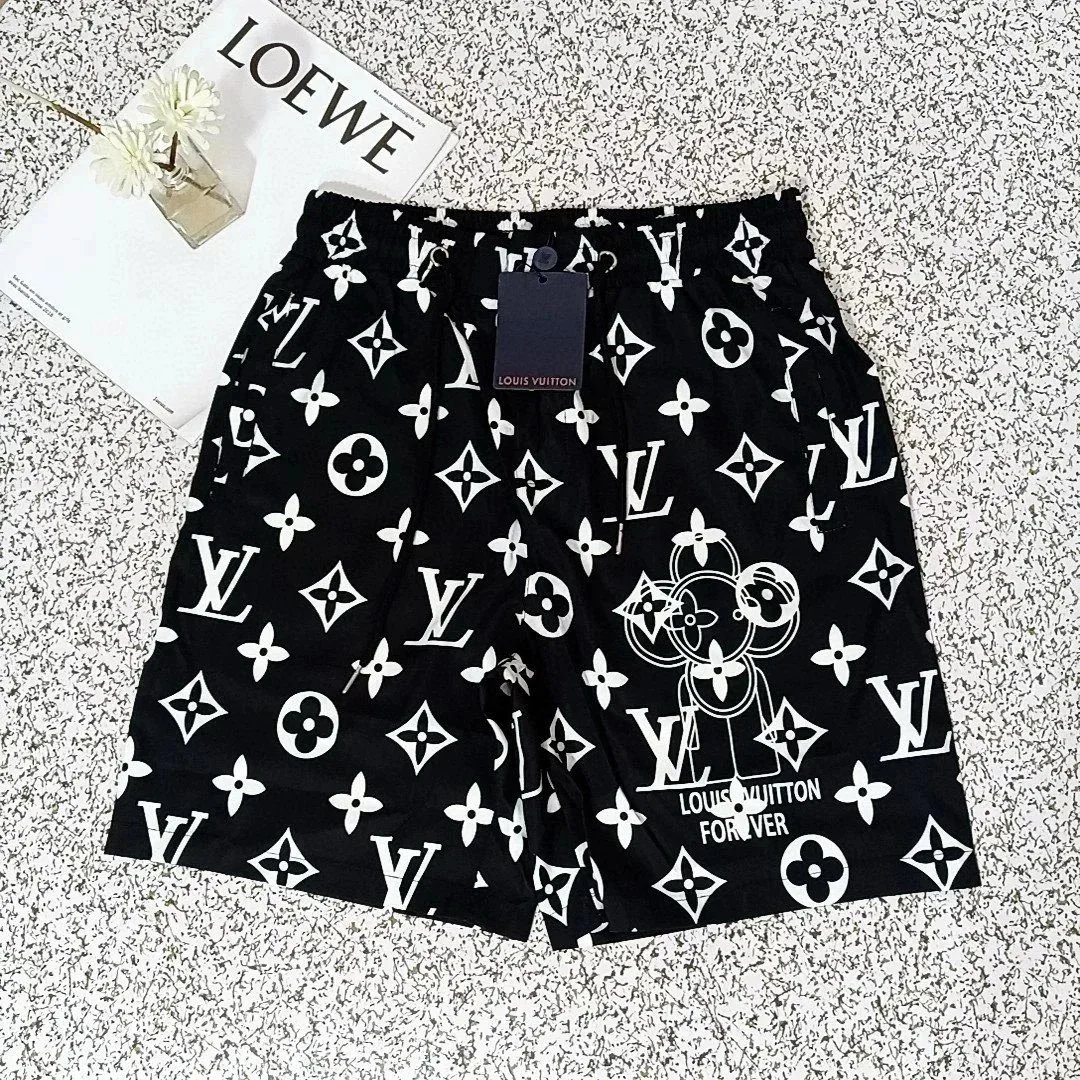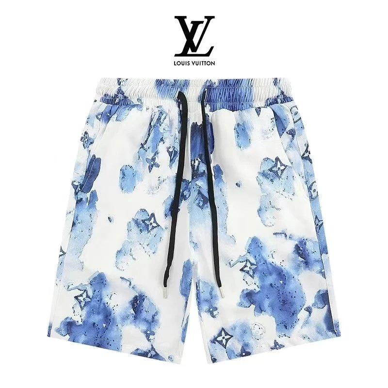 Premium Louis Vuitton-inspired gradient printed shorts featuring iconic monogram patterns and bold branding. Perfect for casual wear or beach outings.