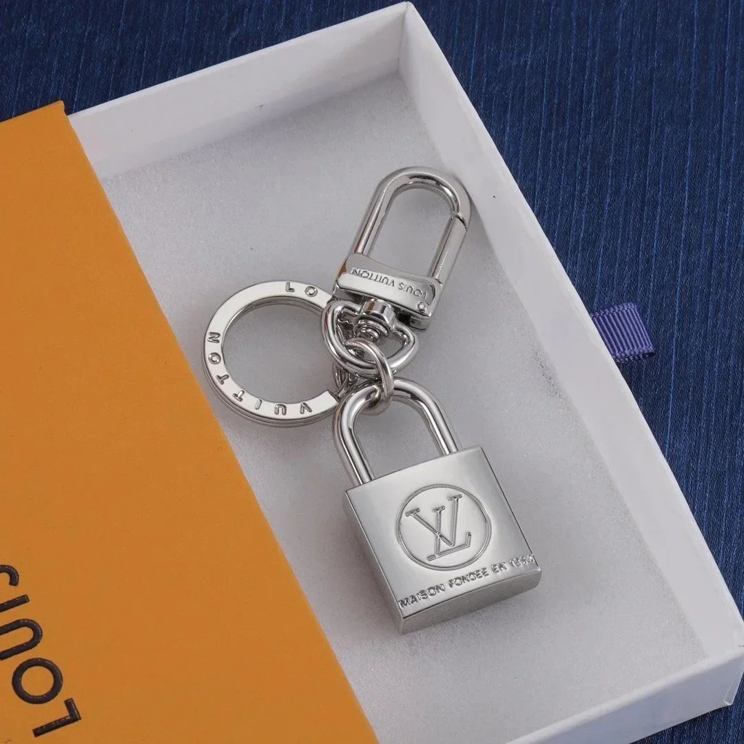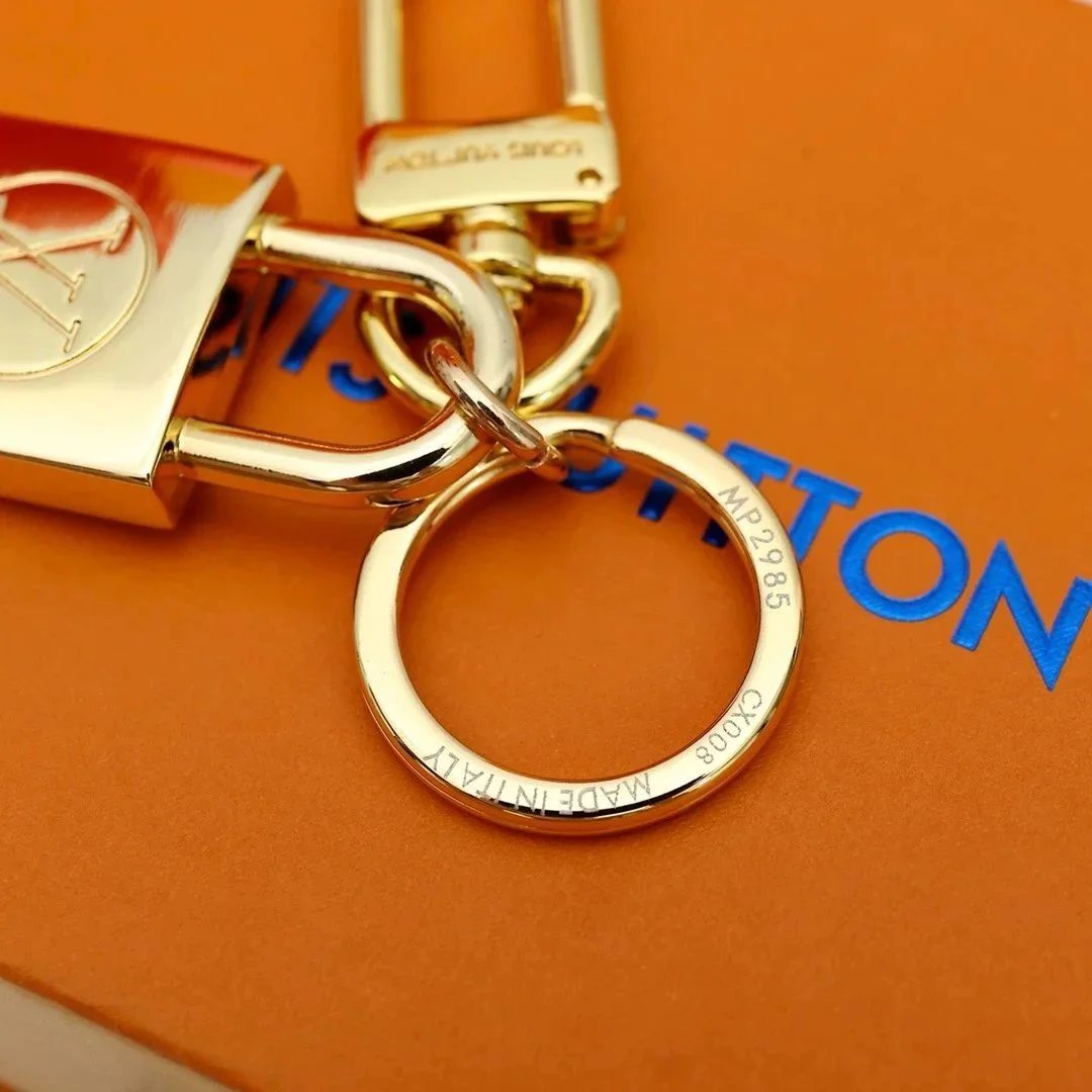 Stylish Louis Vuitton-inspired padlock keychains in gold and silver finishes featuring the iconic LV logo. Perfect for adding a touch of luxury to your keys or bag.