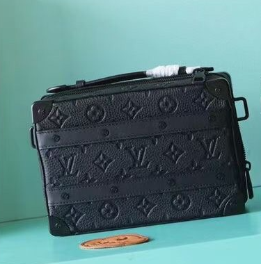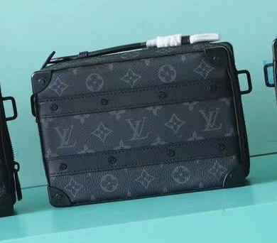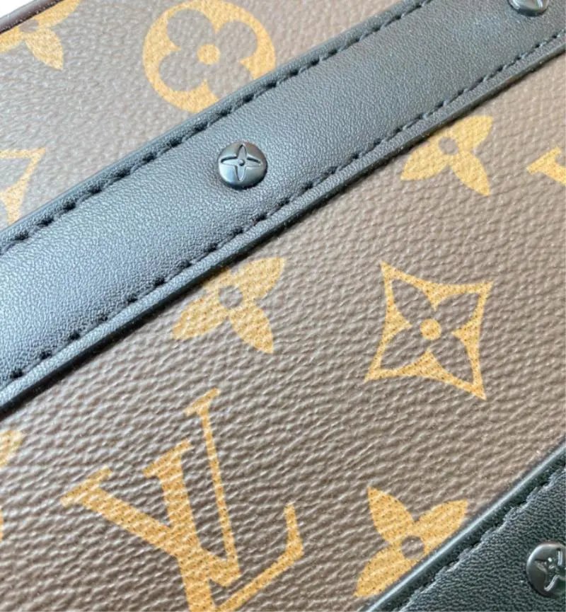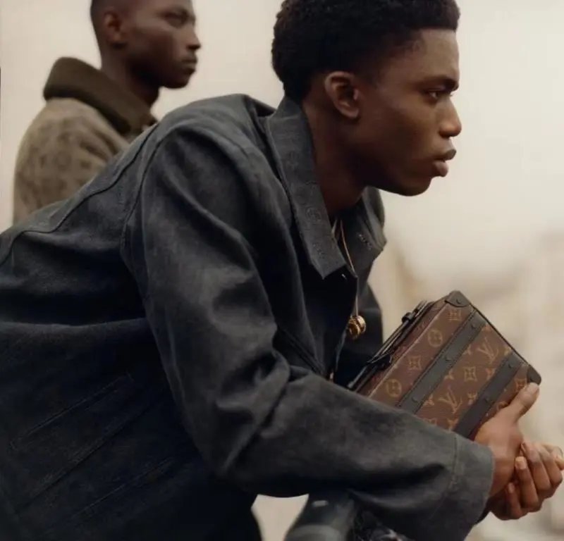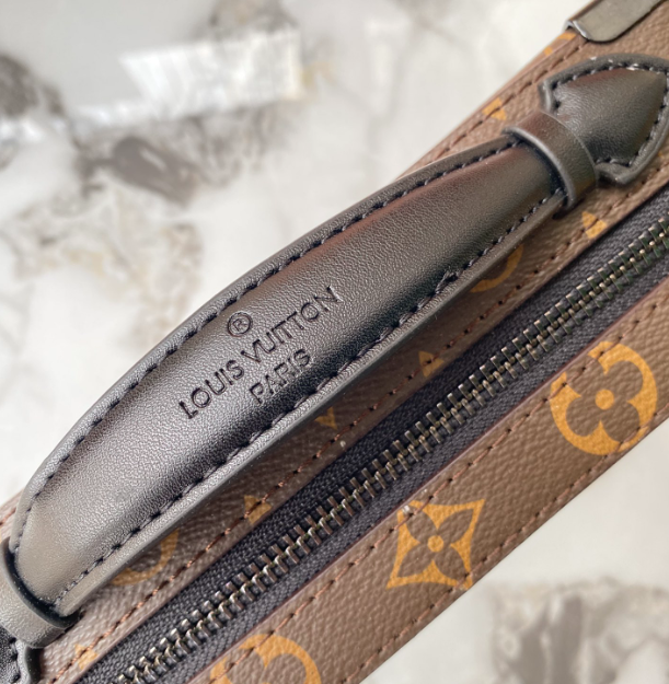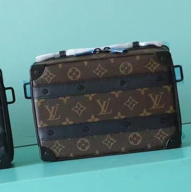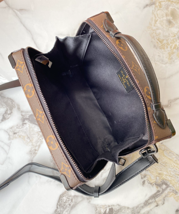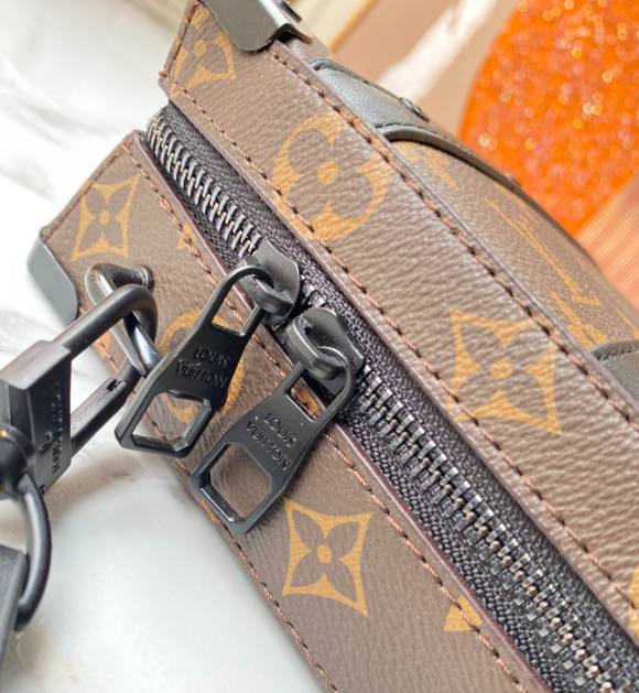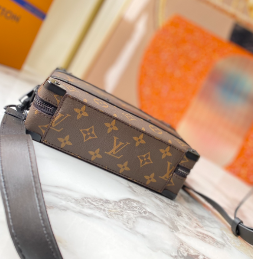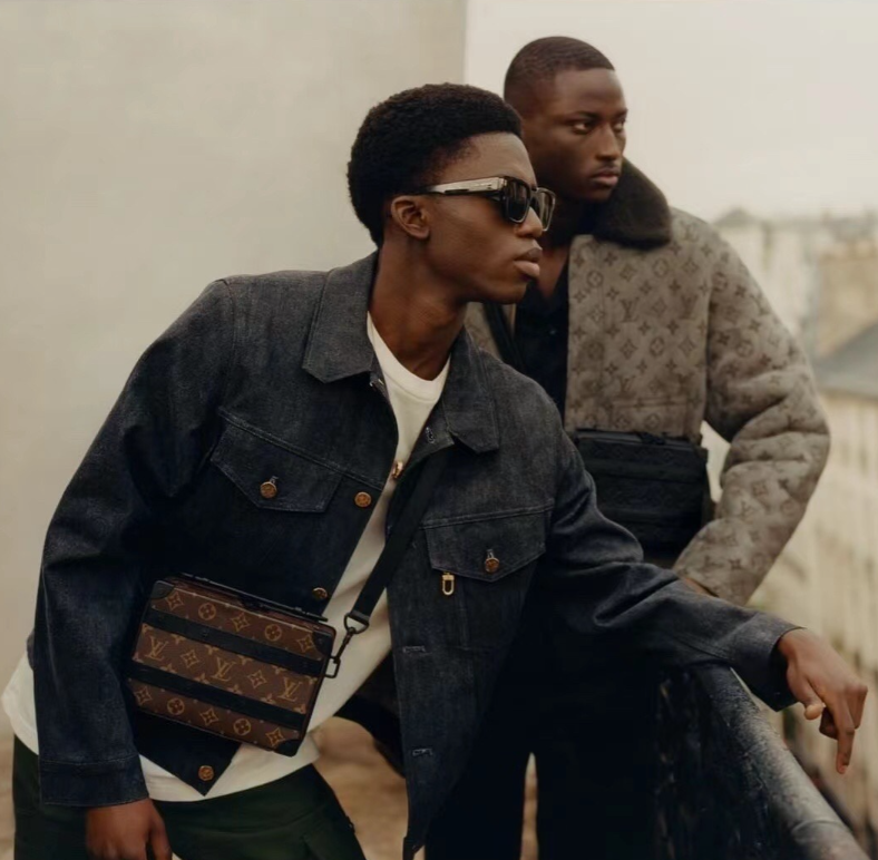 Elegant Louis Vuitton crossbody bag featuring iconic monogram pattern and brown leather accents, worn by models in a sophisticated setting. Ideal for urban style and high-end accessorizing.