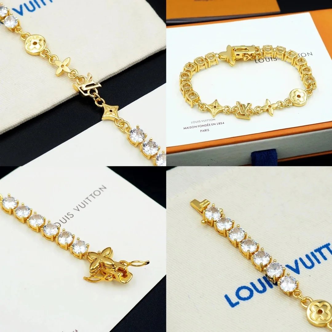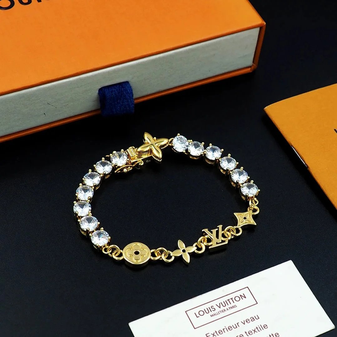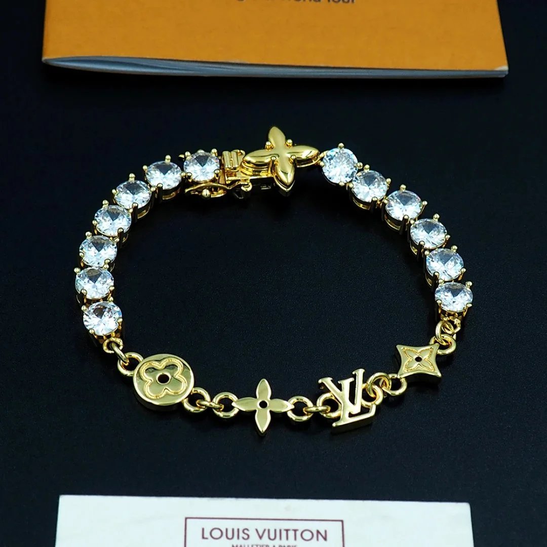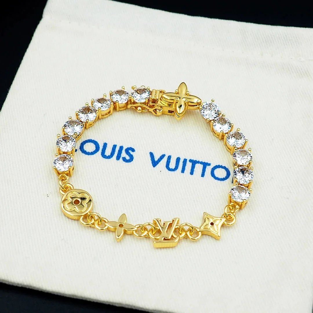 Elegant Louis Vuitton Monogram World Tour bracelet featuring gold-tone metal, sparkling crystals, and iconic LV motifs. A luxurious statement piece for fashion-forward individuals.