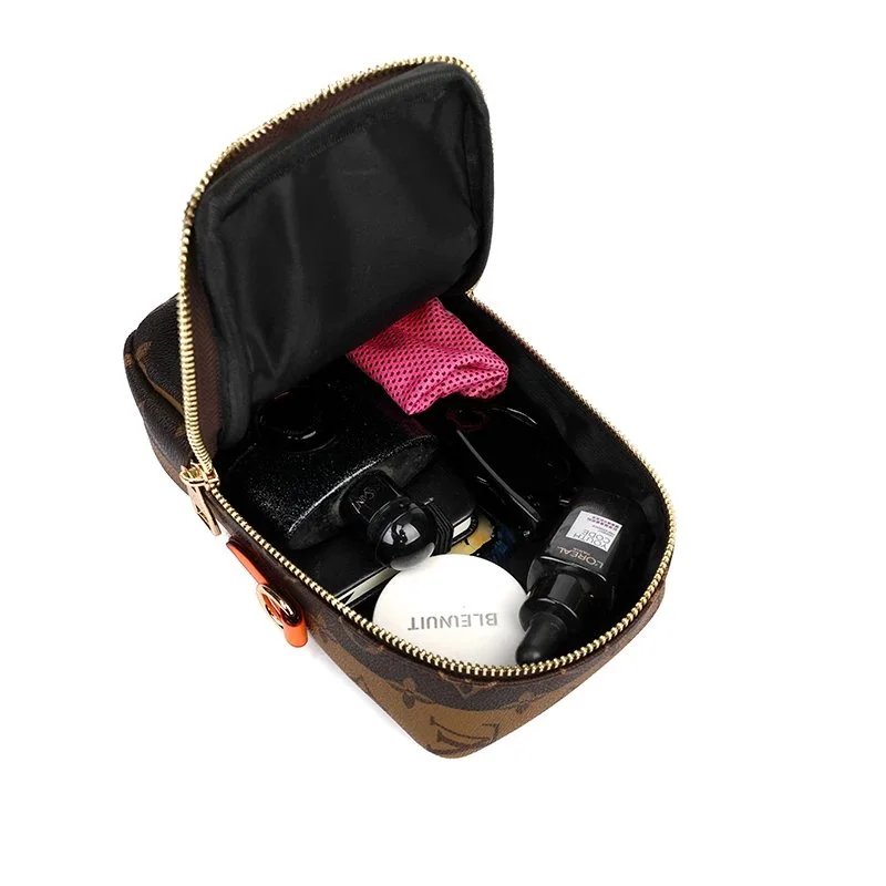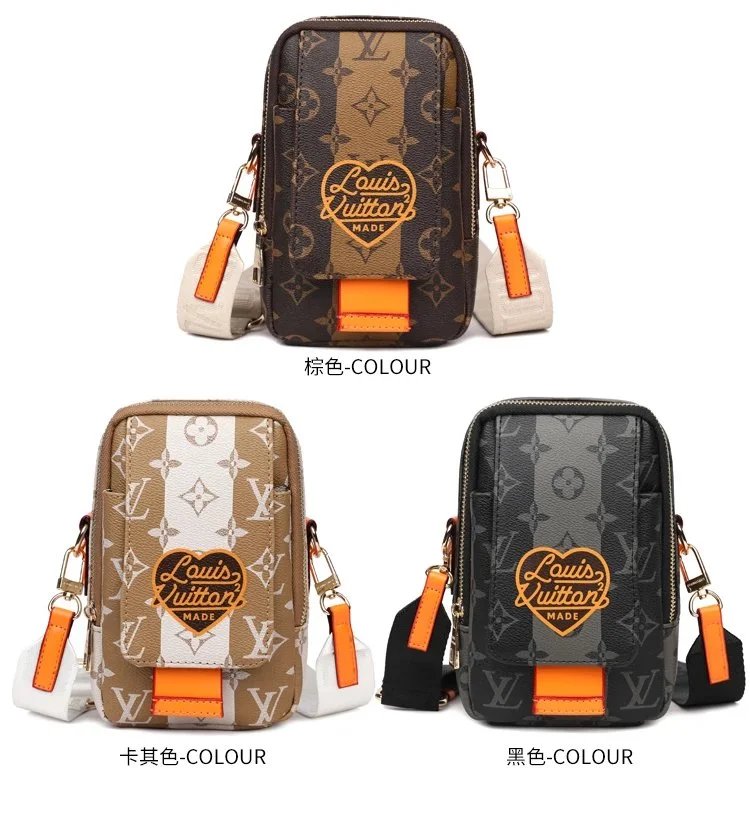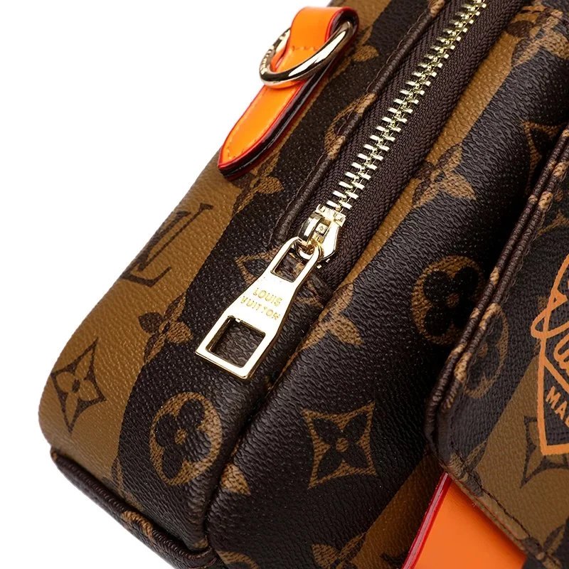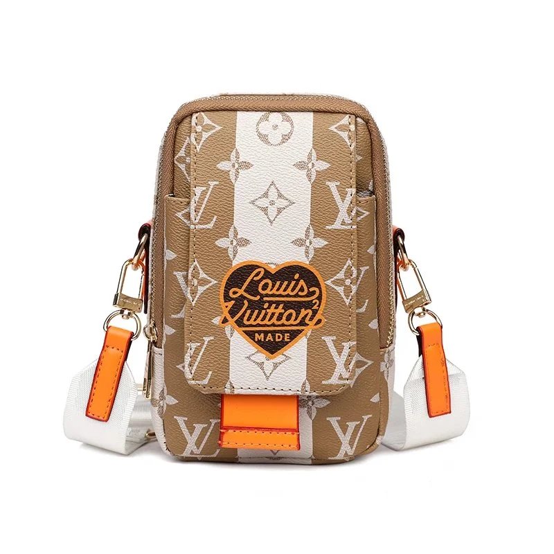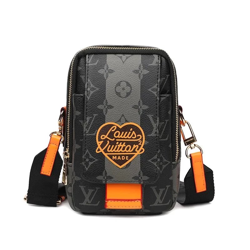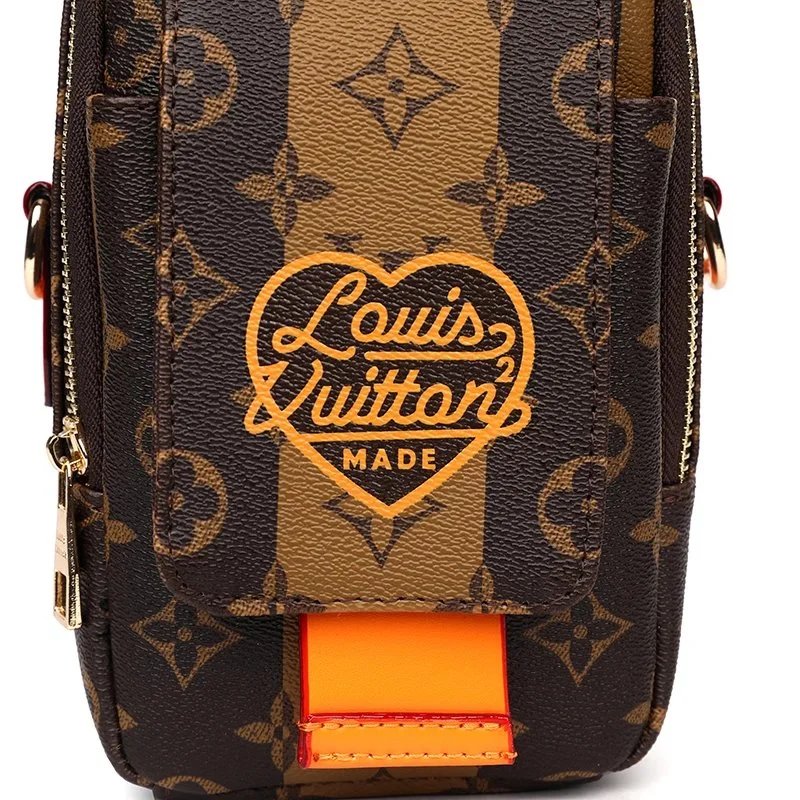 Elegant Louis Vuitton crossbody bag featuring the iconic monogram canvas with a distinctive heart-shaped logo and vibrant orange details. Perfect for stylish everyday wear.