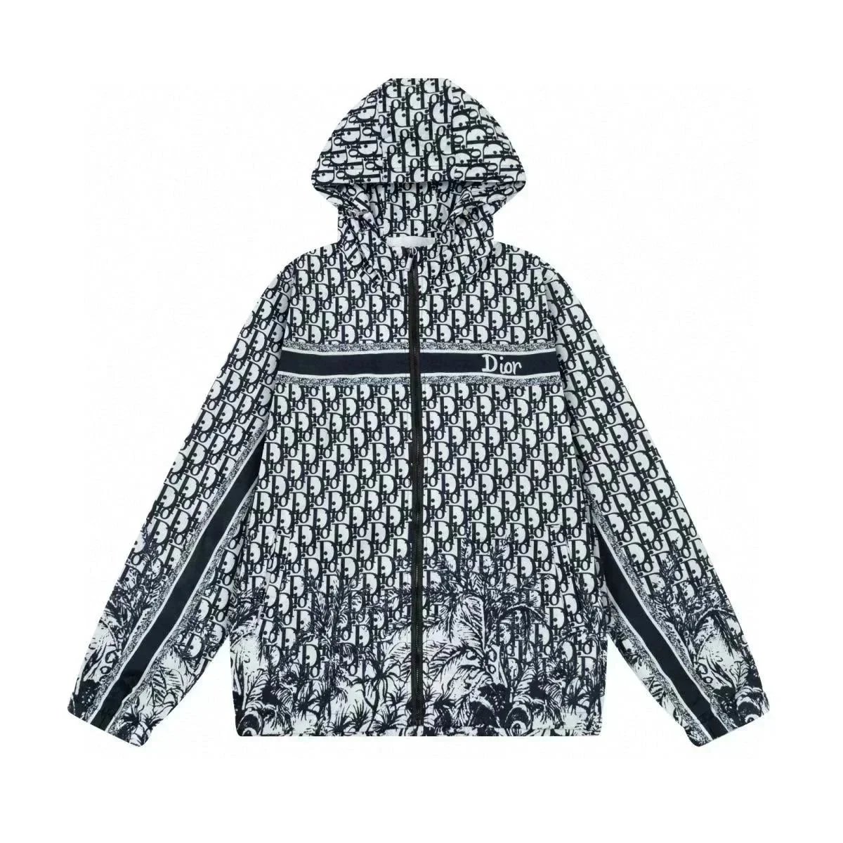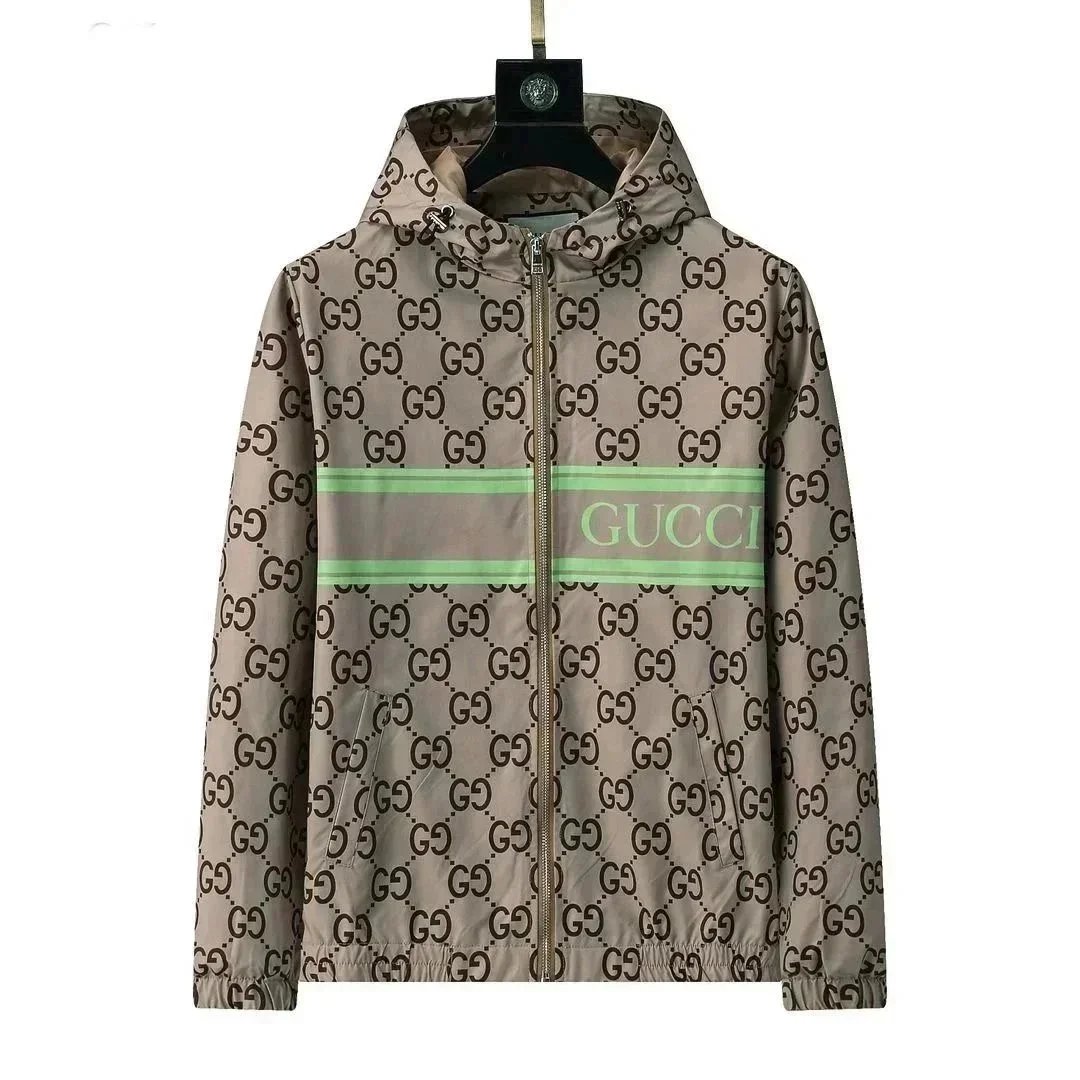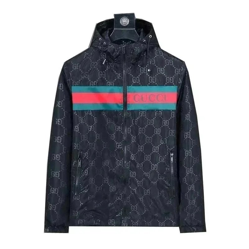 Premium Louis Vuitton monogram hooded windbreaker jackets in black, navy, and beige. Featuring iconic LV patterns, full-zip design, and drawstring hood for stylish, functional wear.