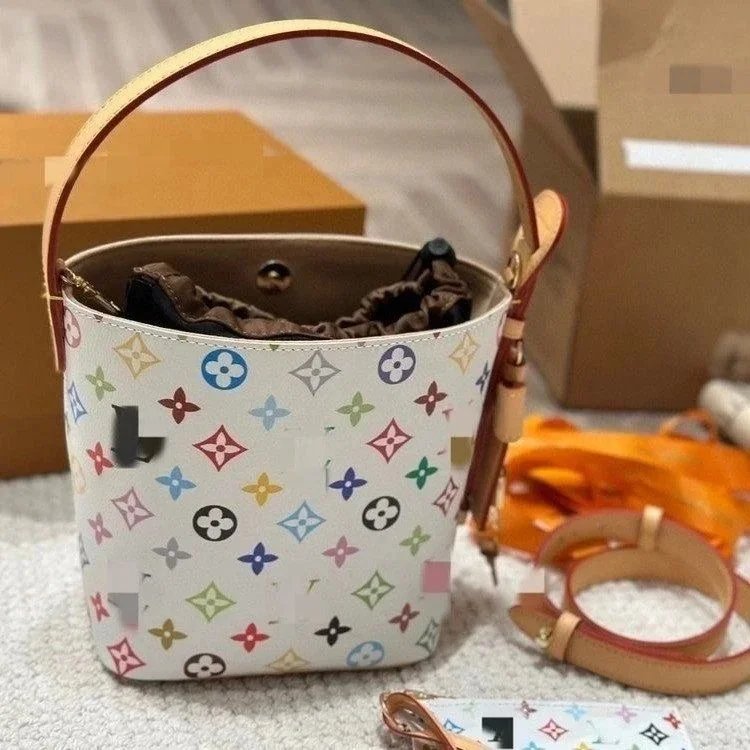 Elegant Louis Vuitton Monogram Multicolor handbag in white with vibrant floral patterns and premium tan leather handles. A timeless luxury accessory for everyday style.