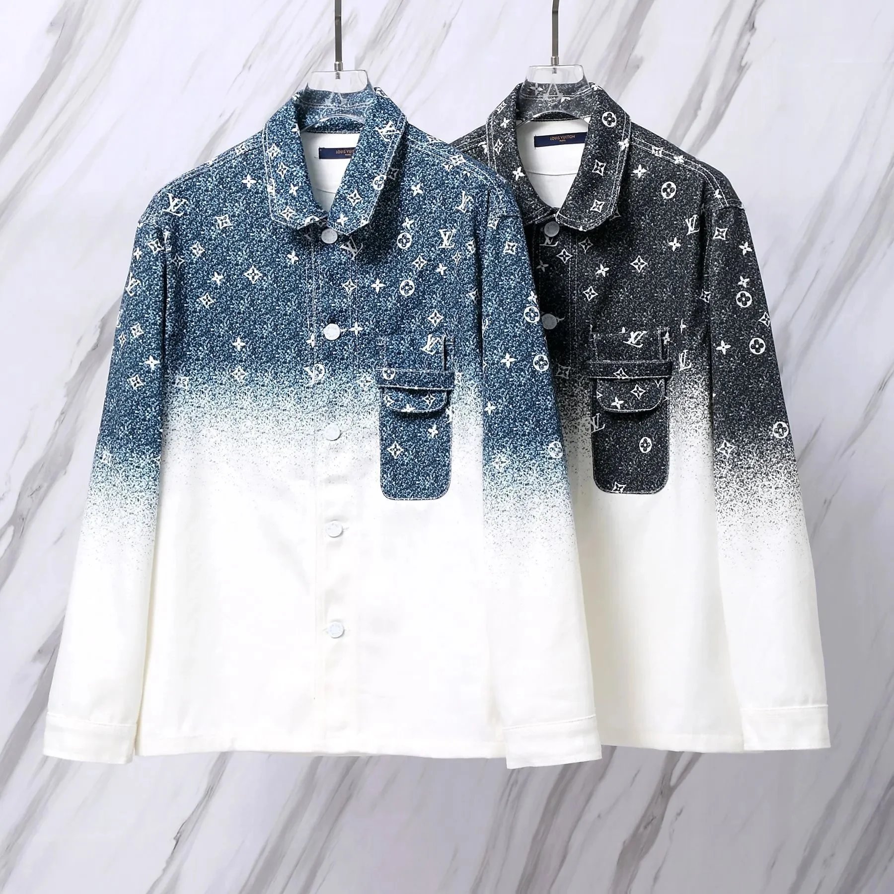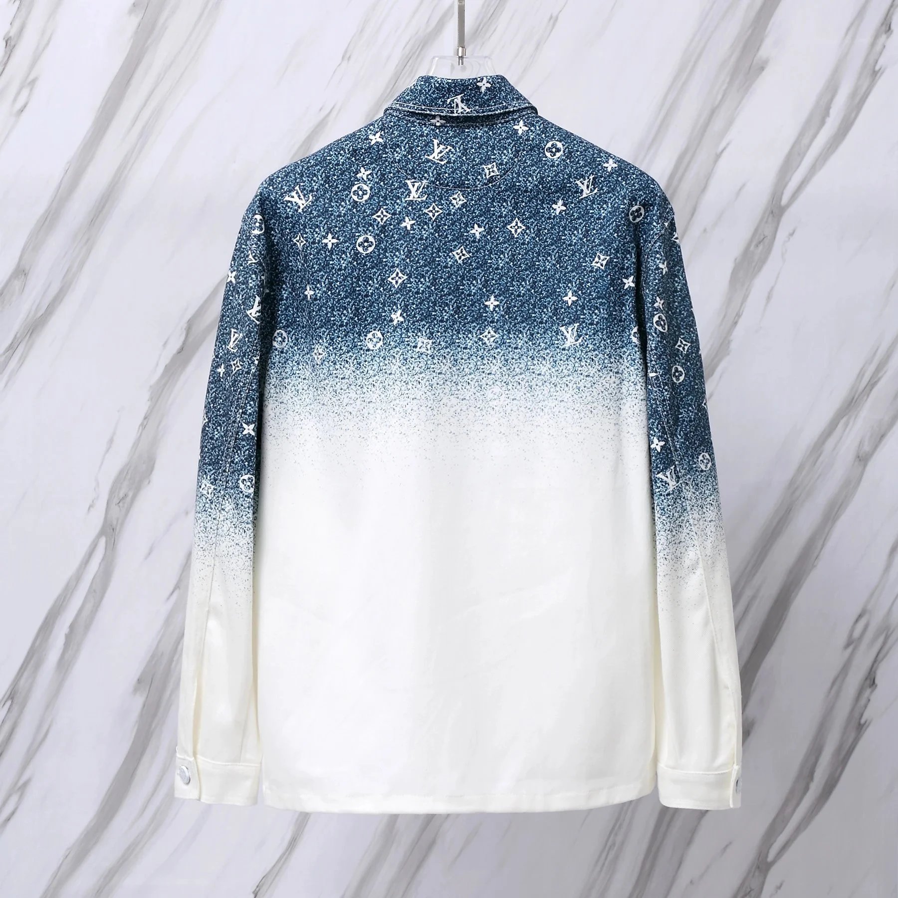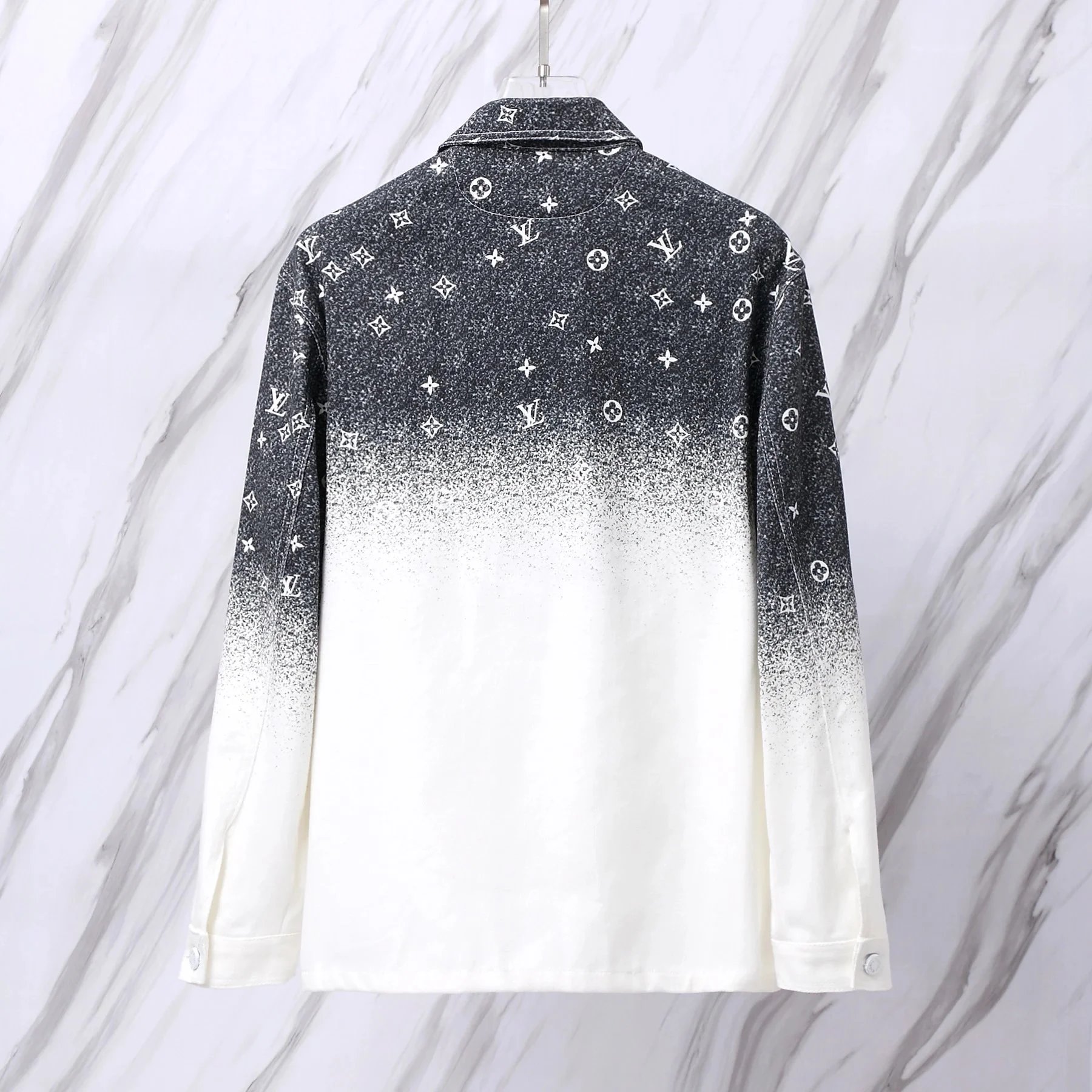 Elevate your wardrobe with this iconic Louis Vuitton monogram ombre button-up shirt featuring a gradient design and signature pattern. Perfect for a bold, luxurious look.