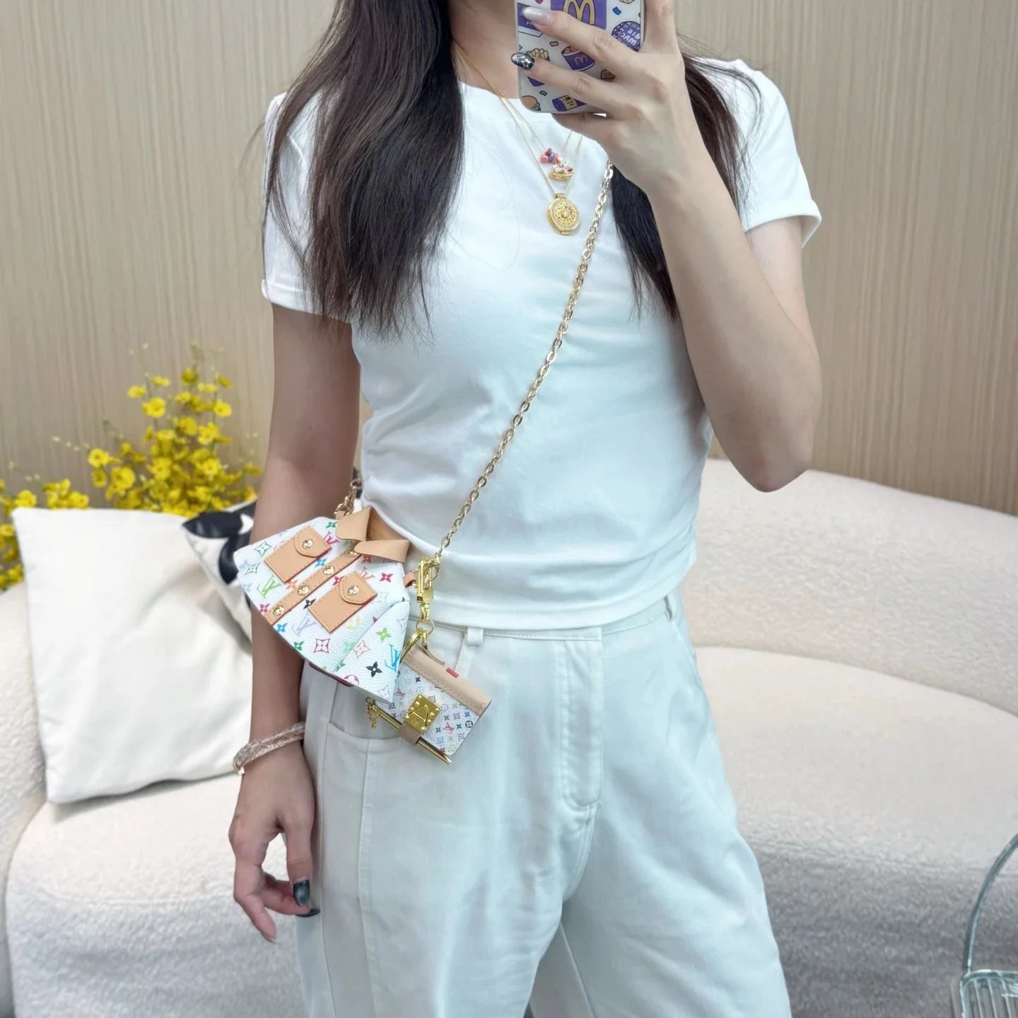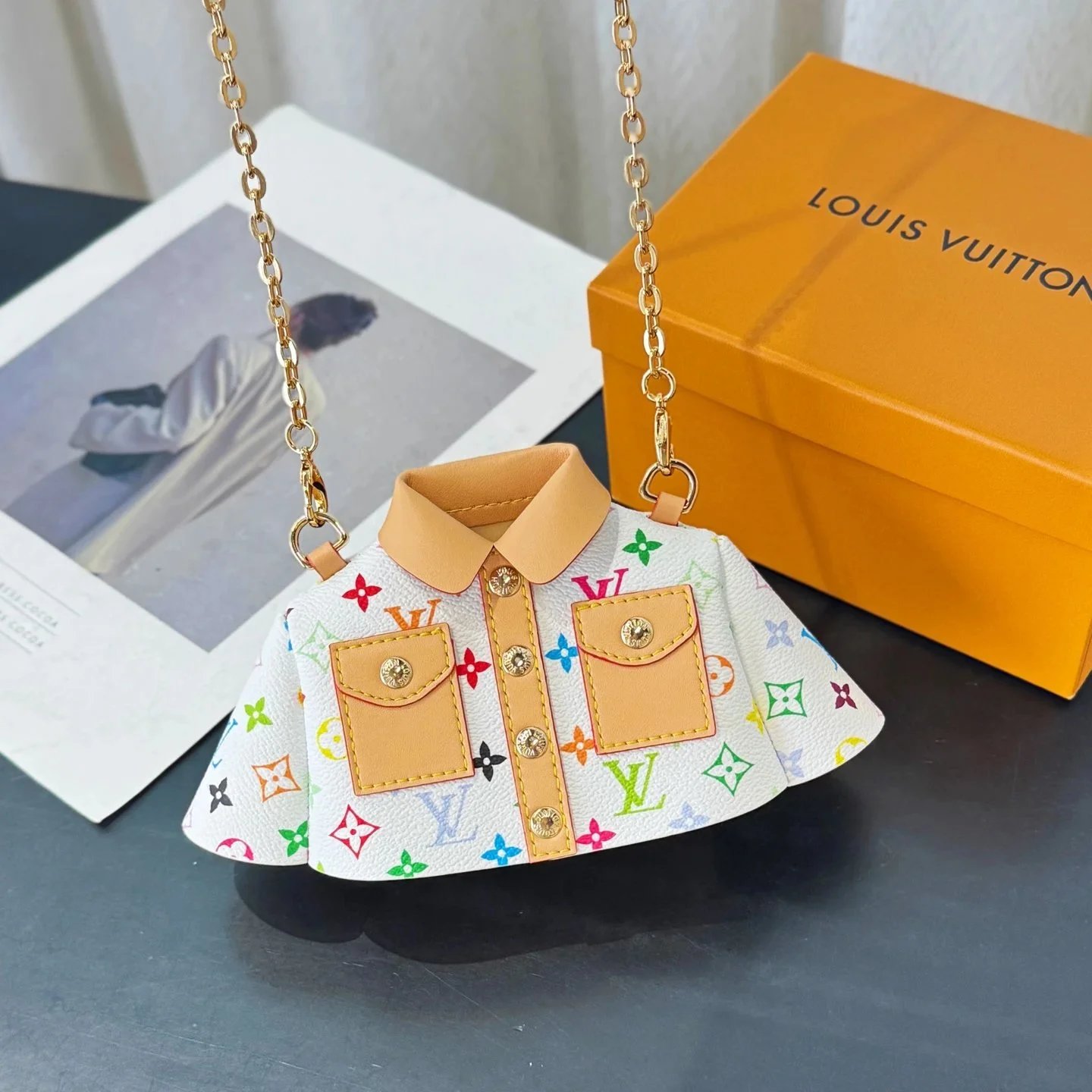 Luxury Louis Vuitton mini shirt-shaped bag featuring iconic multicolor monogram canvas, tan leather accents, and gold-tone hardware. Includes detachable gold chain strap for versatile wear.