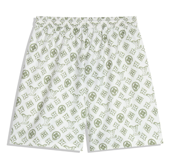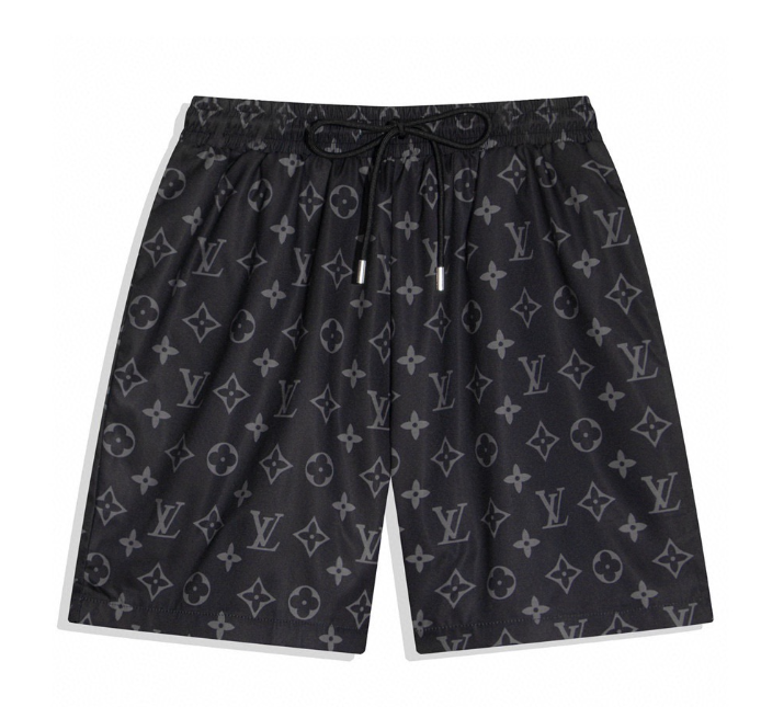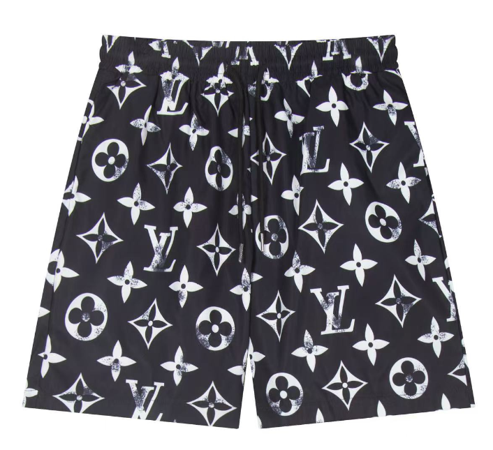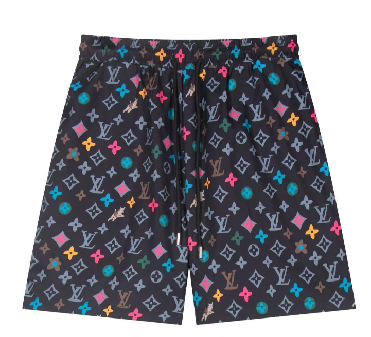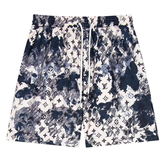 Navy blue Louis Vuitton swim shorts featuring iconic monogram side stripes, a large embroidered LV logo, and a drawstring waist for comfort and style.
