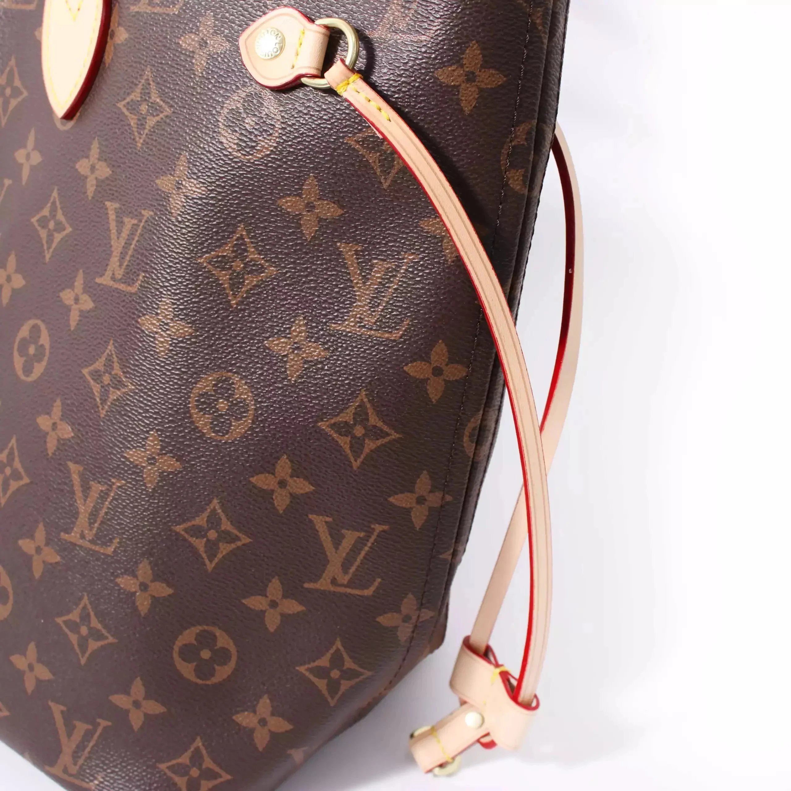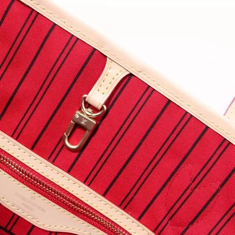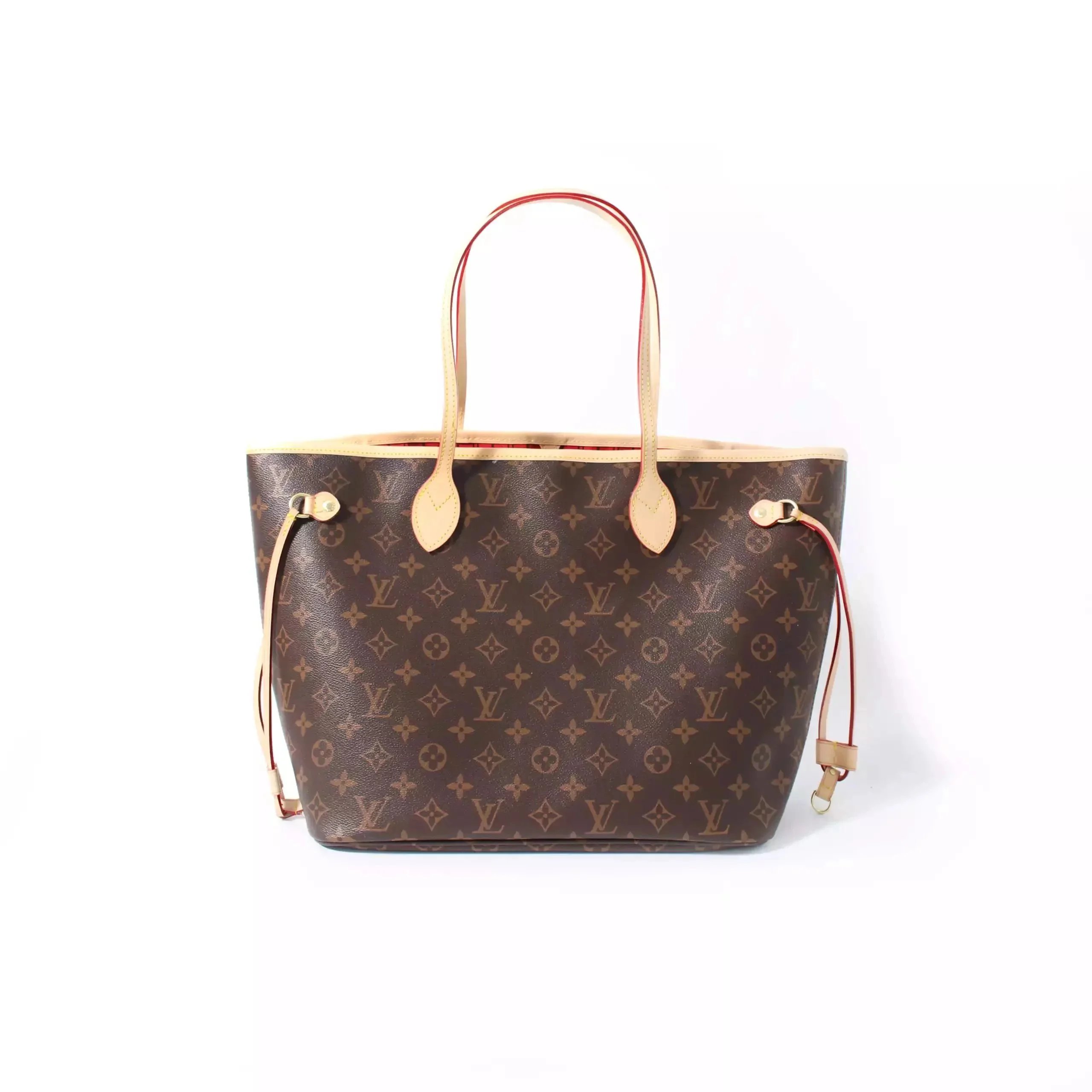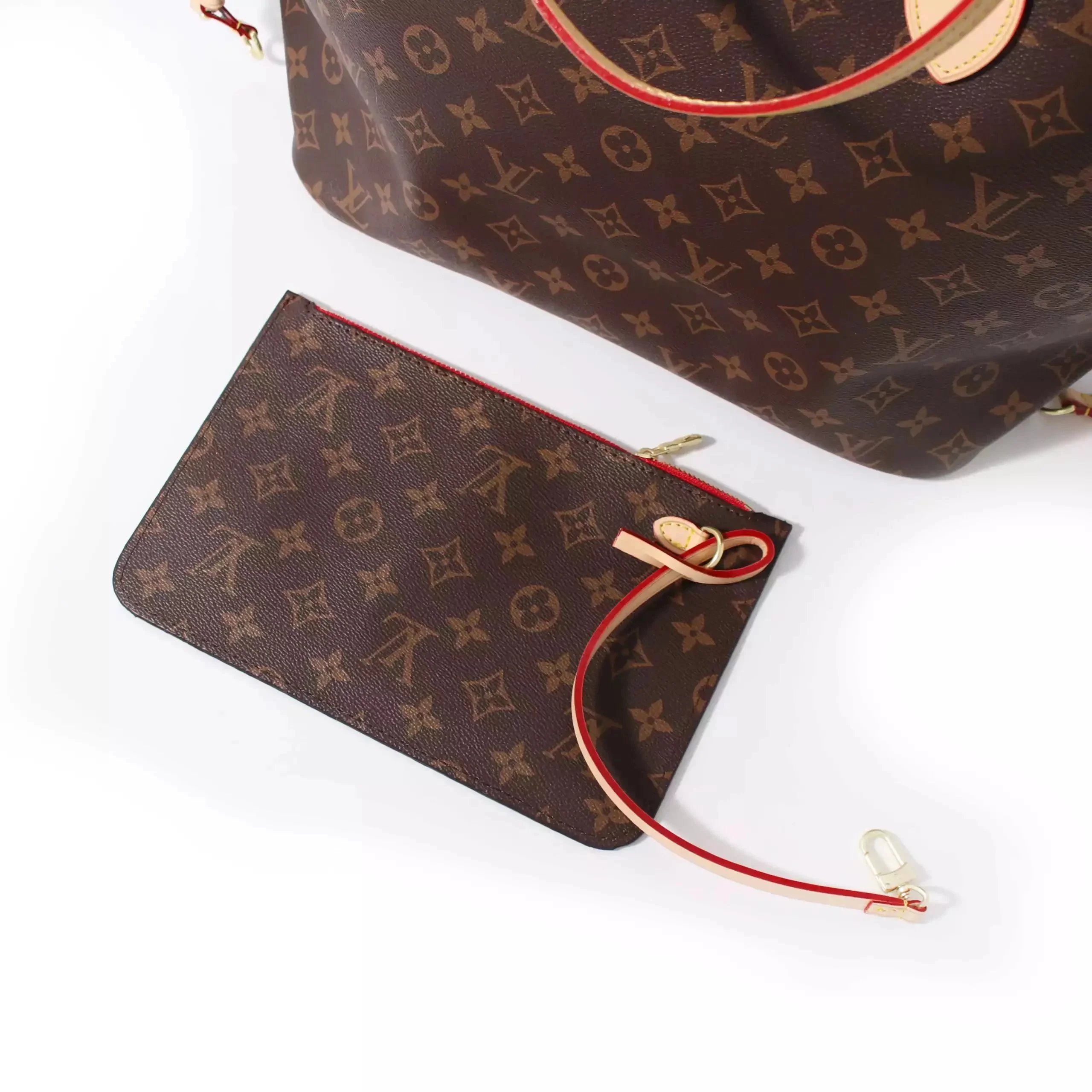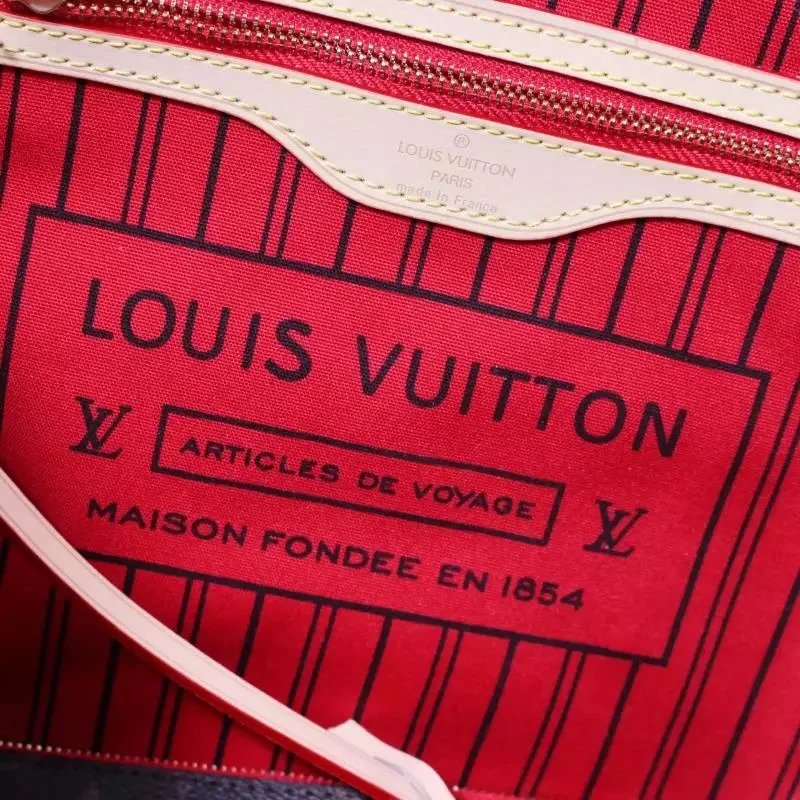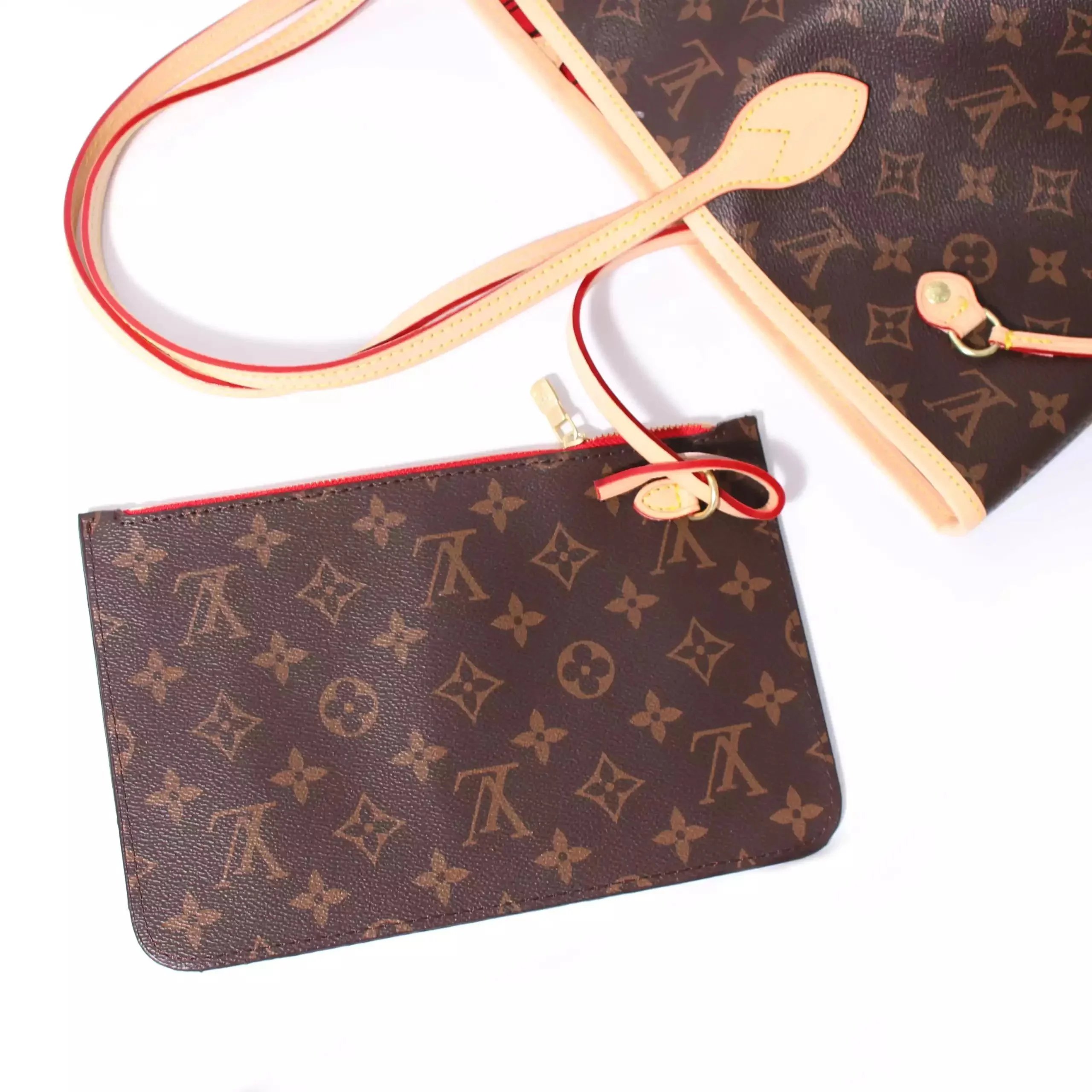 Elegant Louis Vuitton Neverfull tote in classic monogram canvas with matching pouch. Features durable leather trim and signature red lining for timeless style.