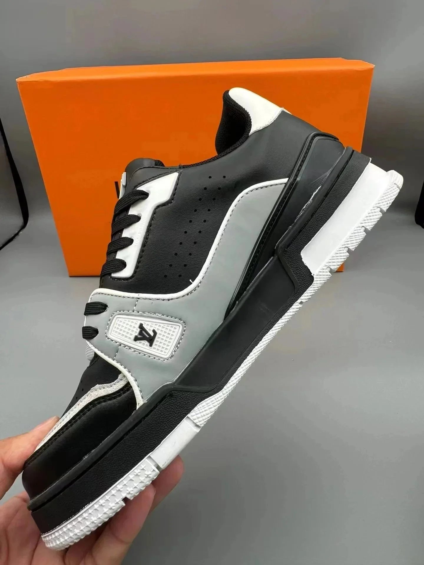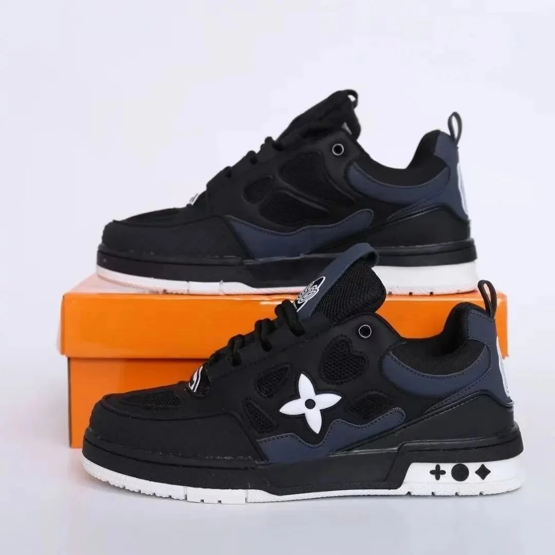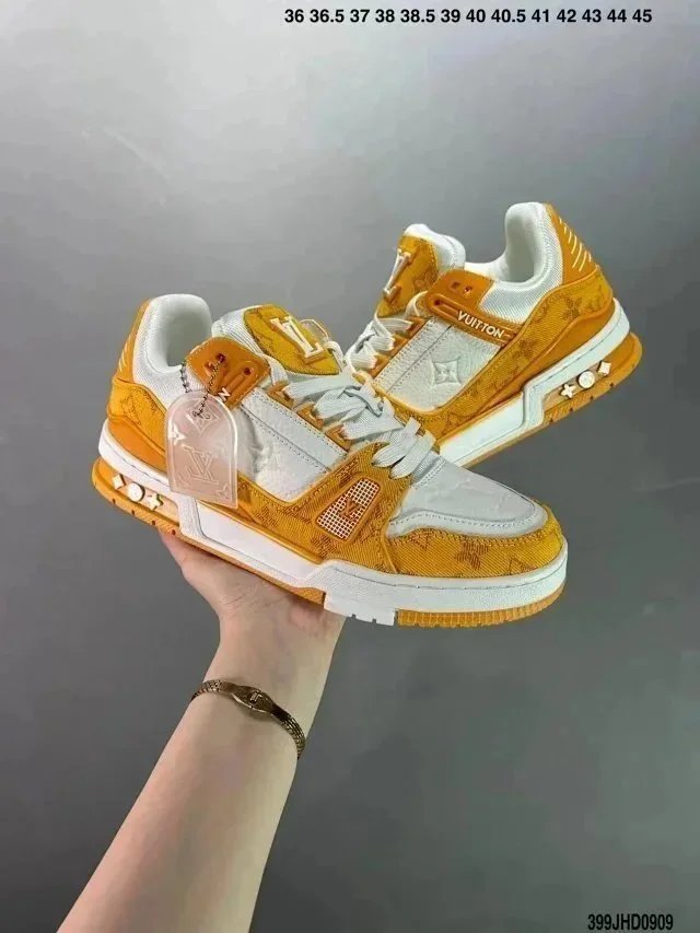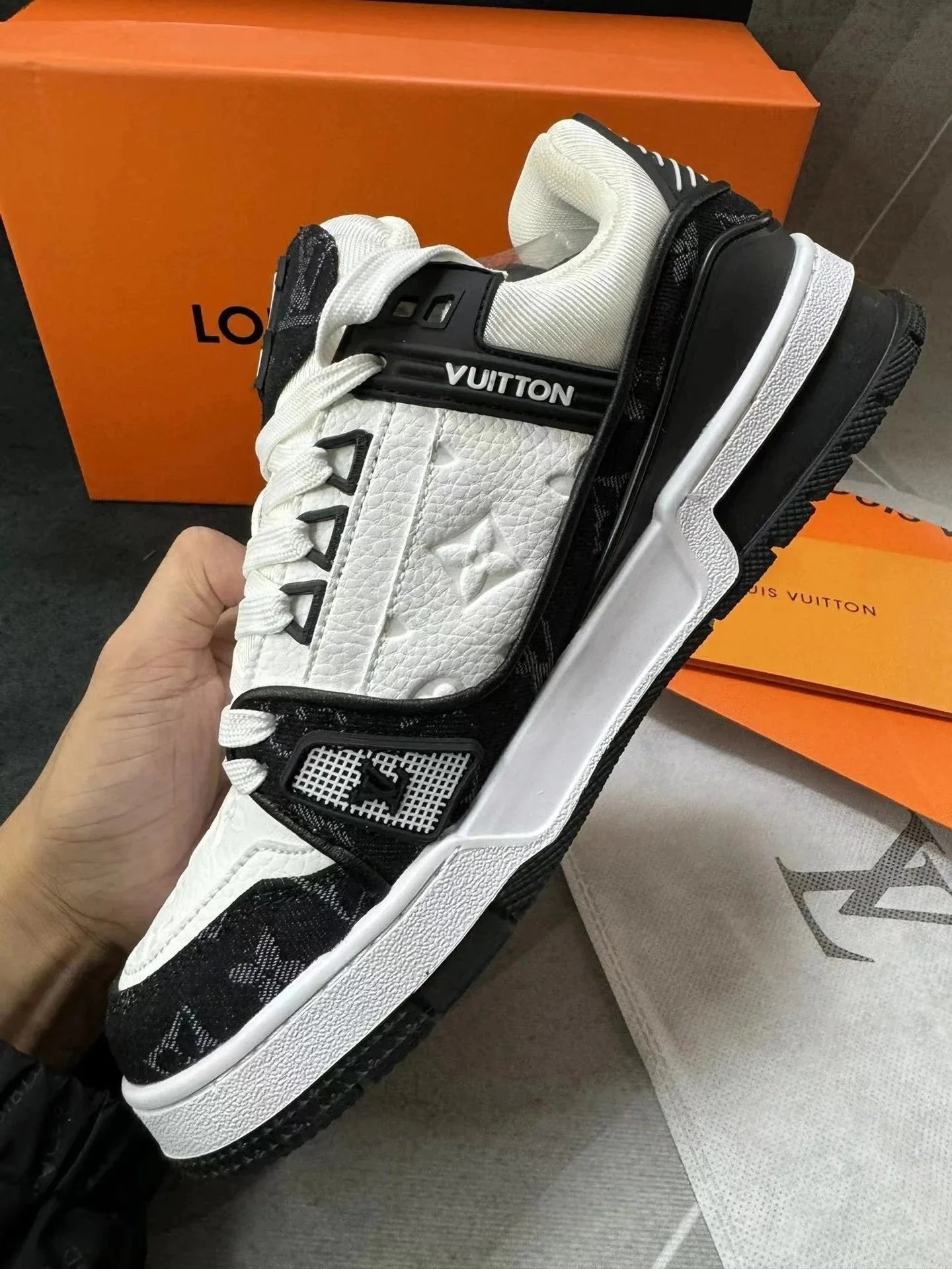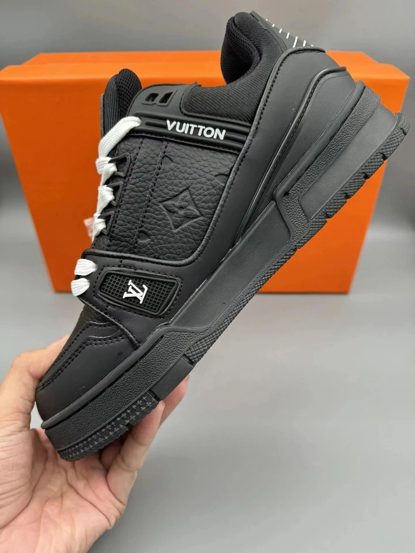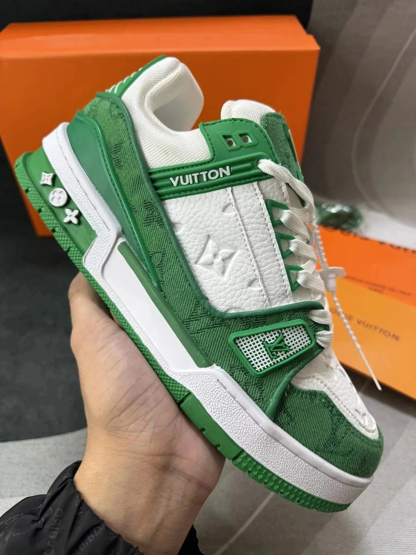 Showcasing the iconic Louis Vuitton Trainer sneakers in four distinct colorways — black, blue, green, and orange — each featuring signature monogram patterns and premium detailing for bold street style.