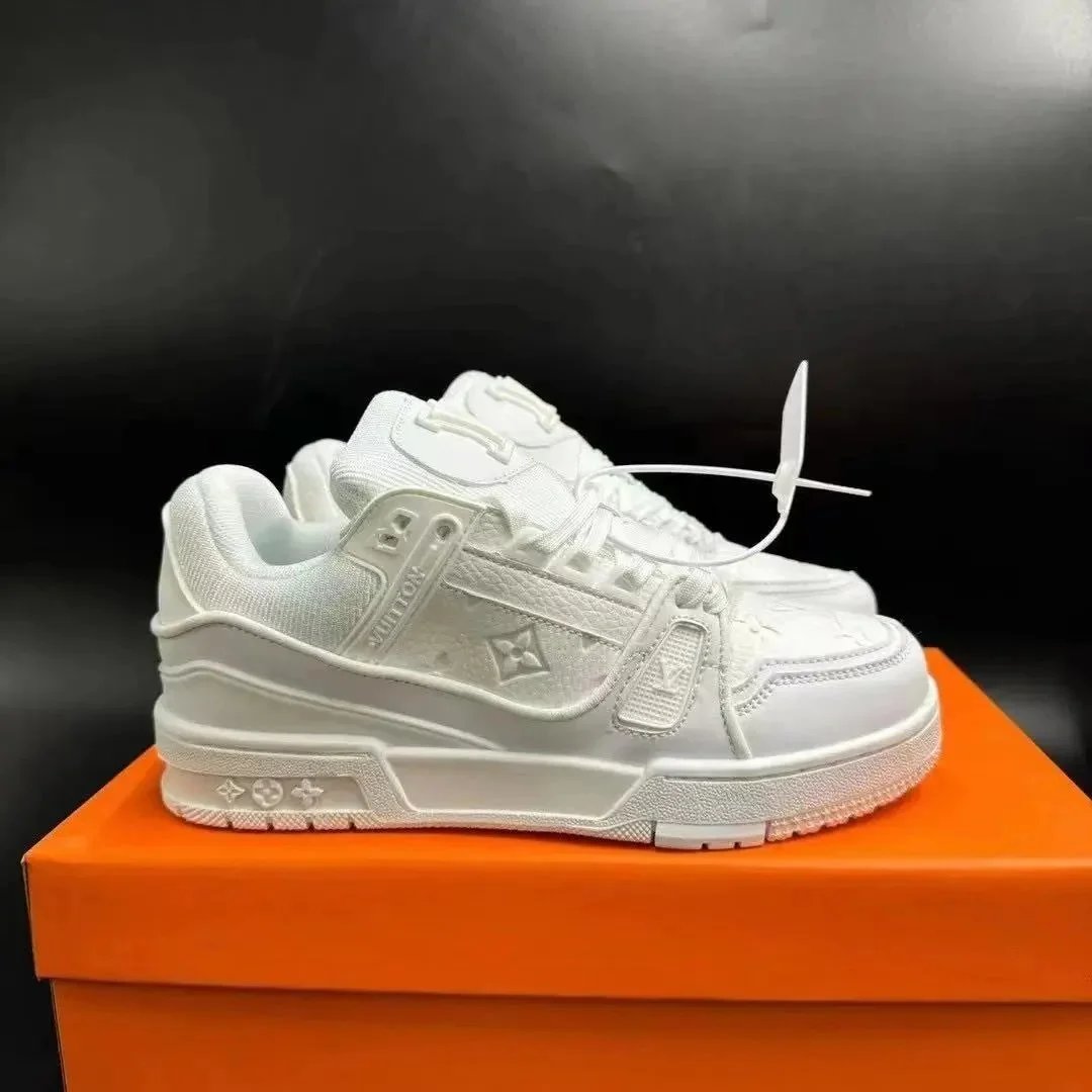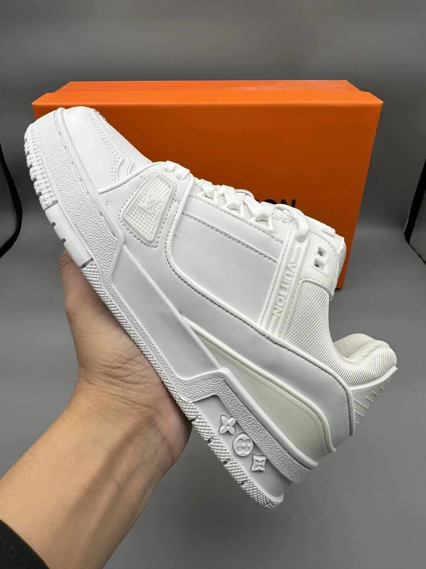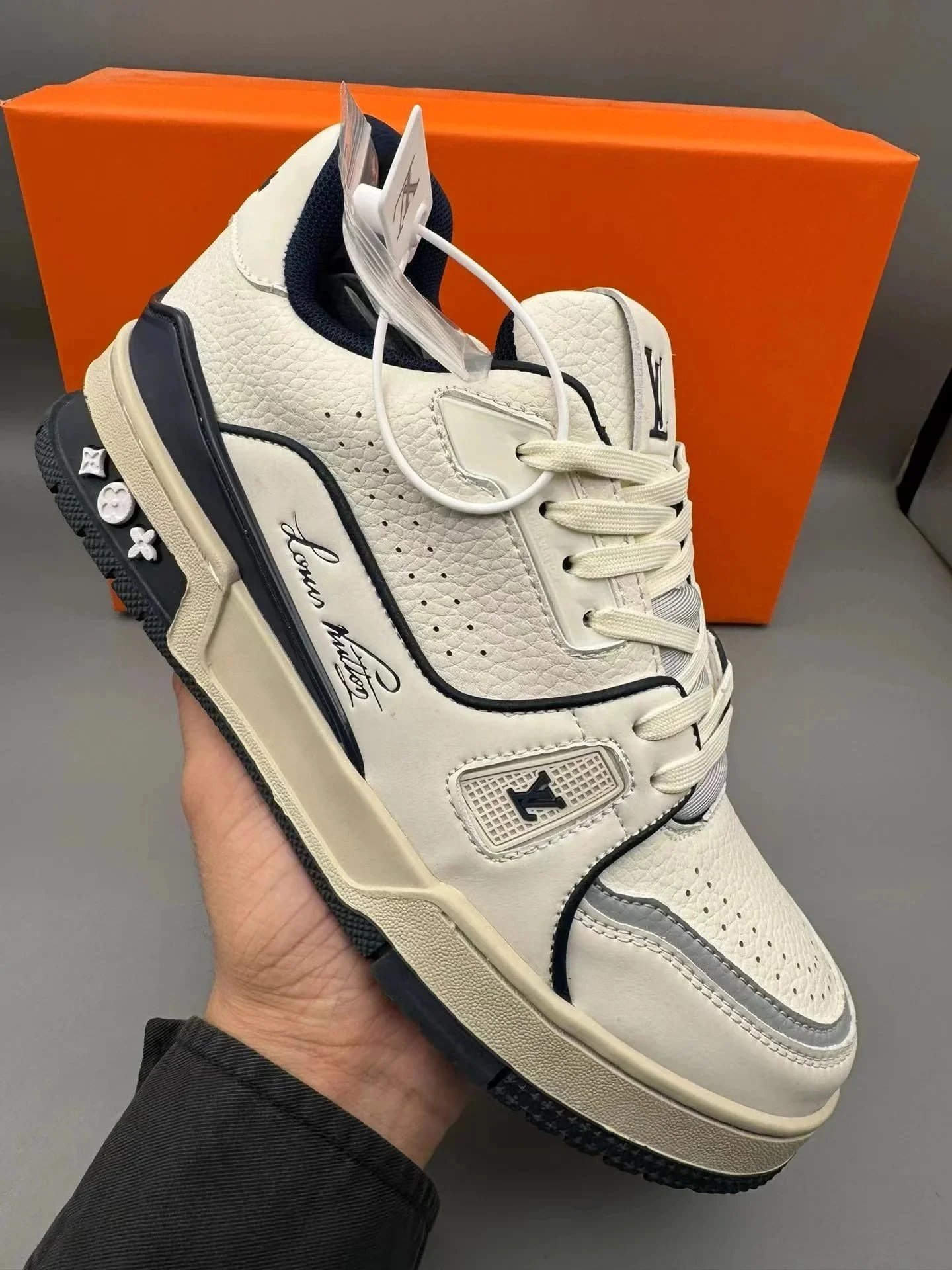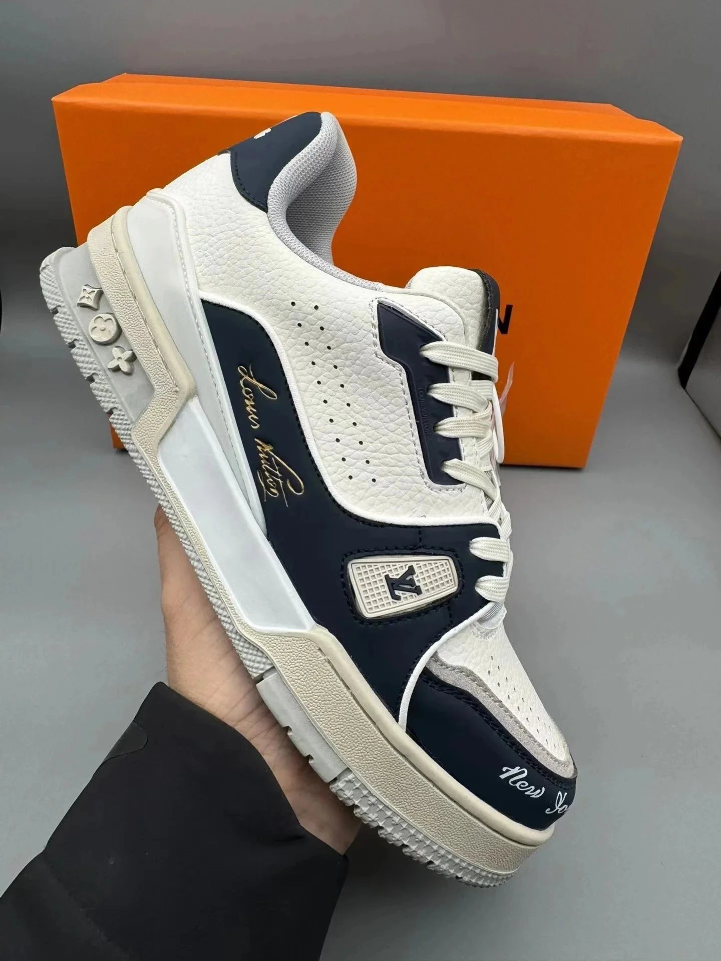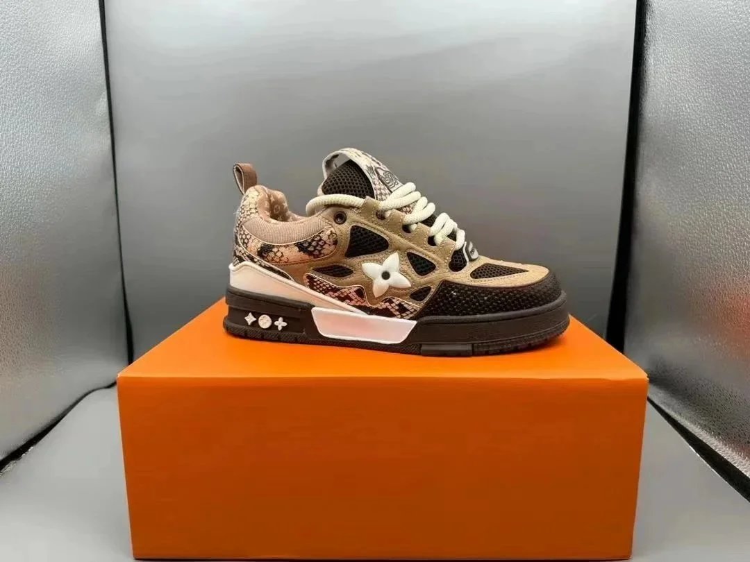 Showcasing the iconic Louis Vuitton Trainer sneakers in four distinct colorways — black, blue, green, and orange — each featuring signature monogram patterns and premium detailing for bold street style.