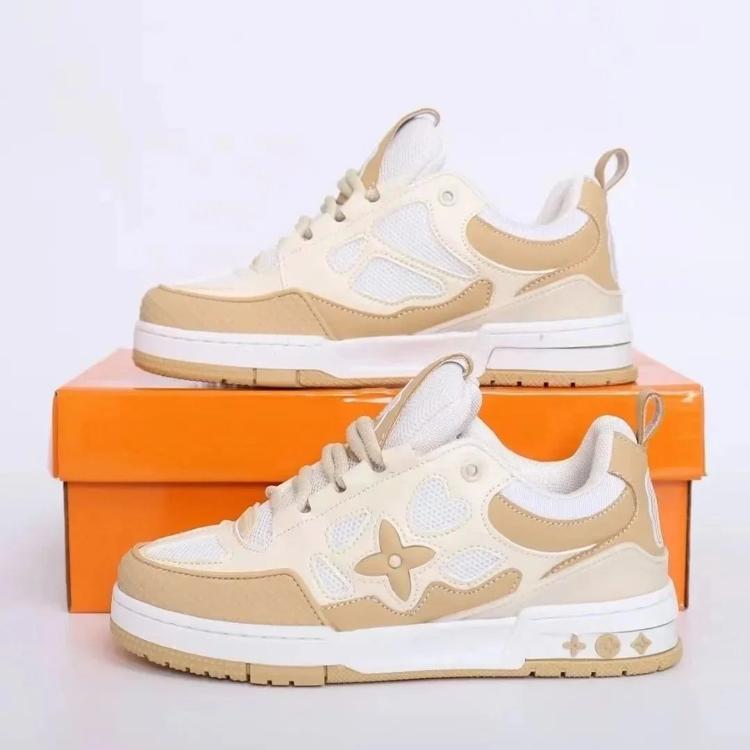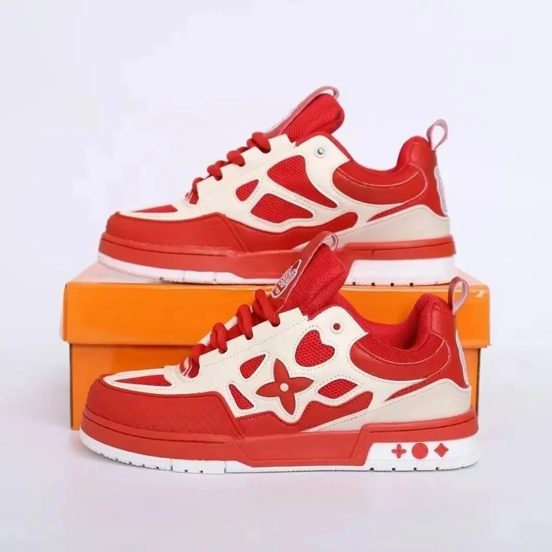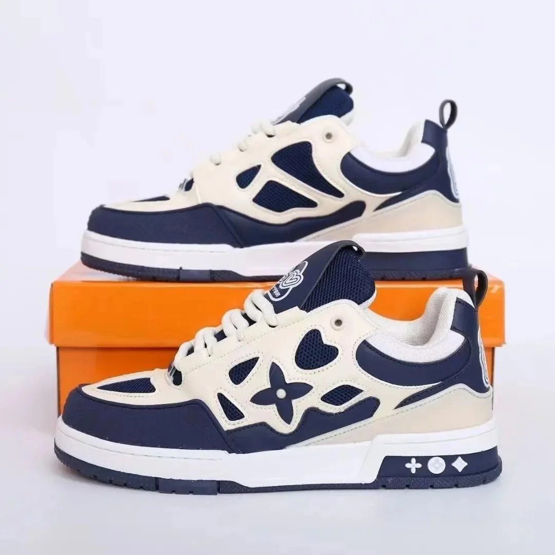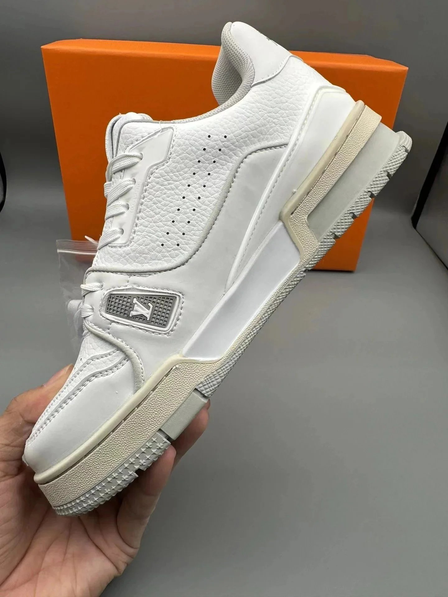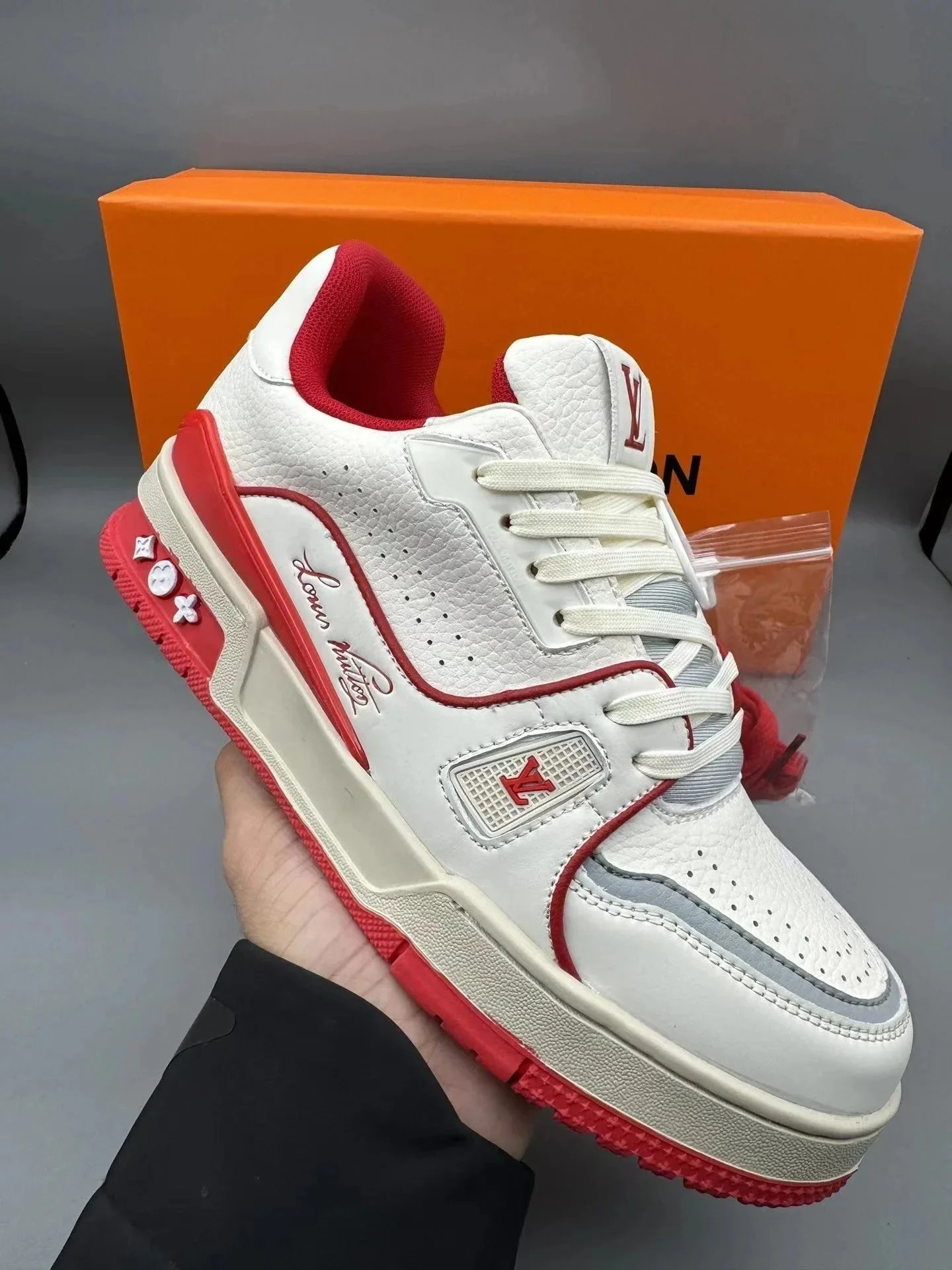 Showcasing the iconic Louis Vuitton Trainer sneakers in four distinct colorways — black, blue, green, and orange — each featuring signature monogram patterns and premium detailing for bold street style.