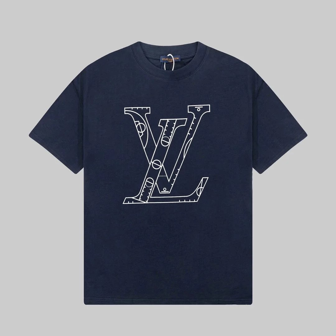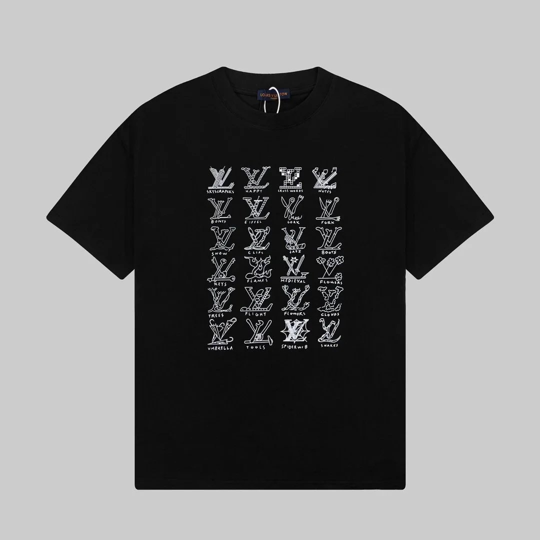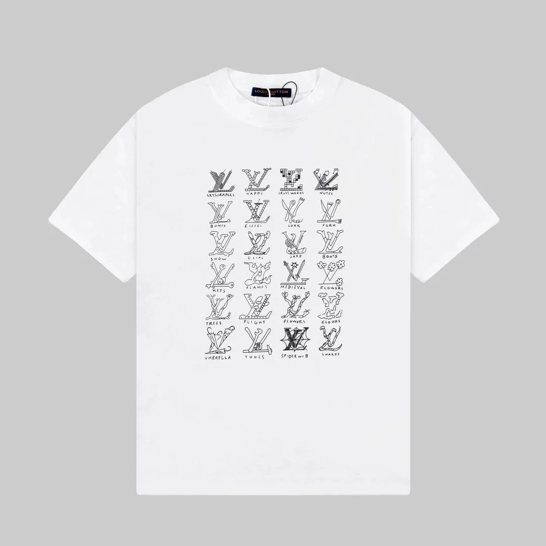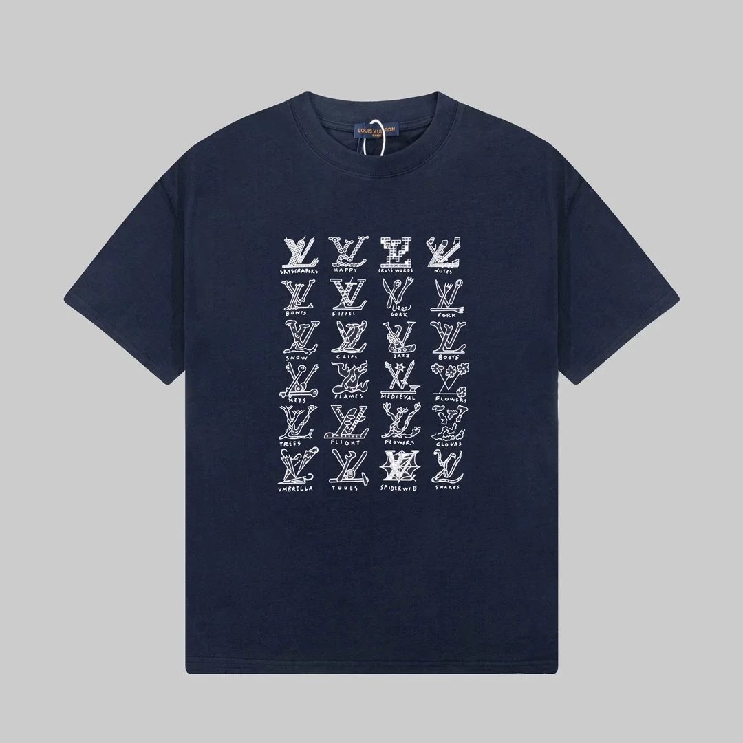 This Louis Vuitton t-shirt features a grid of 16 unique white LV logo variations, each paired with a thematic word like 'Flames' or 'Boots'. Crafted in navy cotton, it’s a statement piece blending iconic branding with artistic design.
