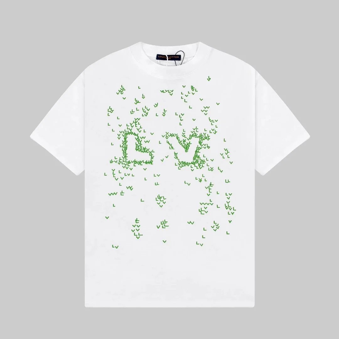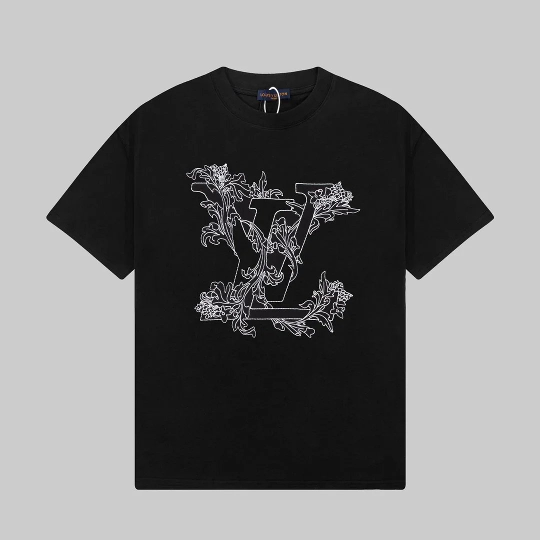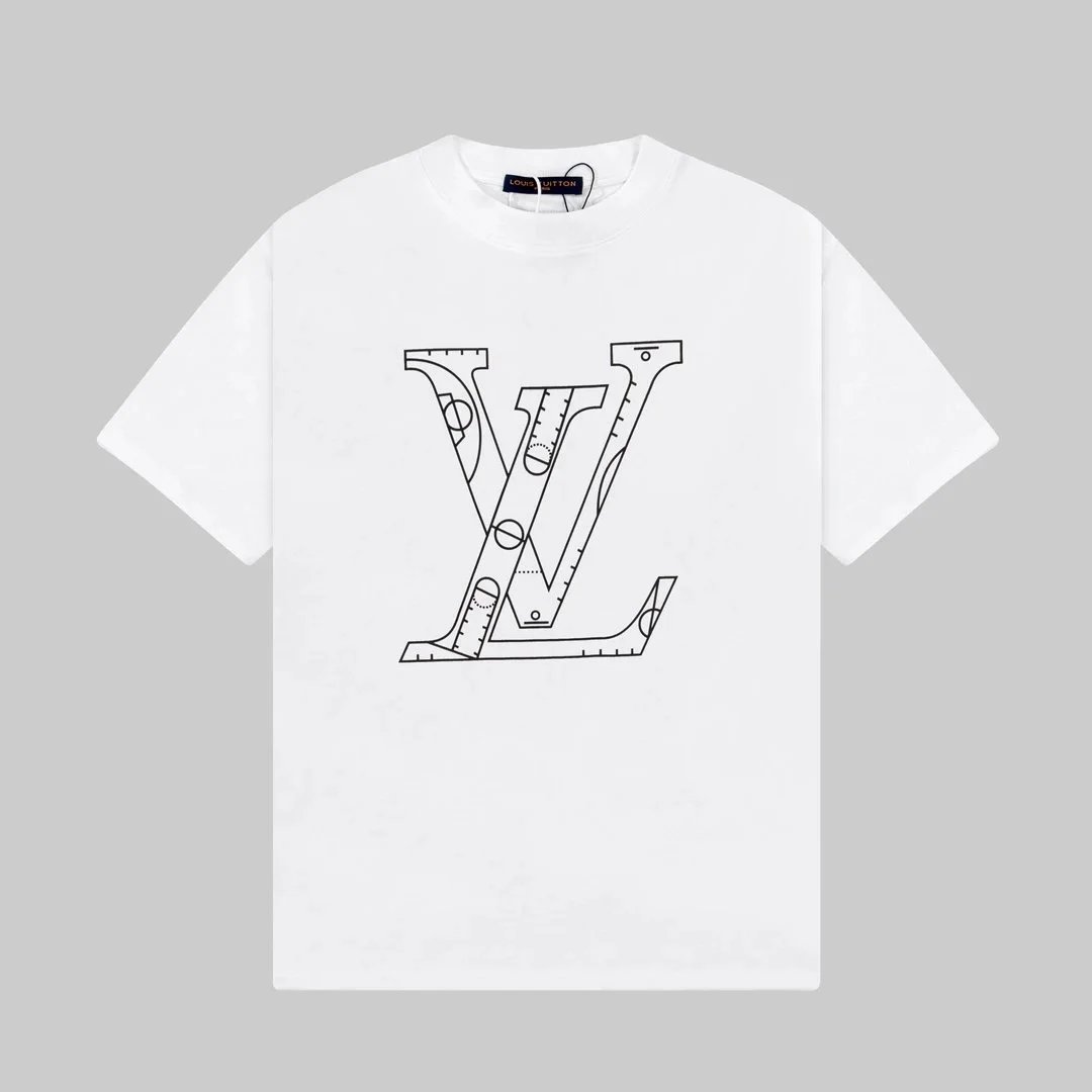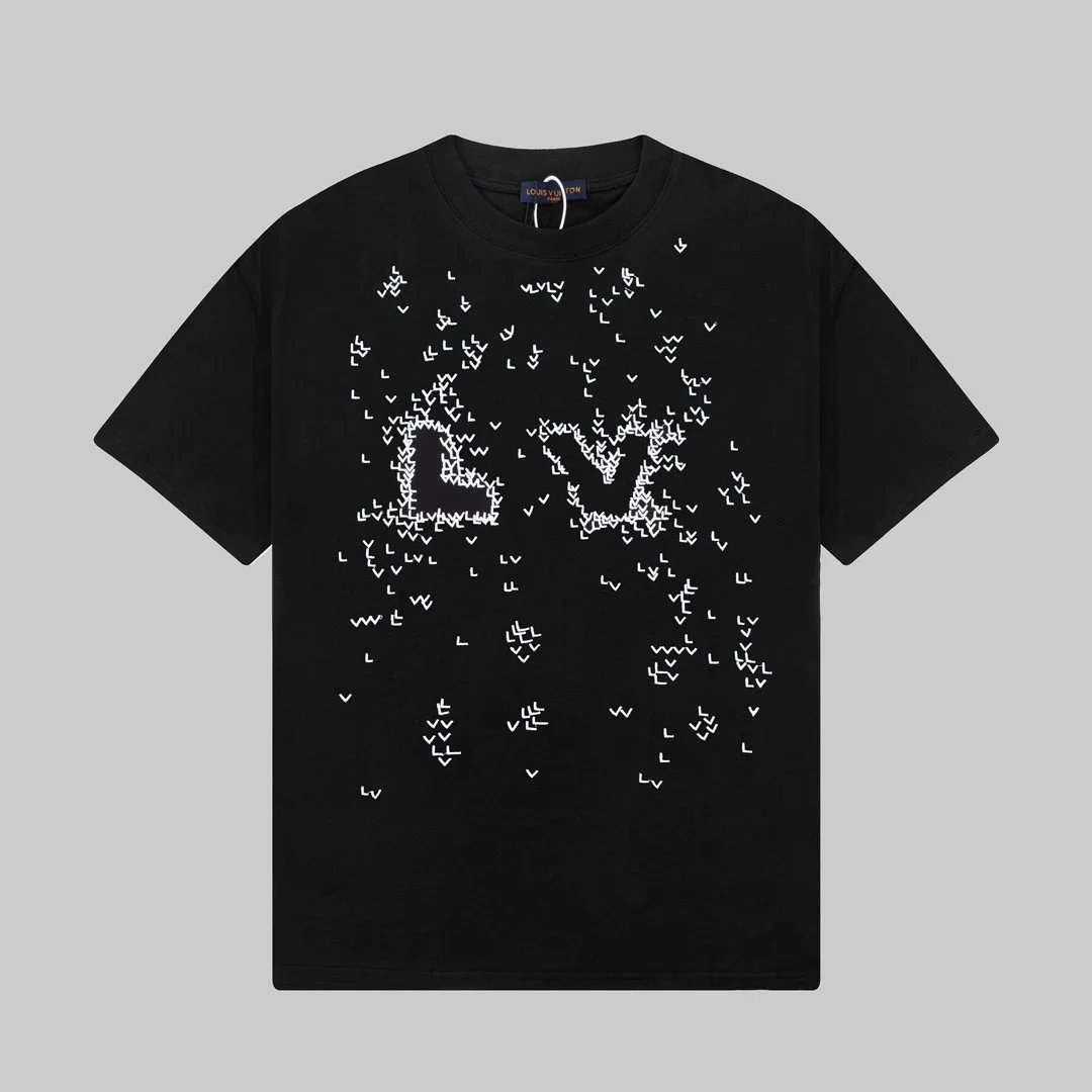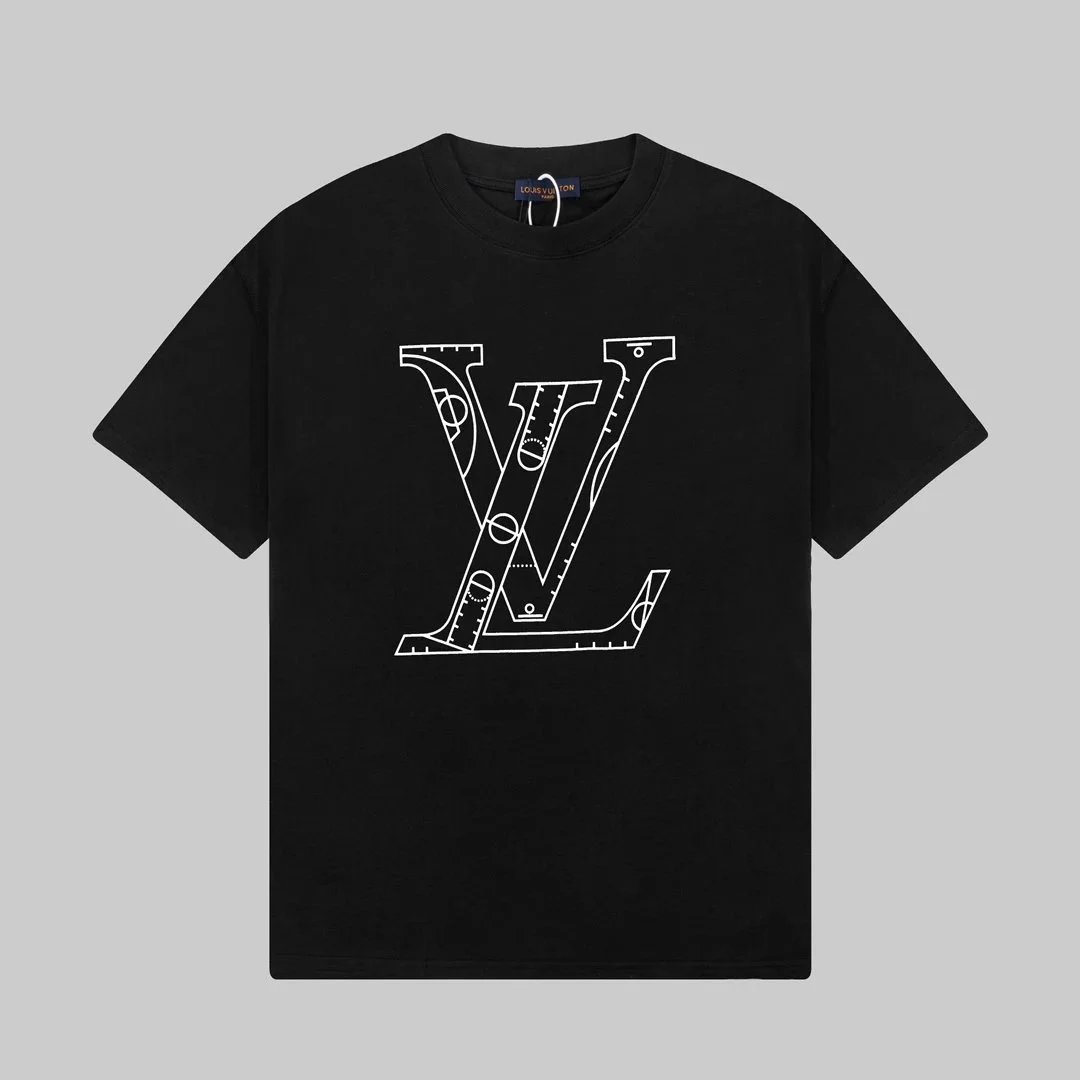 This Louis Vuitton t-shirt features a grid of 16 unique white LV logo variations, each paired with a thematic word like 'Flames' or 'Boots'. Crafted in navy cotton, it’s a statement piece blending iconic branding with artistic design.
