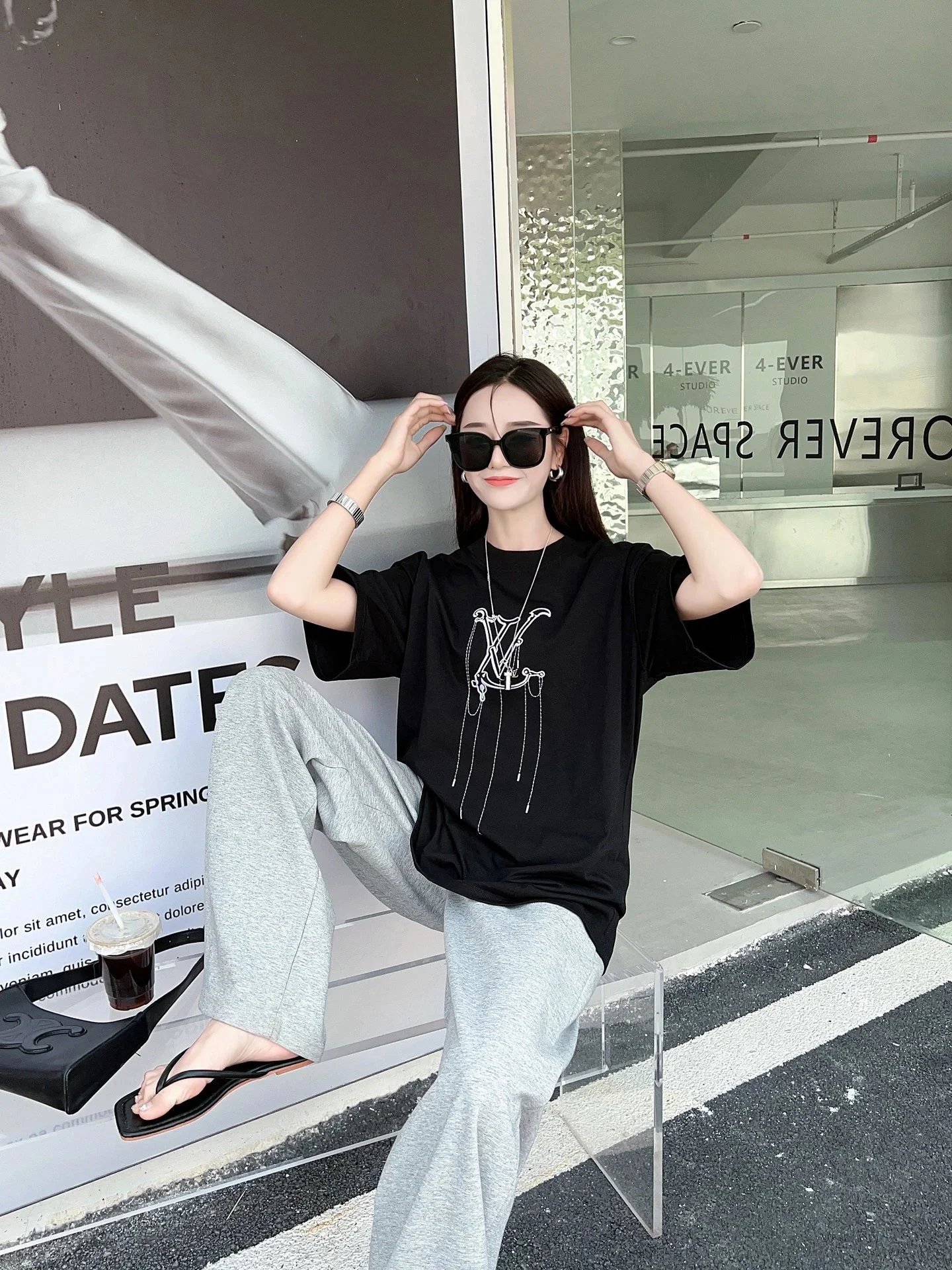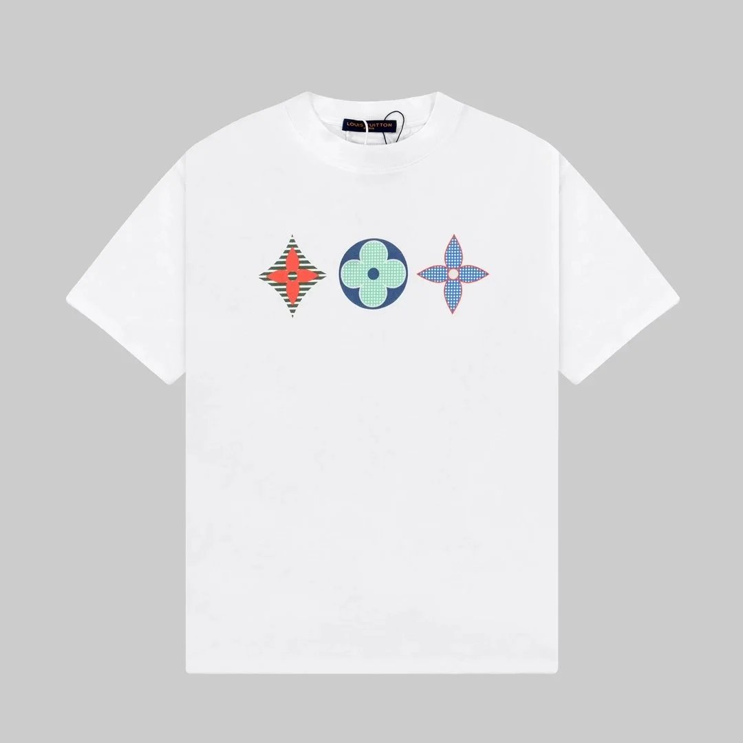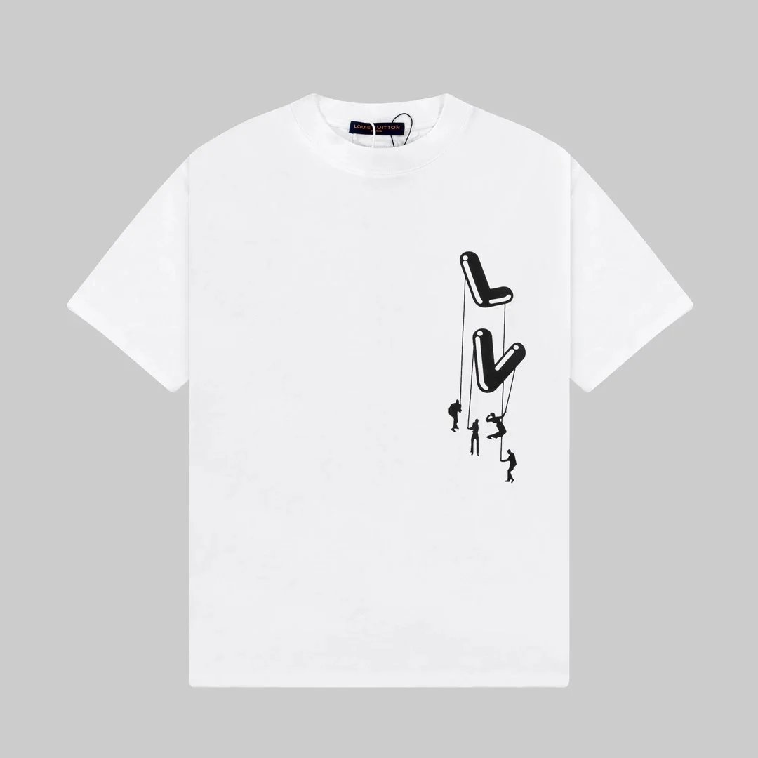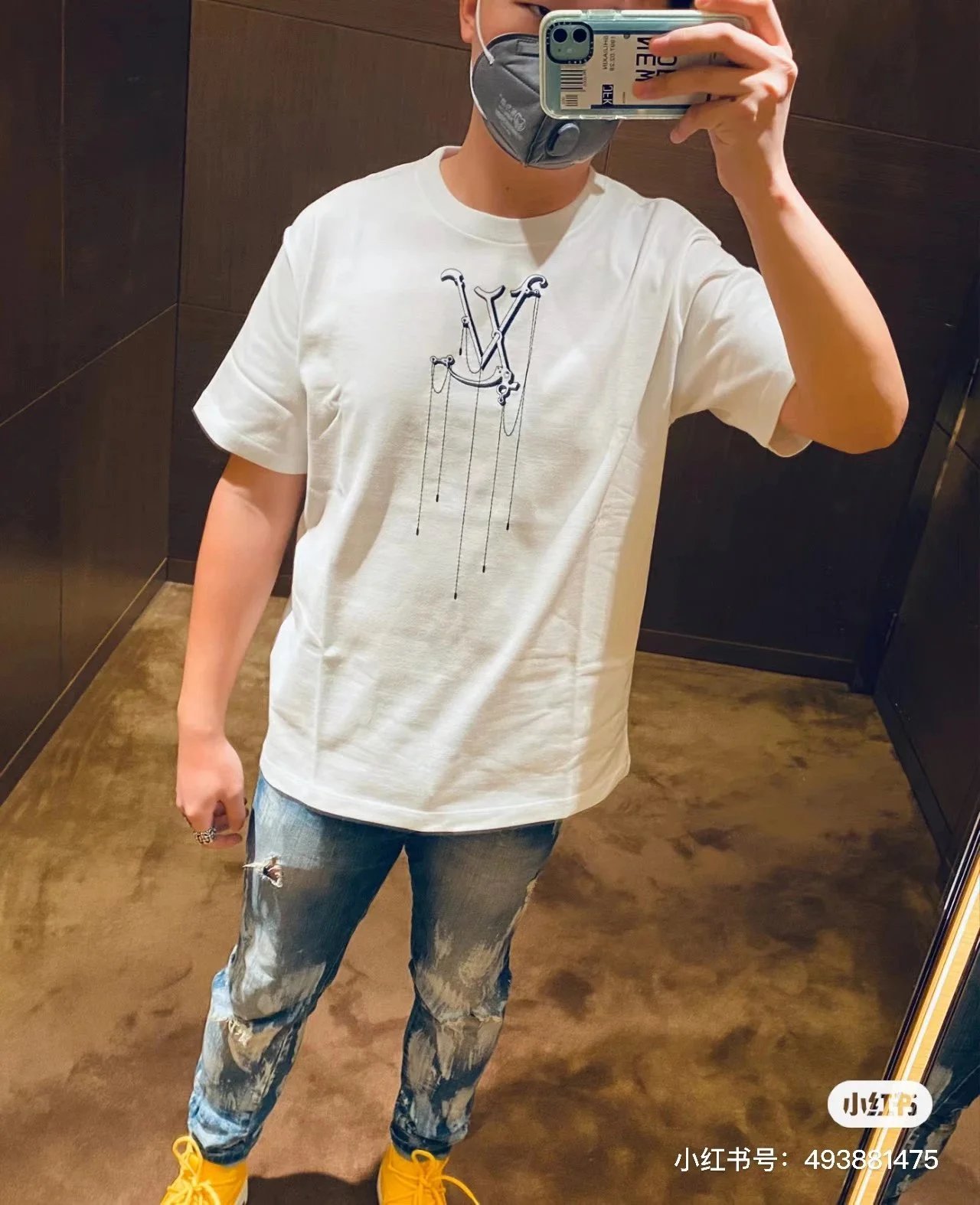 This Louis Vuitton t-shirt features a grid of 16 unique white LV logo variations, each paired with a thematic word like 'Flames' or 'Boots'. Crafted in navy cotton, it’s a statement piece blending iconic branding with artistic design.