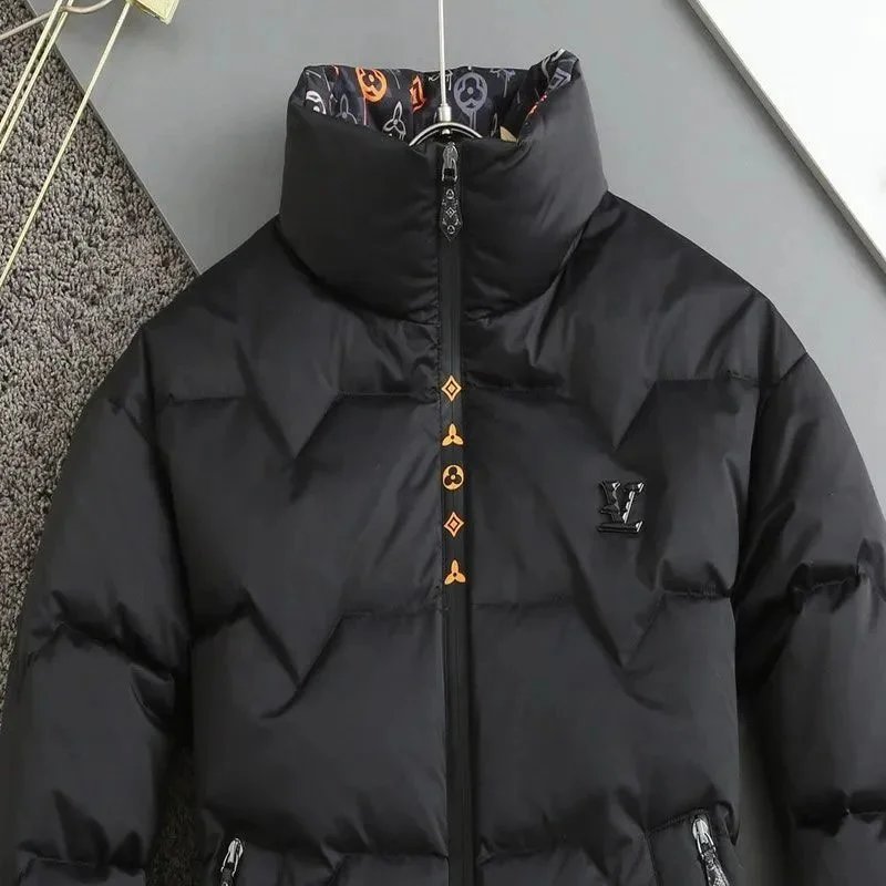 Stylish black puffer jacket from Lux-Victory featuring a high collar, gold-tone zipper accents, and front pockets. Perfect for cold weather with a sleek, modern design.