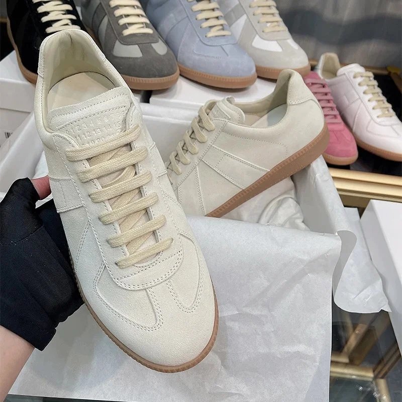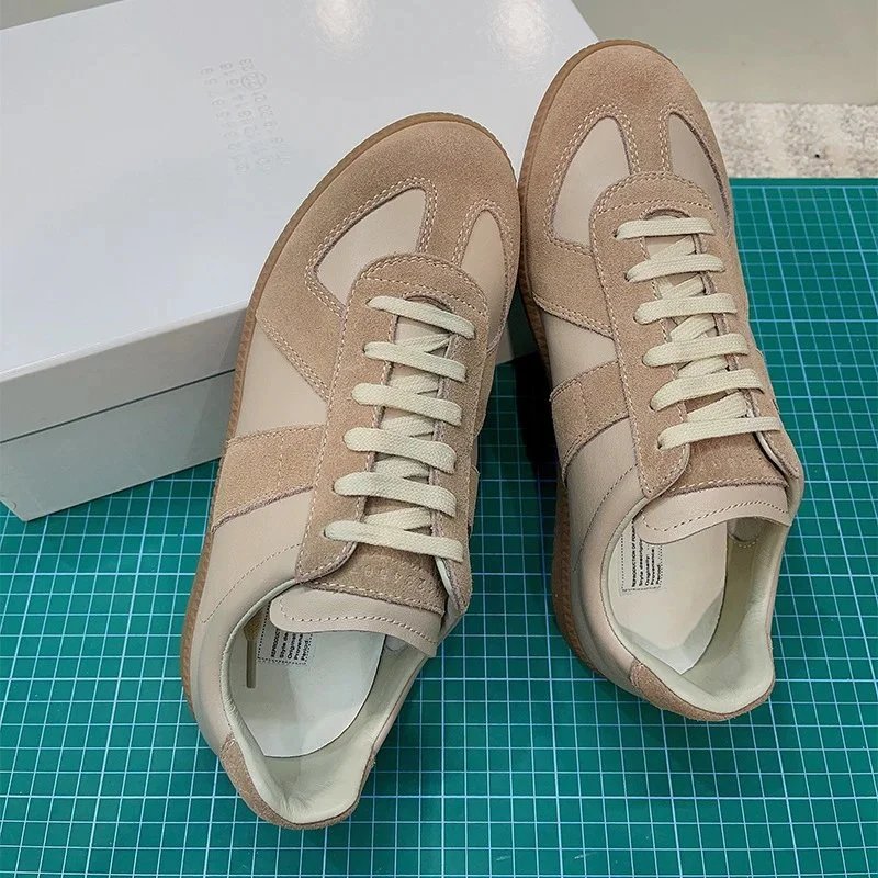 Elegant Maison Margiela replica sneakers featuring a beige suede and leather upper with signature stitching. Designed for effortless style and everyday wear.