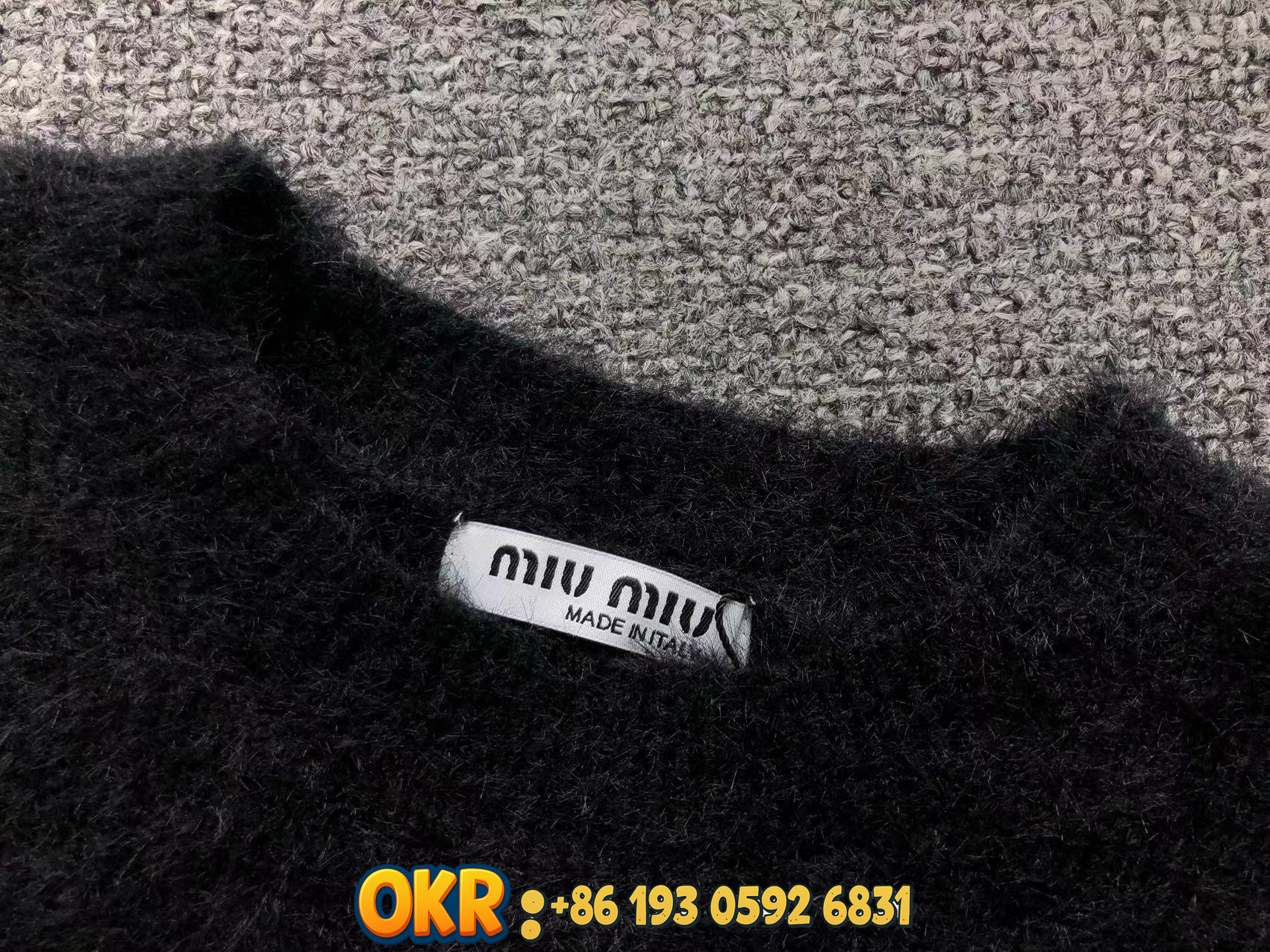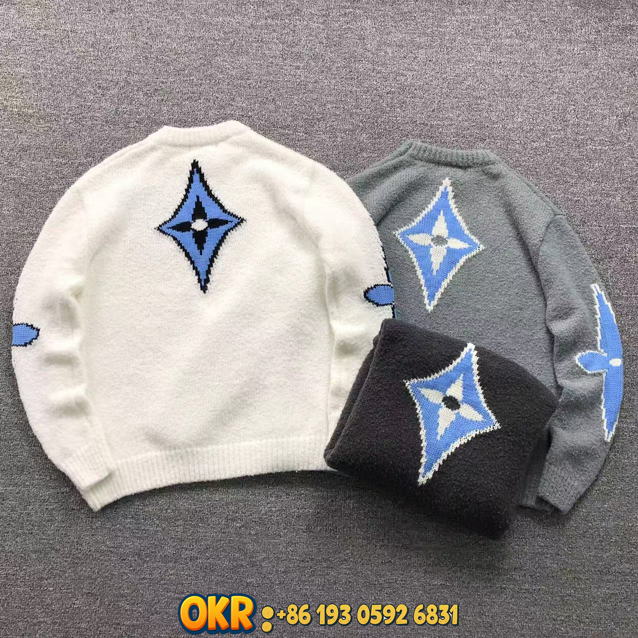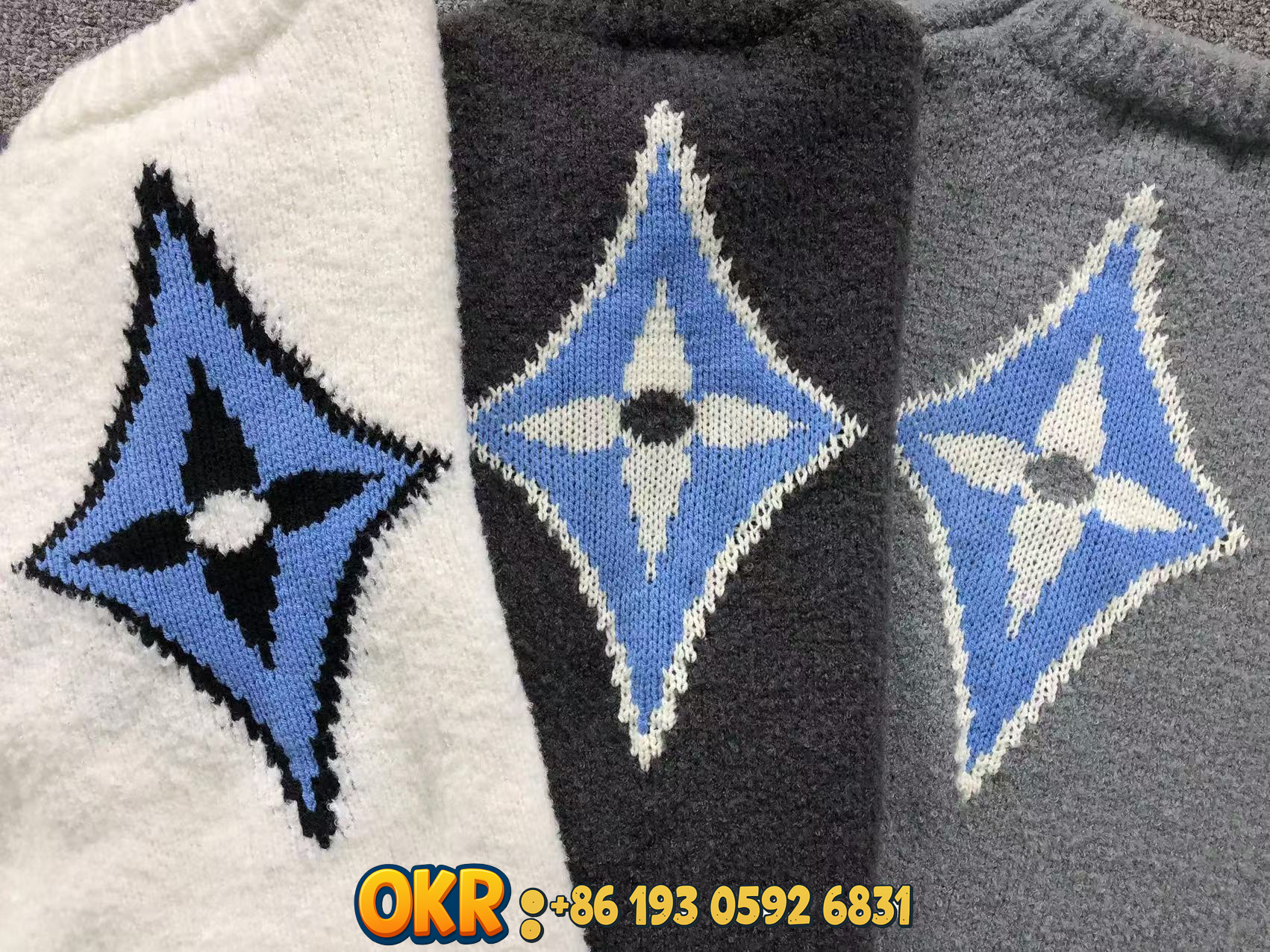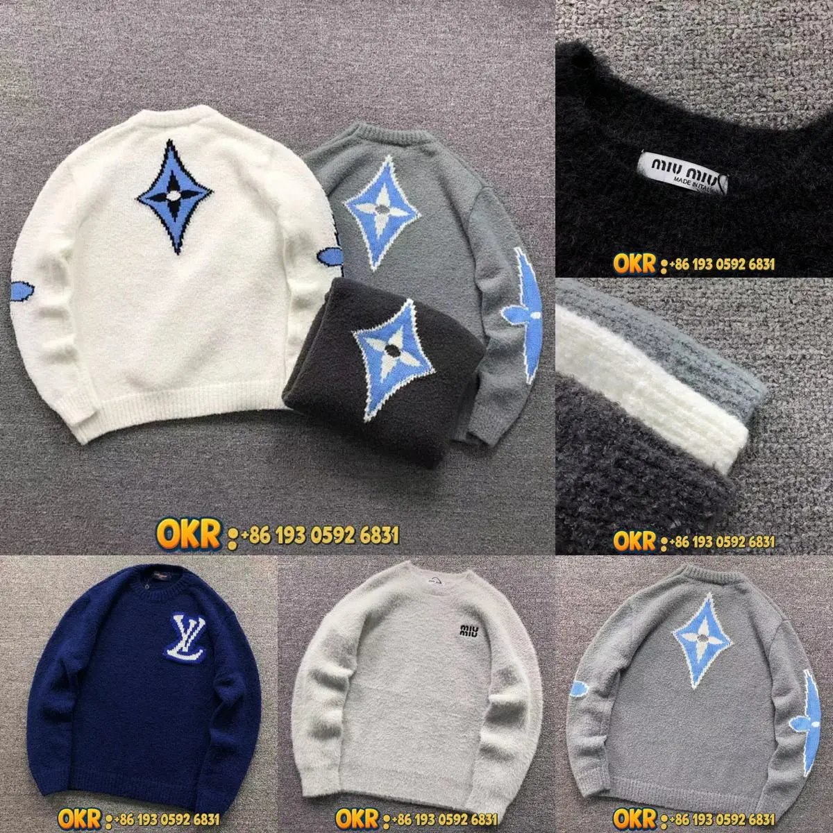 Luxury Miu Miu knit sweaters featuring iconic blue diamond and LV logos in soft wool blends. Available in white, gray, black, and navy for elegant everyday wear.