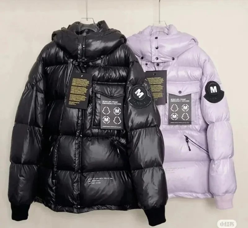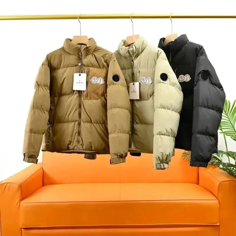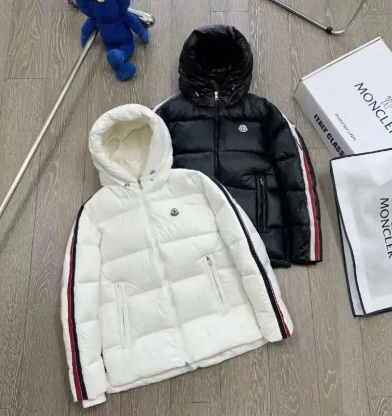 Stylish and warm MONCER lightweight puffer jackets in assorted colors including white, green, blue, pink, and black. Perfect for cold weather with a hood and sleek design.