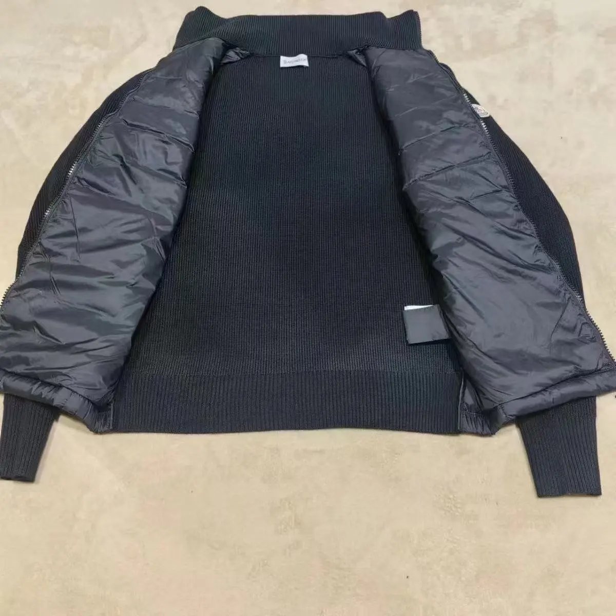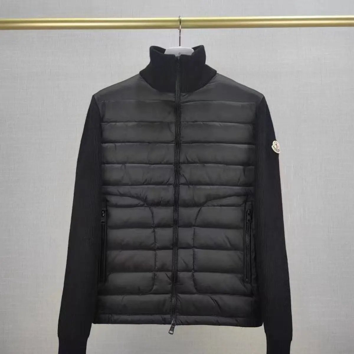 Stylish Moncler black down jacket featuring a vertical logo design and high collar for warmth. Perfect for cold weather with premium insulation and sleek styling.