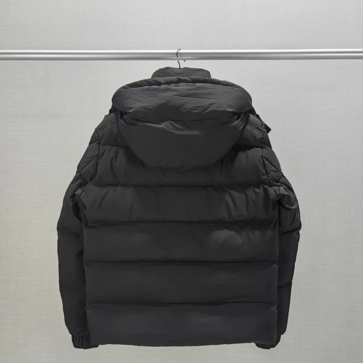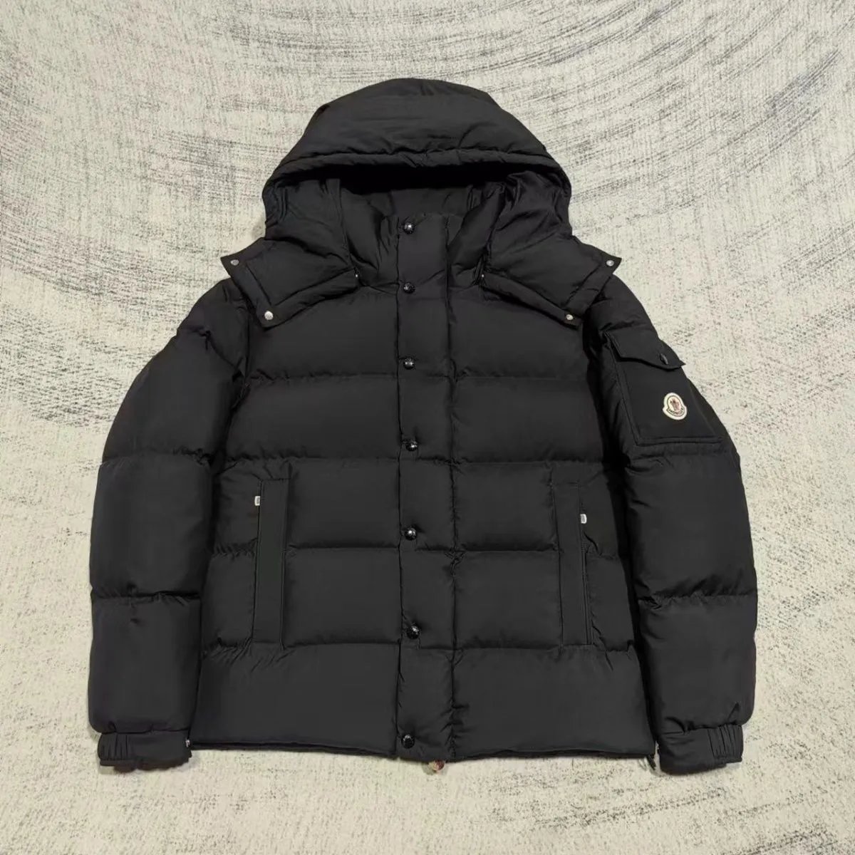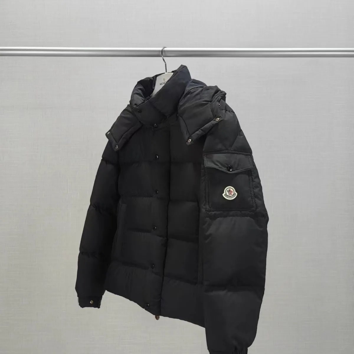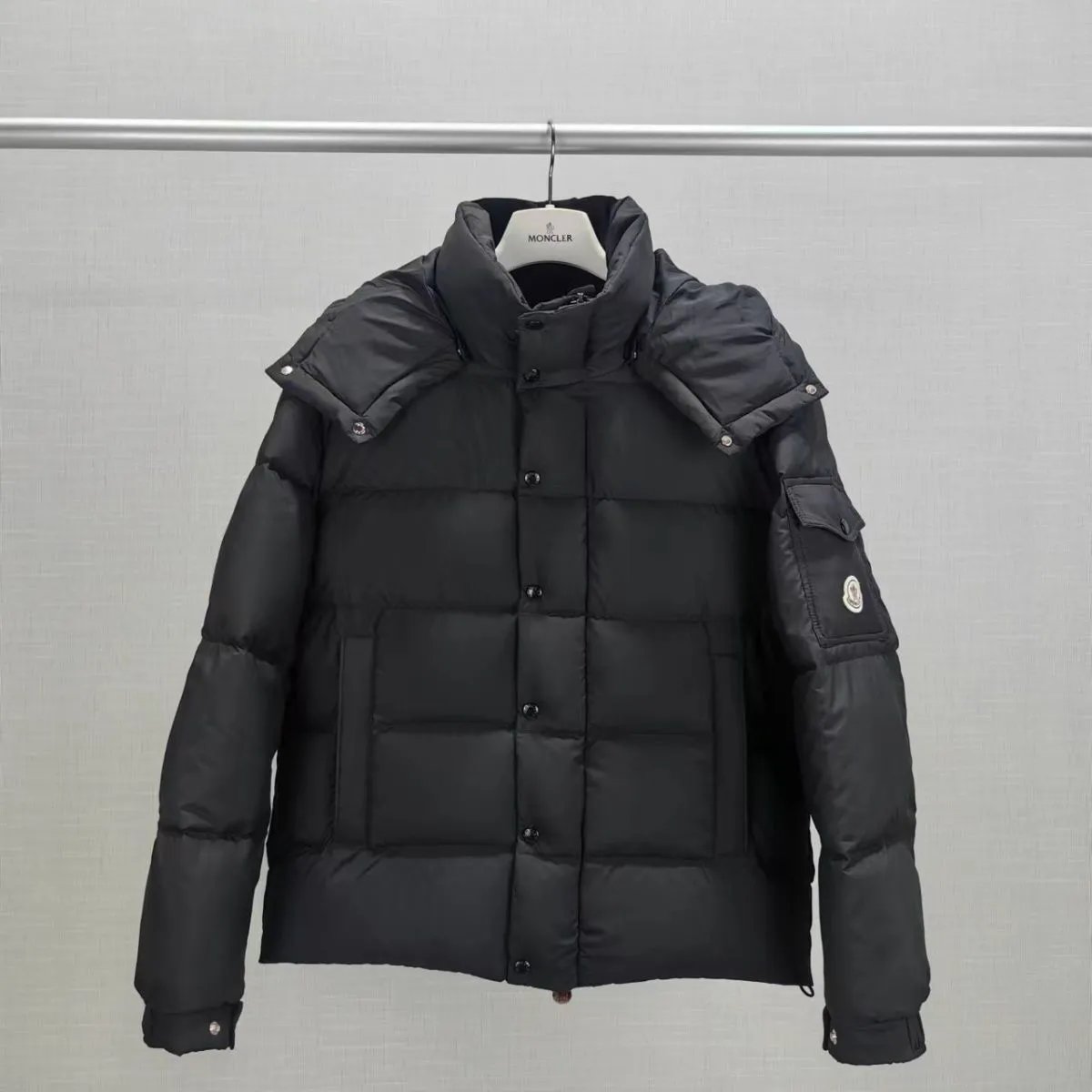 Premium Moncler black quilted down jacket featuring a detachable hood and iconic logo patch. Designed for warmth and style in cold weather.