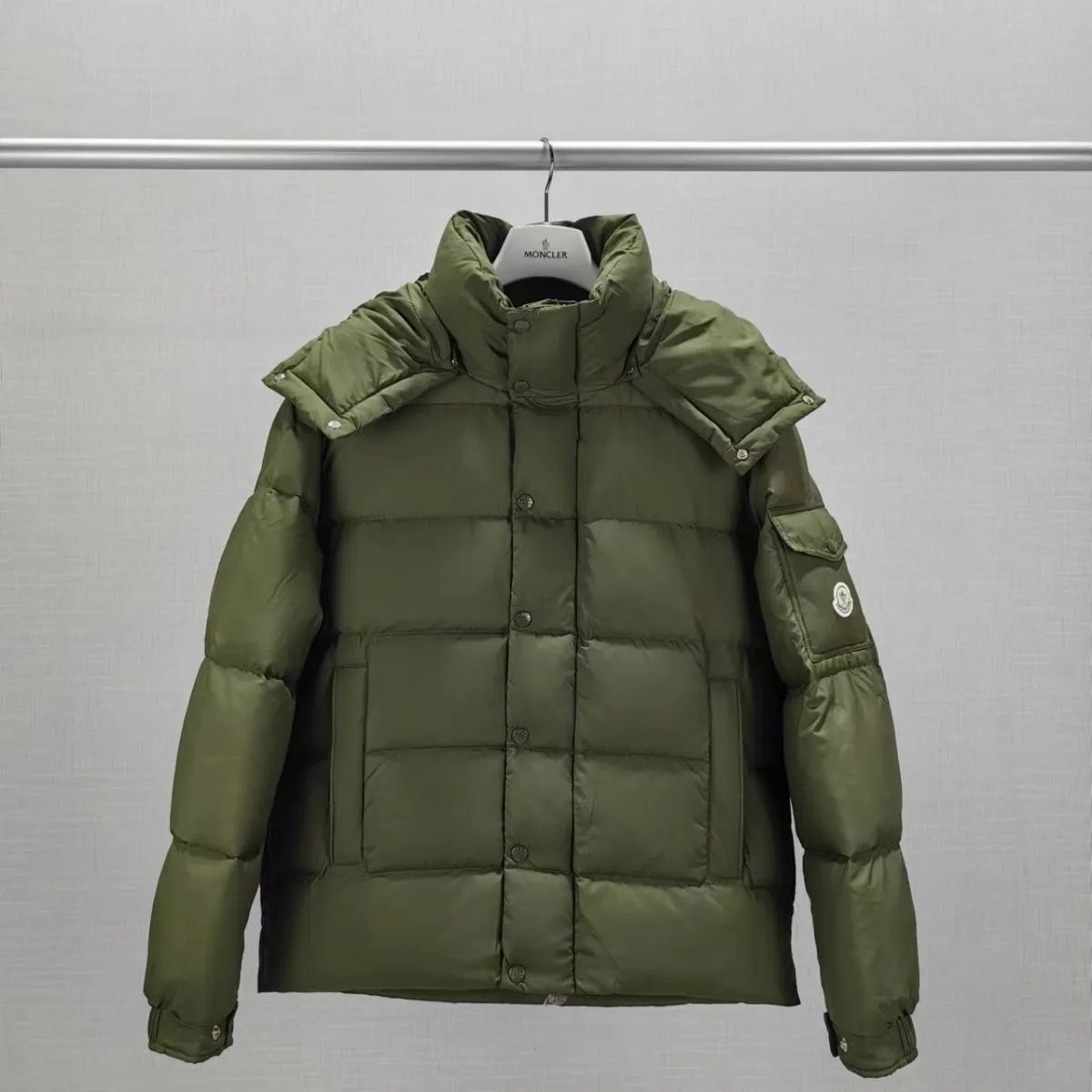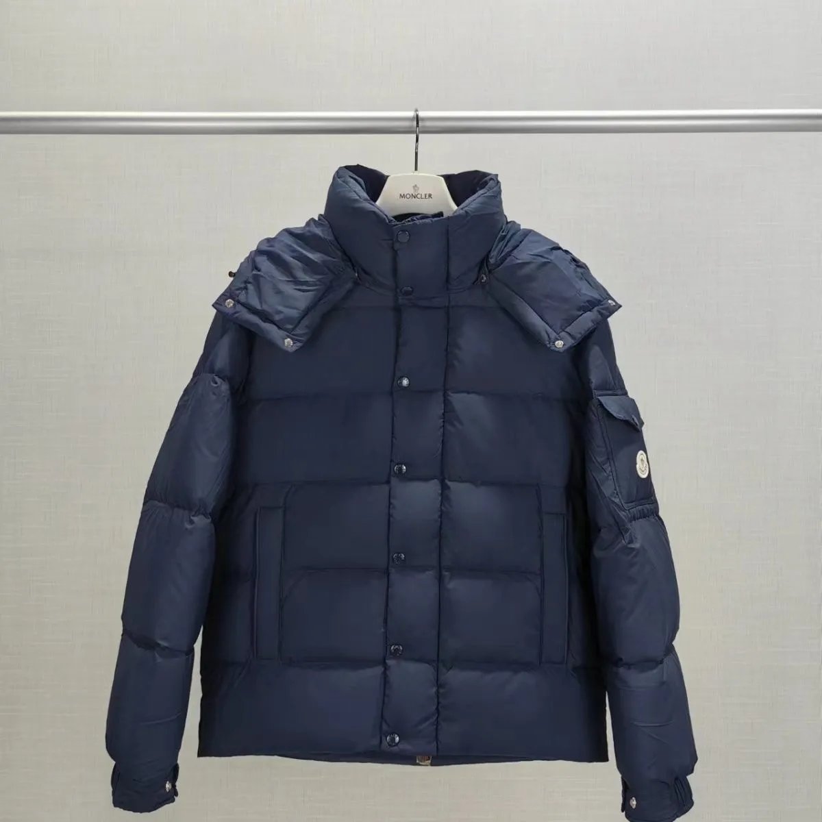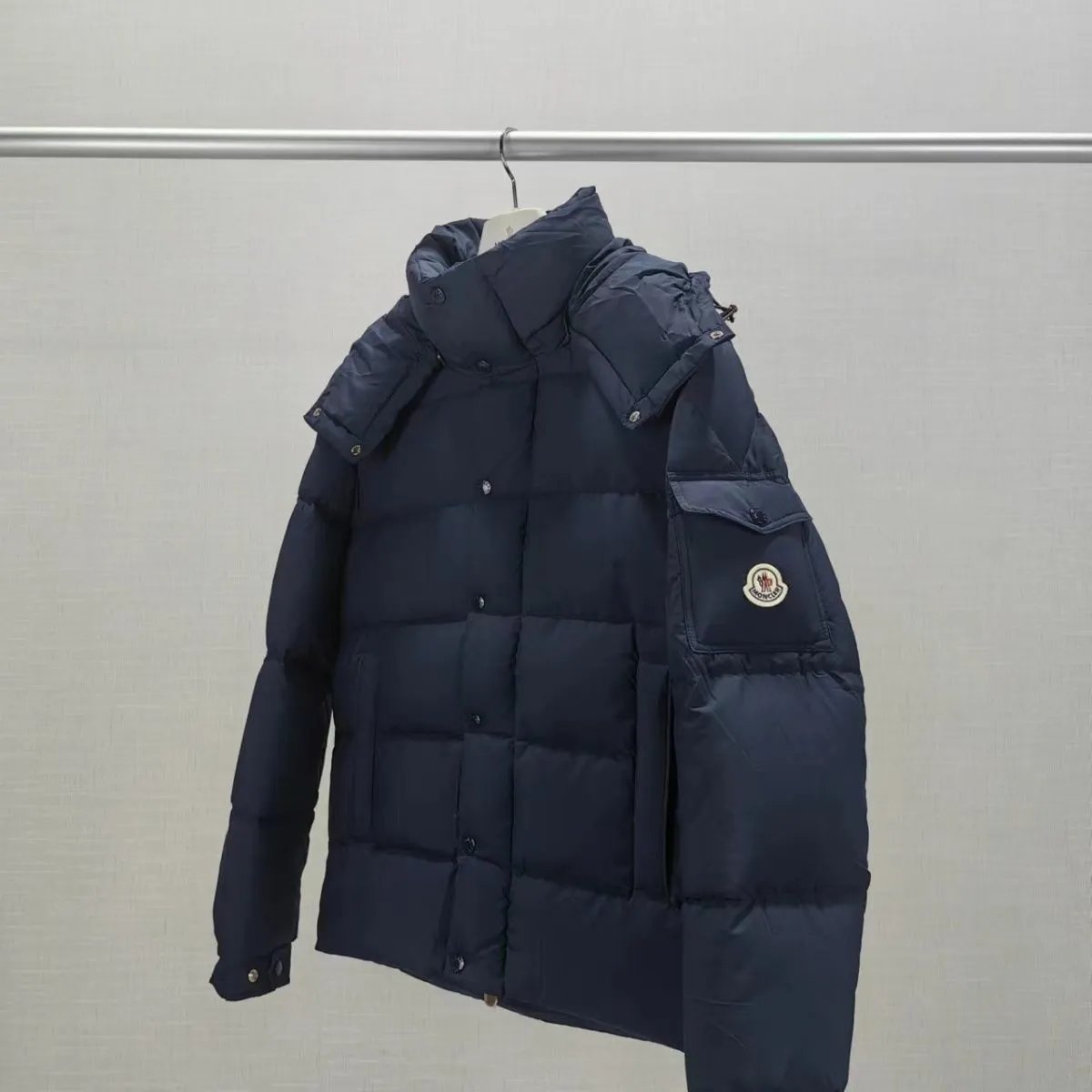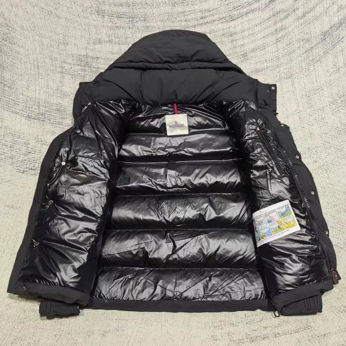 Premium Moncler black quilted down jacket featuring a detachable hood and iconic logo patch. Designed for warmth and style in cold weather.