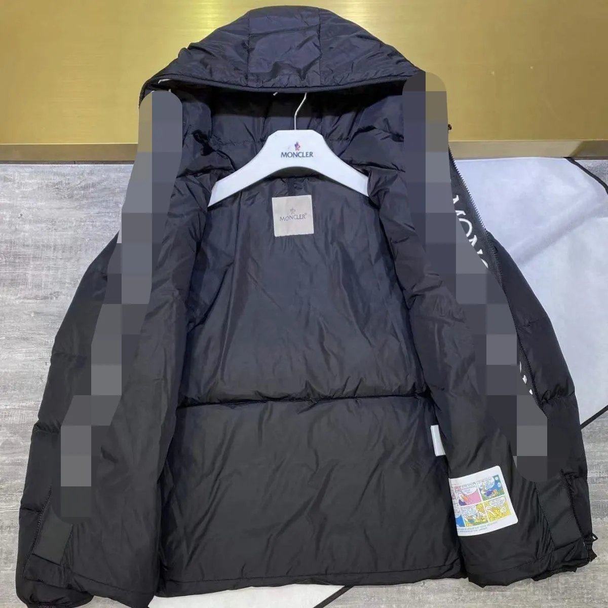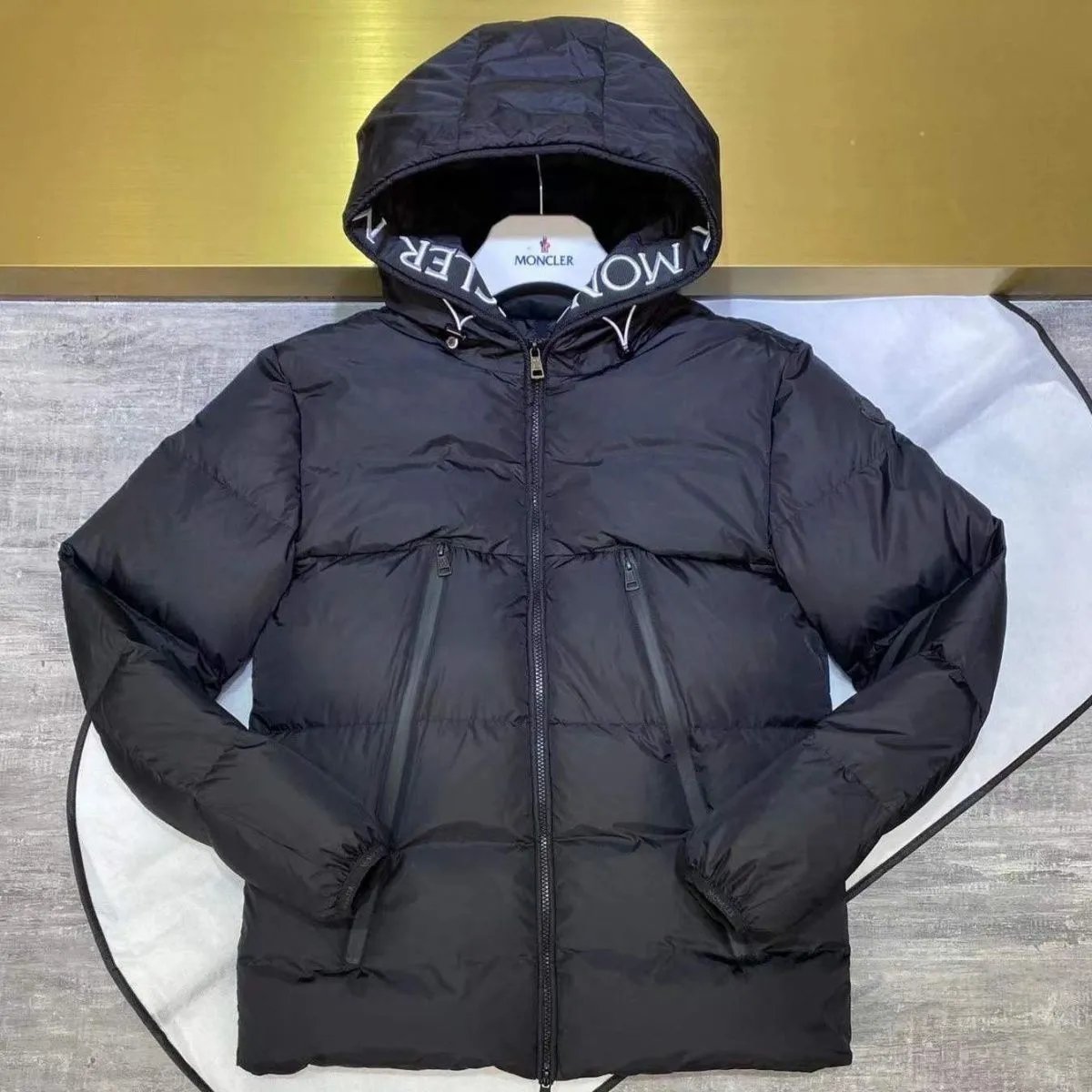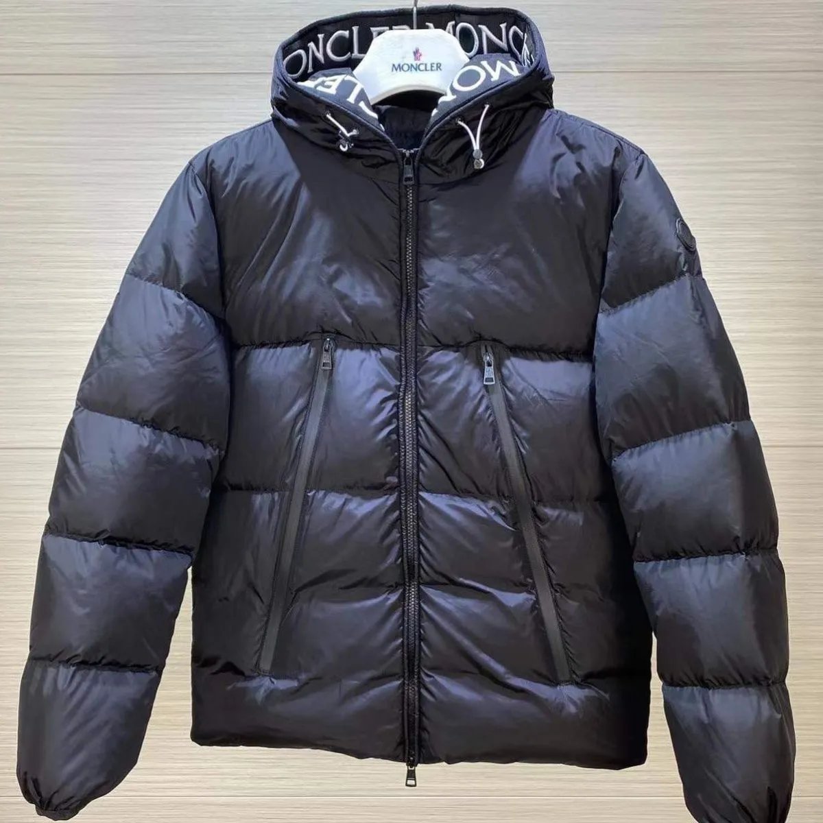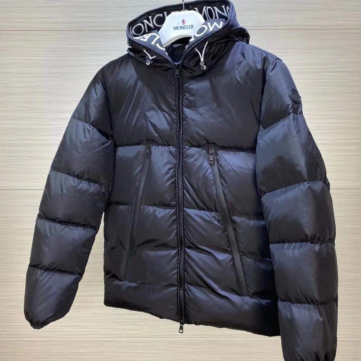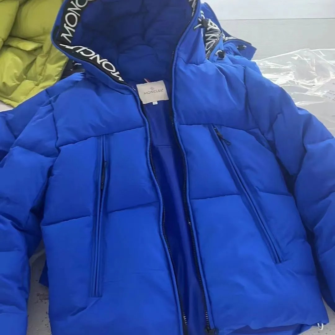Stylish Moncler blue puffer jacket featuring a bold logo-trimmed hood and premium down insulation. Perfect for cold weather with a sleek, modern design.