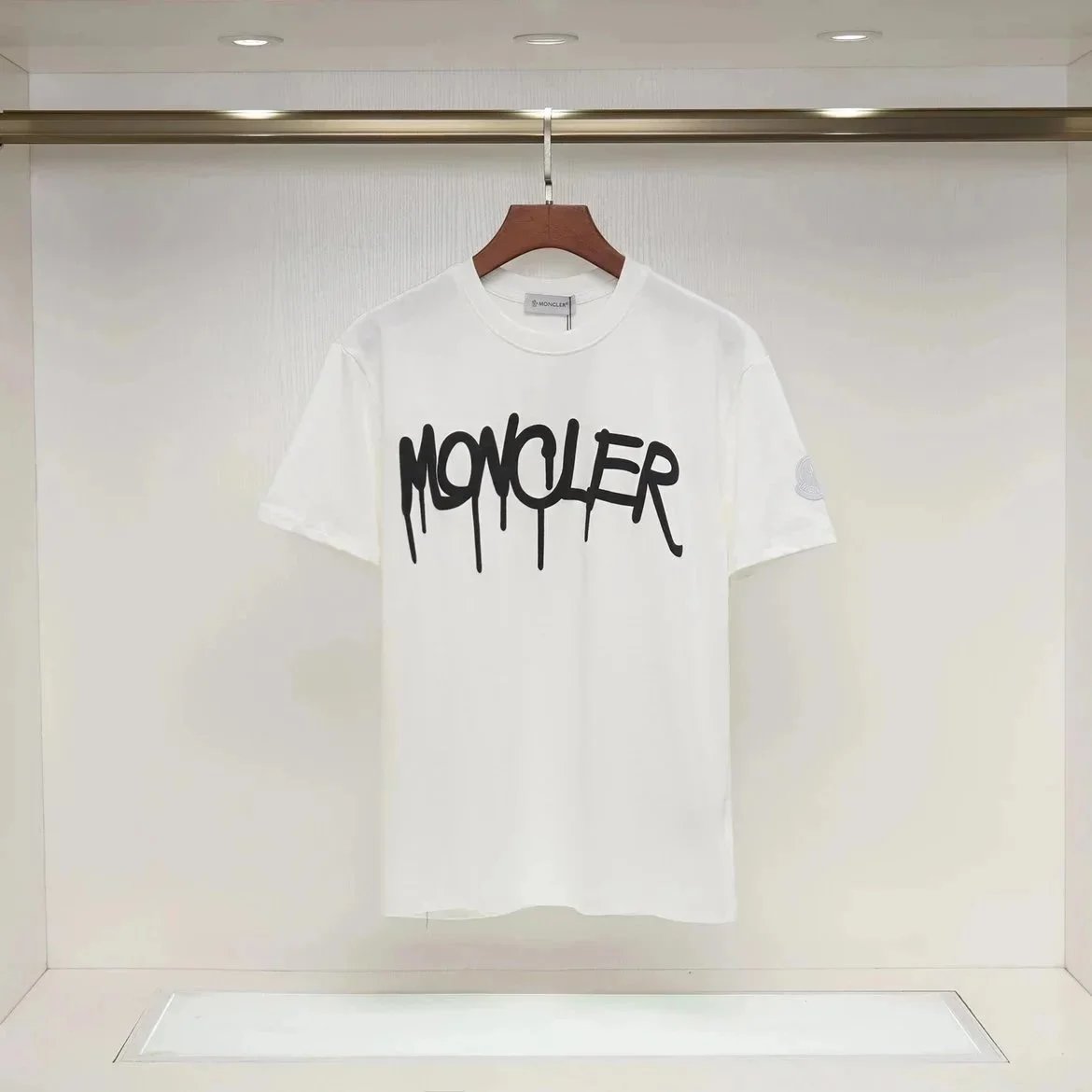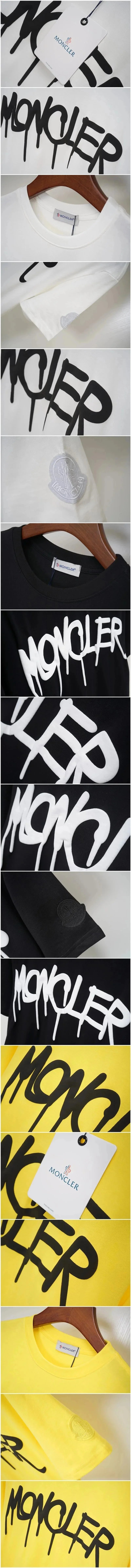 Moncler t-shirts featuring bold graffiti-style logo prints in white, yellow, and black. Designed for casual wear with a distinctive urban aesthetic.